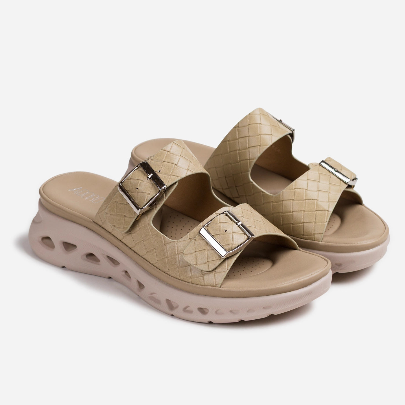 Artisanal craftsmanship meets modern comfort in these woven platform slide sandals. Featuring interlaced basketweave straps with polished silver tone buckle accents, they showcase textural detail and contemporary appeal. The cushioned footbed provides lasting comfort, while the sculpted platform sole with ventilation cutouts offers lightweight elevation and breathability.