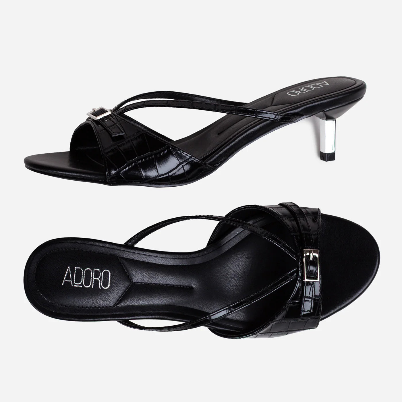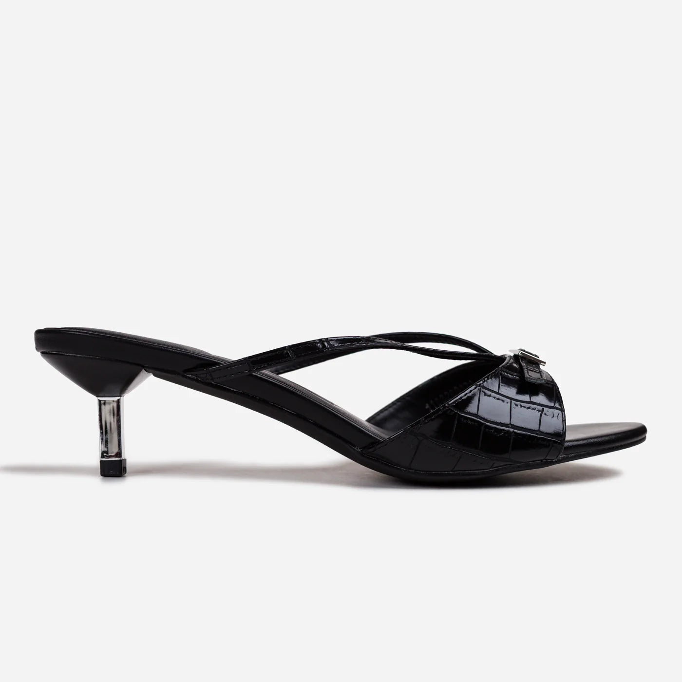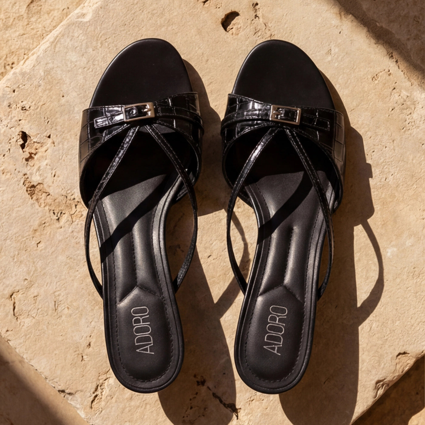 - Design: Crossover silhouette with buckle accents and low kitten heel
