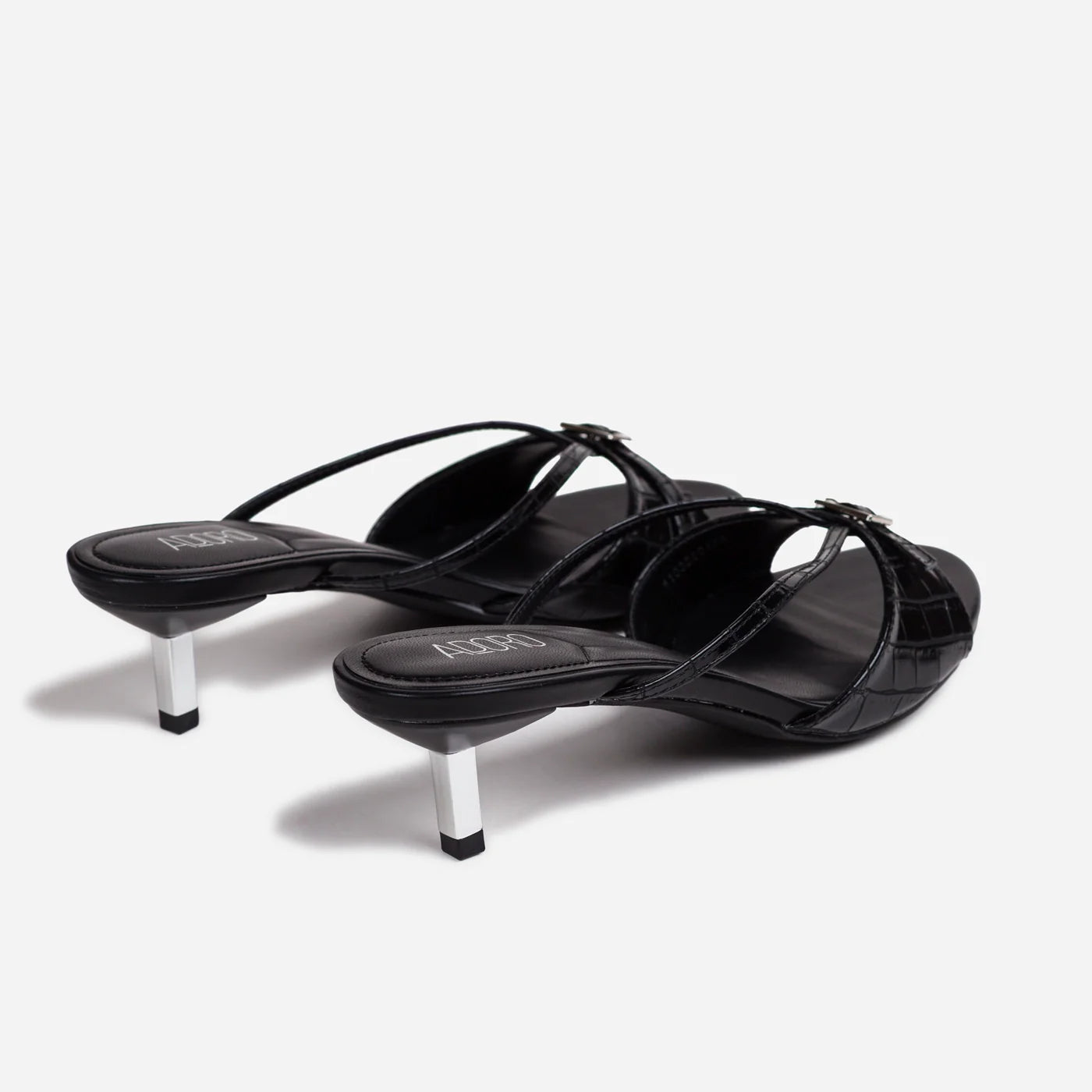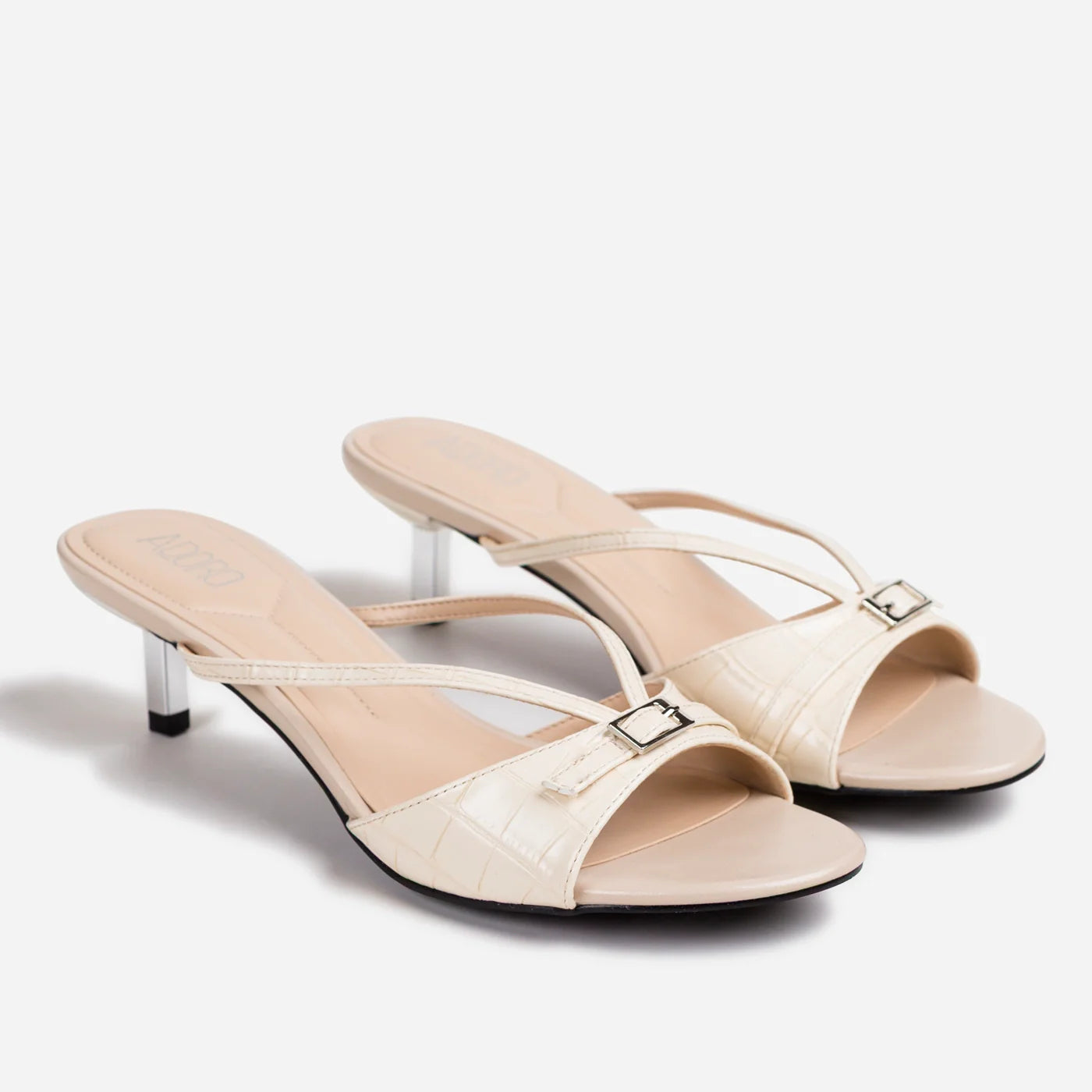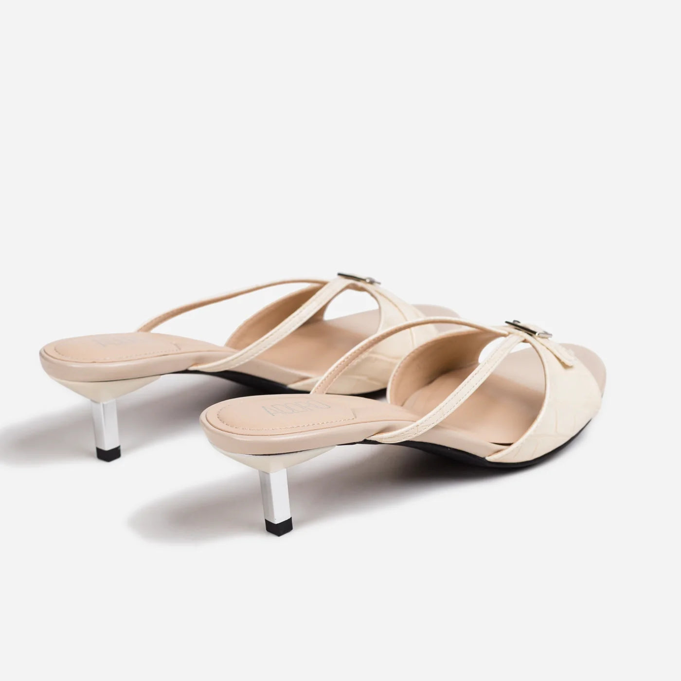 - Design: Crossover silhouette with buckle accents and low kitten heel
