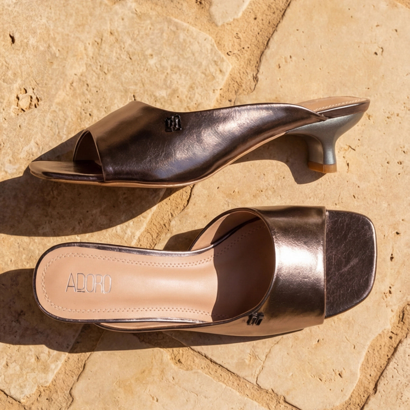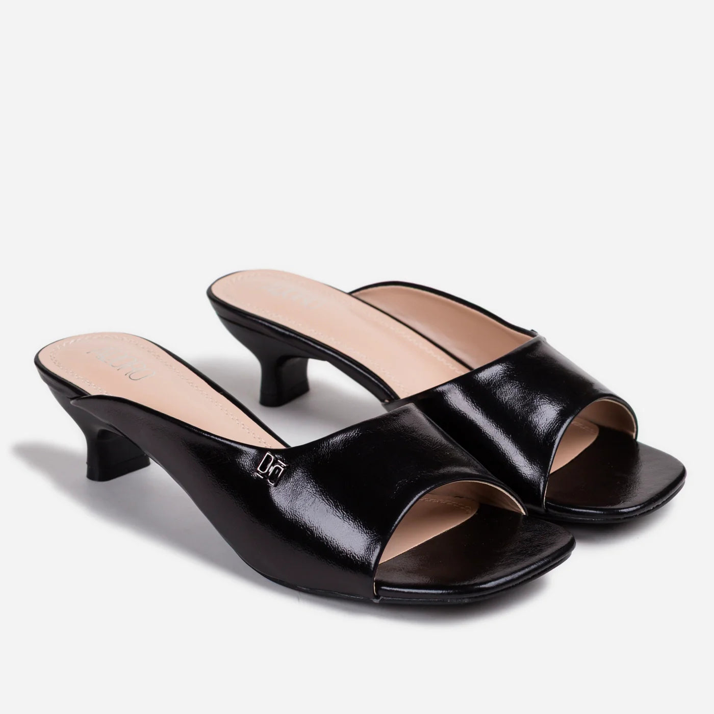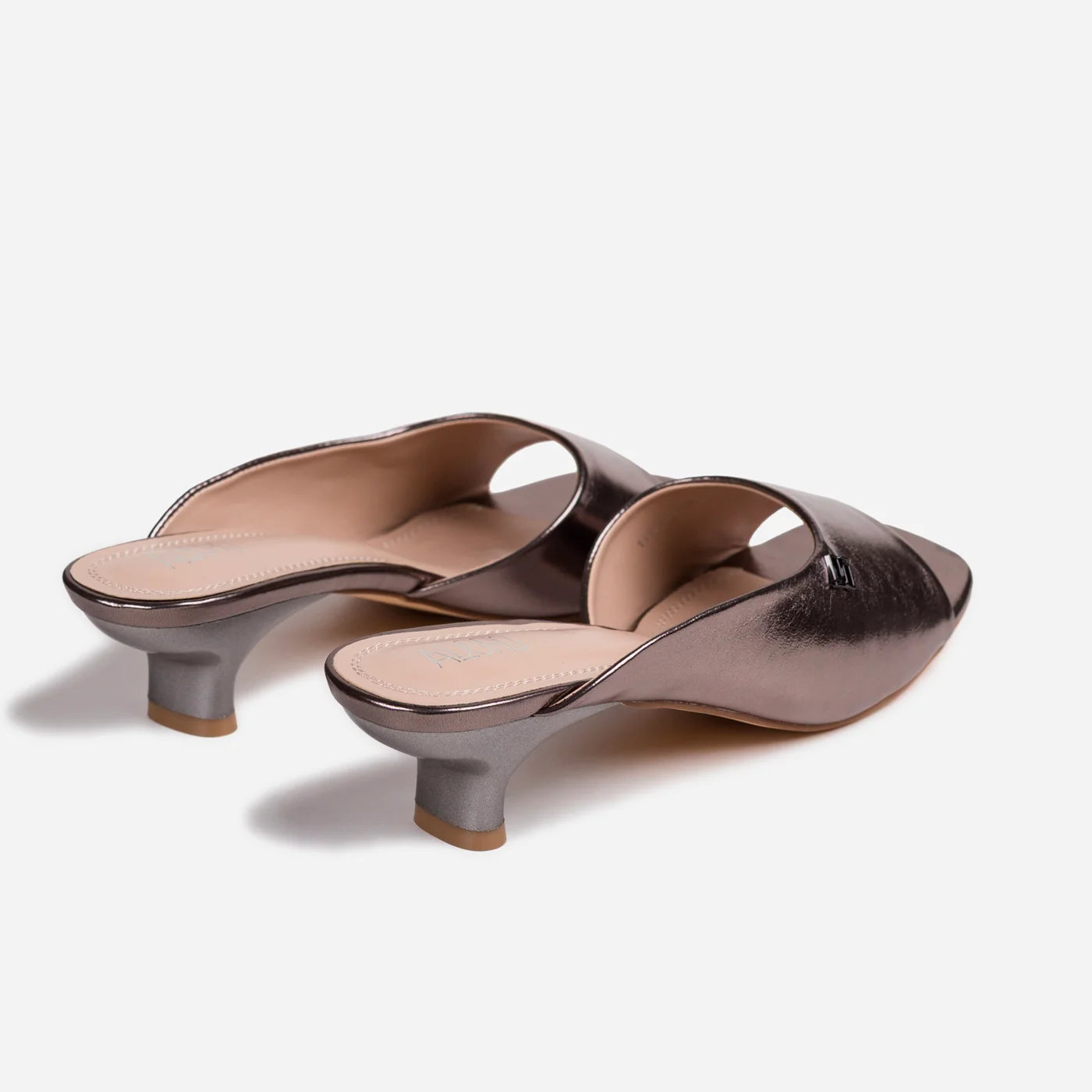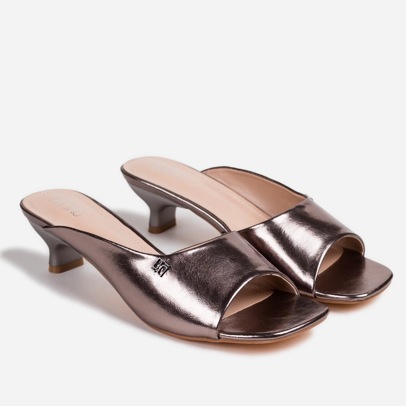 Sophisticated glamour in a sleek kitten heel silhouette. This piece features metallic finish with wide single strap and subtle logo hardware accent, creating modern luxurious appeal. The slip-on design offers effortless wear, while the cushioned footbed ensures all-day comfort. Low kitten heel provides subtle elevation with stability and refined walkability.