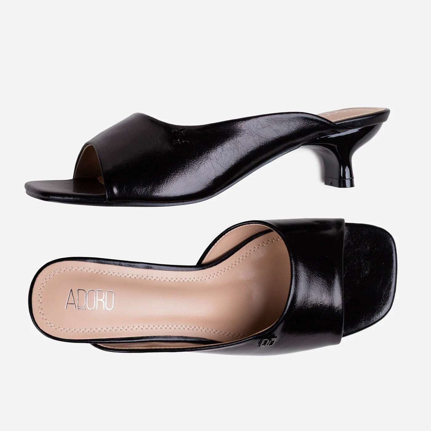 - Design: Wide strap silhouette with logo hardware accent and low kitten heel