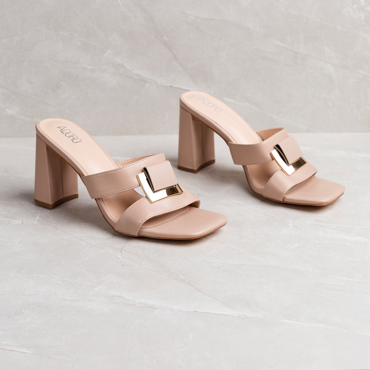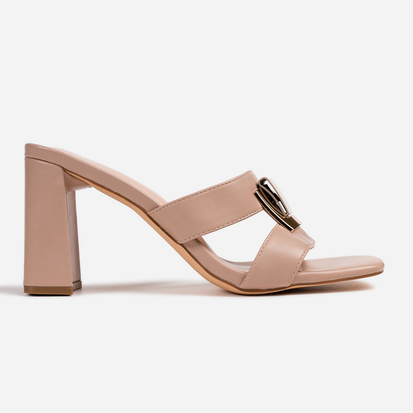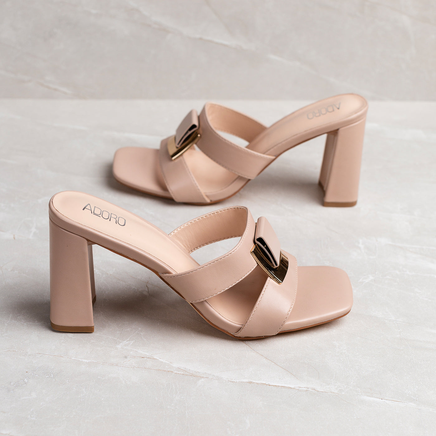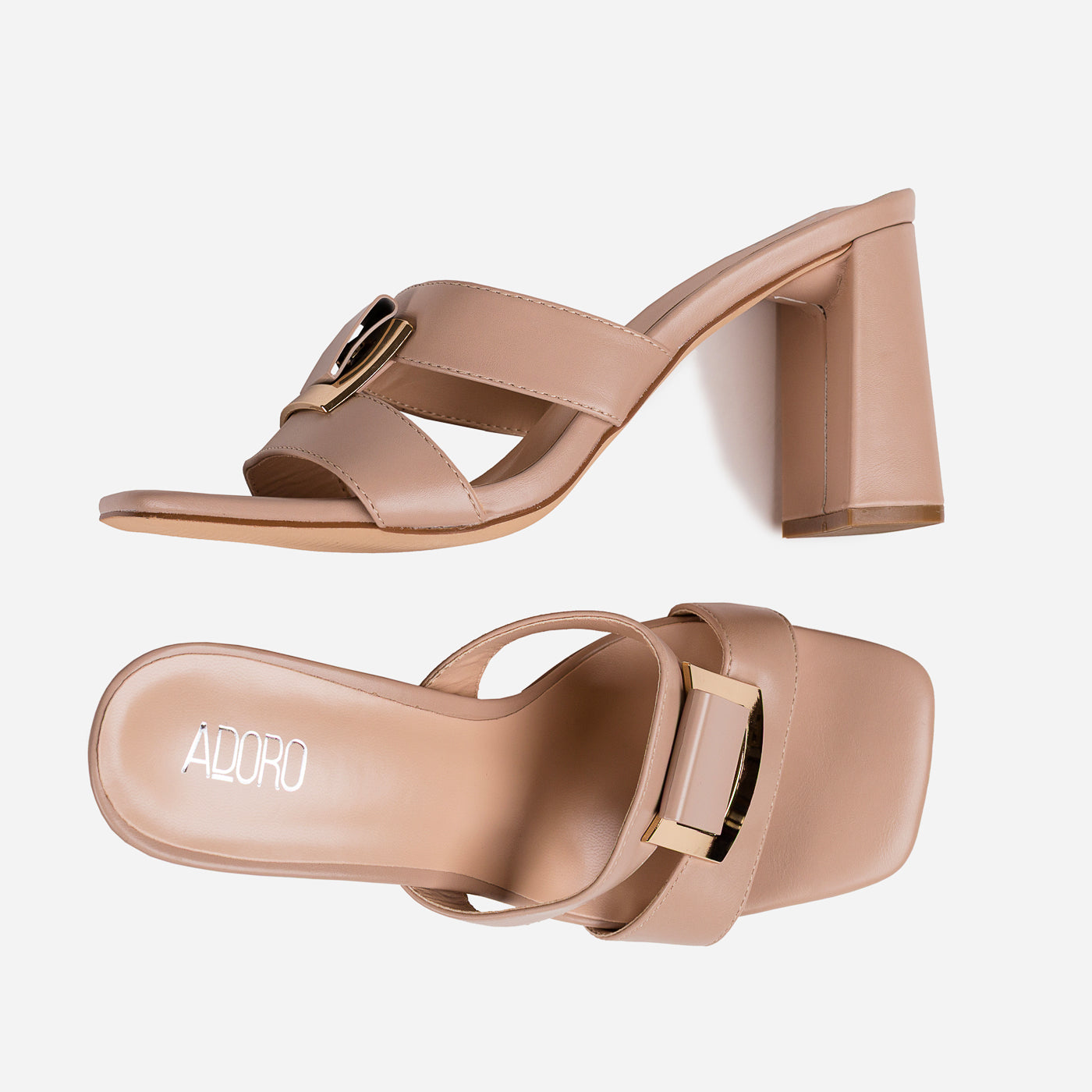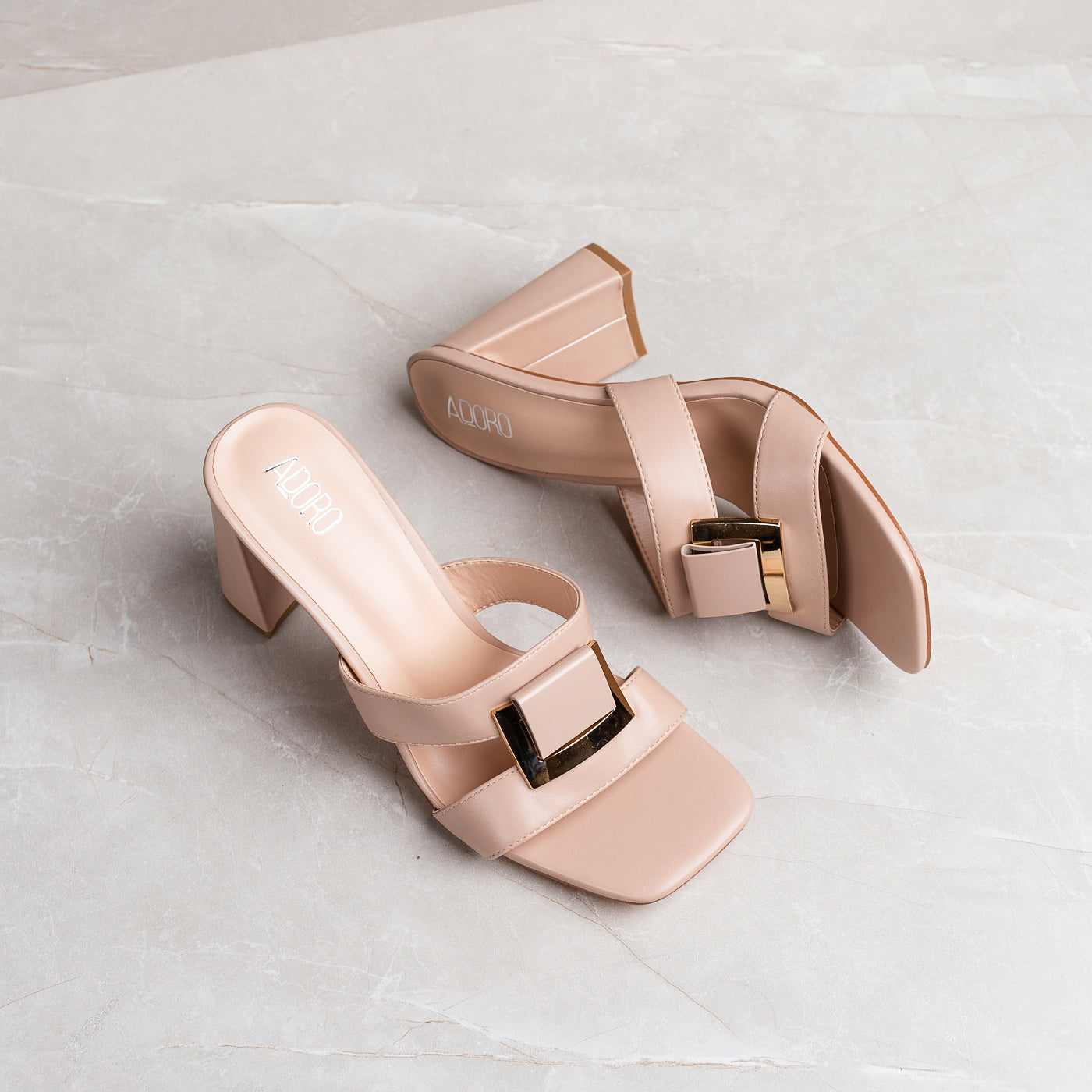 These heels whisper luxury through their refined minimalism and creamy nude finish a hue chosen for women who prefer grace over noise and confidence over complication. The dual-strap design hugs the foot with quiet assurance, while the bold metallic buckle adds a touch of polished distinction. Balanced on a sleek block heel, they offer height with comfort, power with ease.