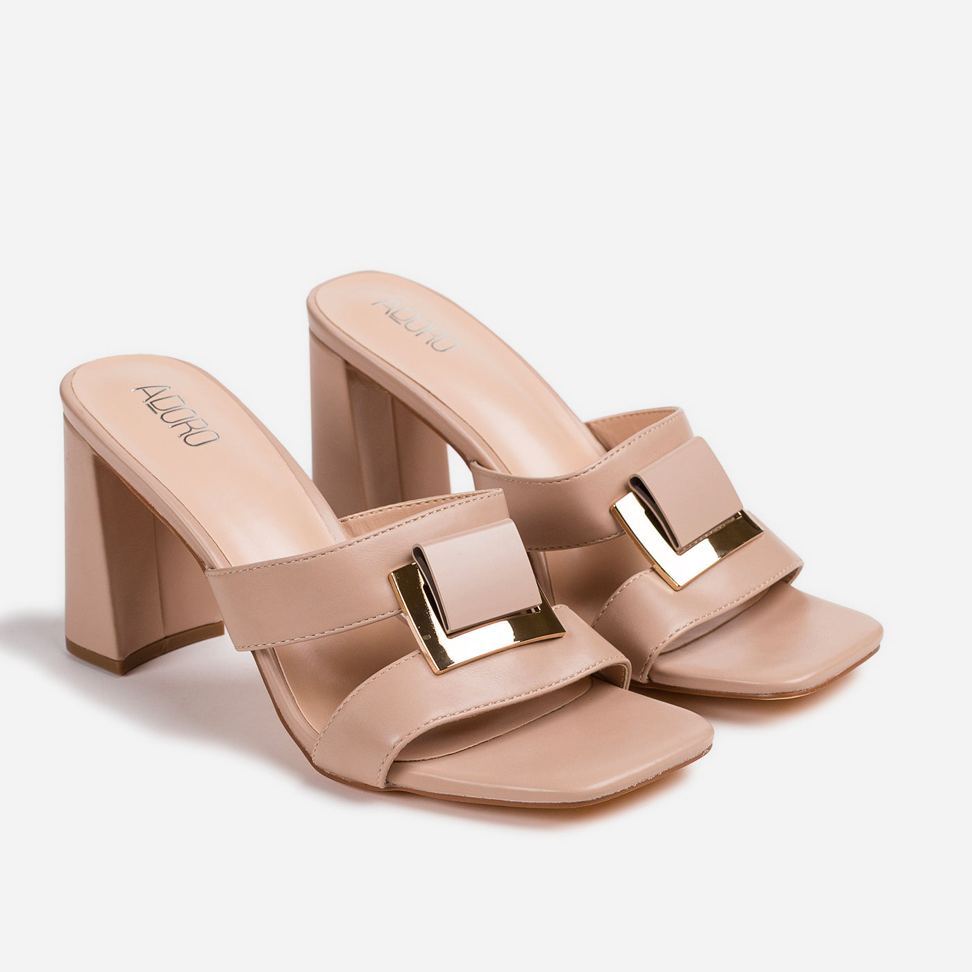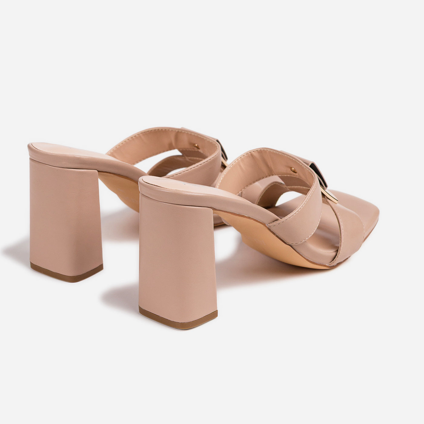 These heels whisper elegance through every line sculpted in a soft nude tone that melts seamlessly into any ensemble. The squared toe and clean, architectural straps offer a contemporary edge, while the polished gold buckle adds a quiet note of opulence.