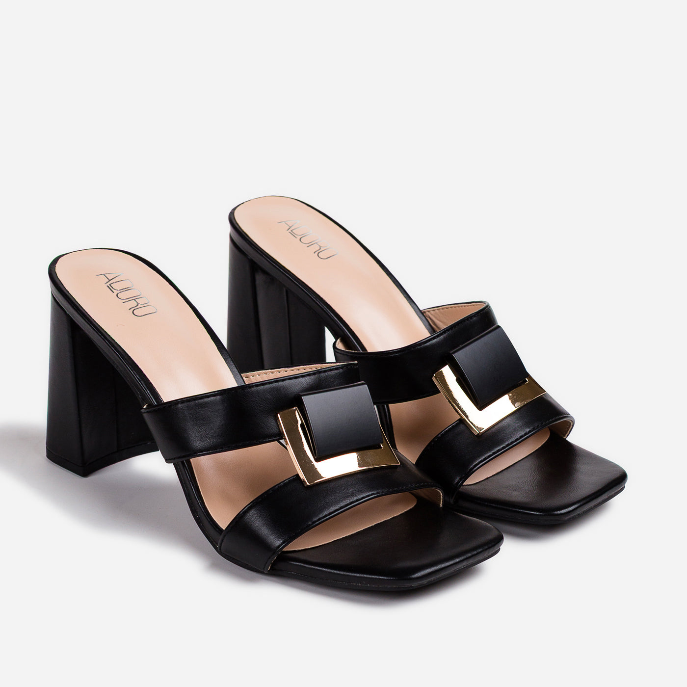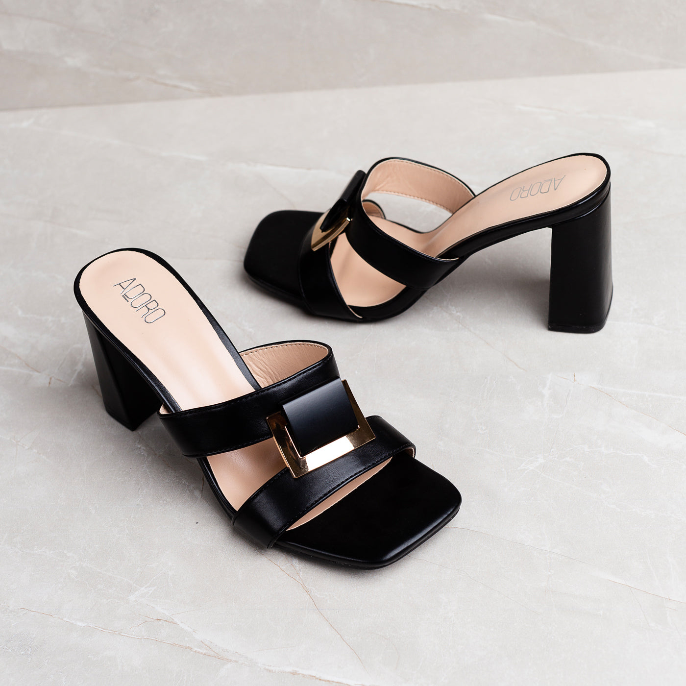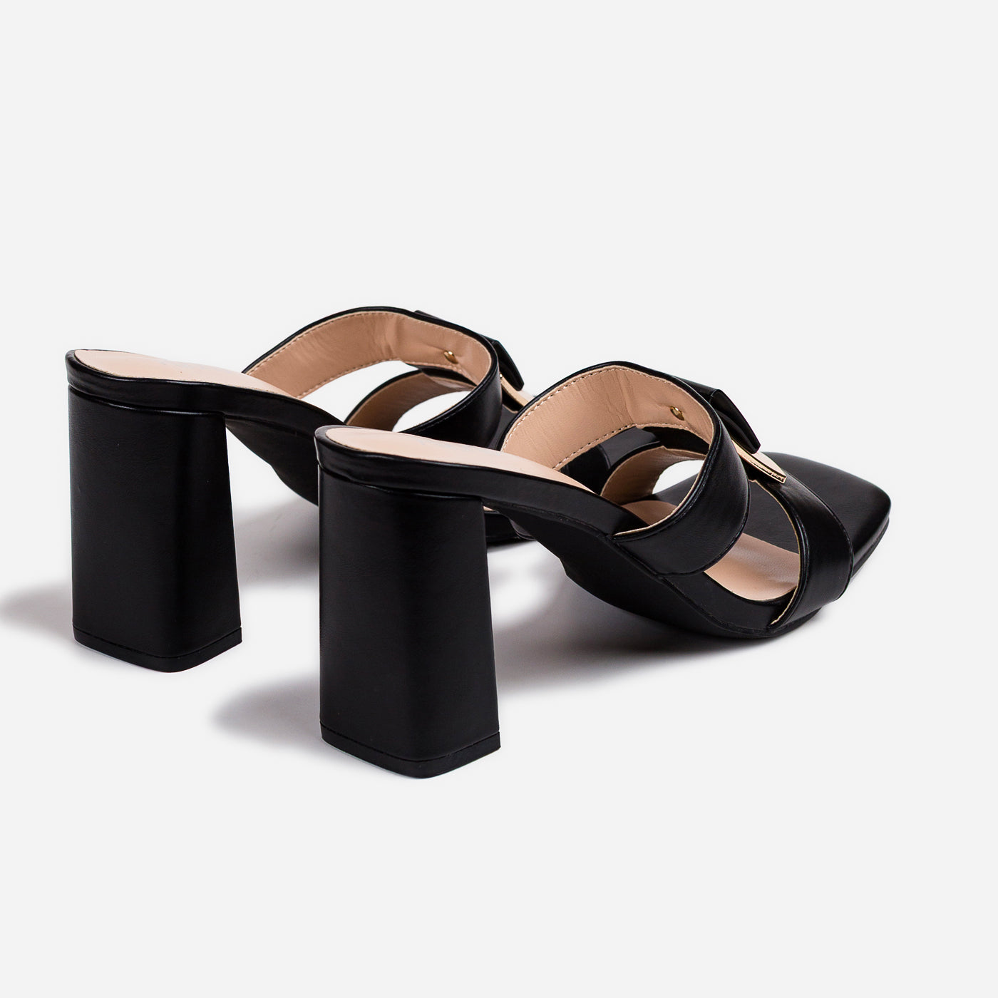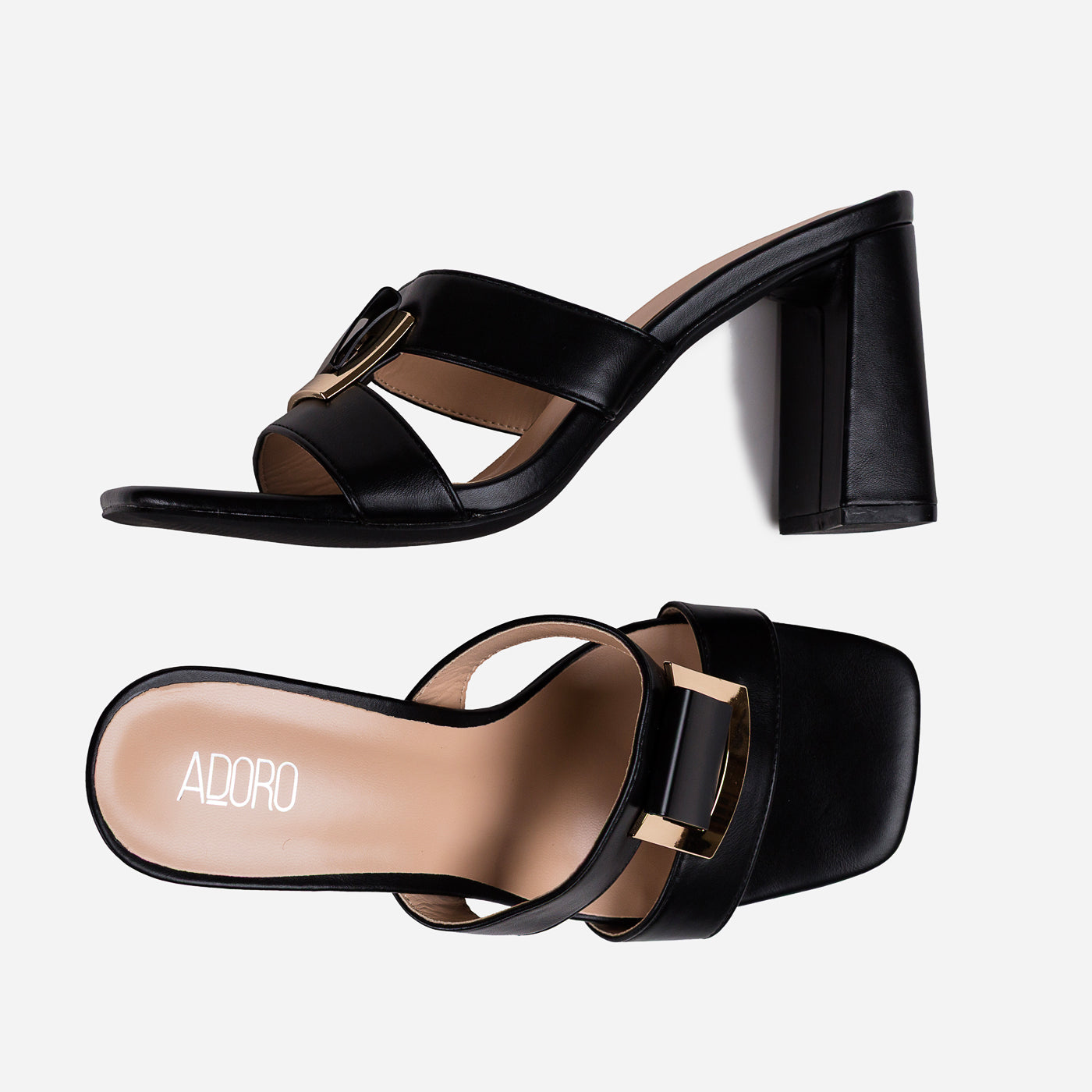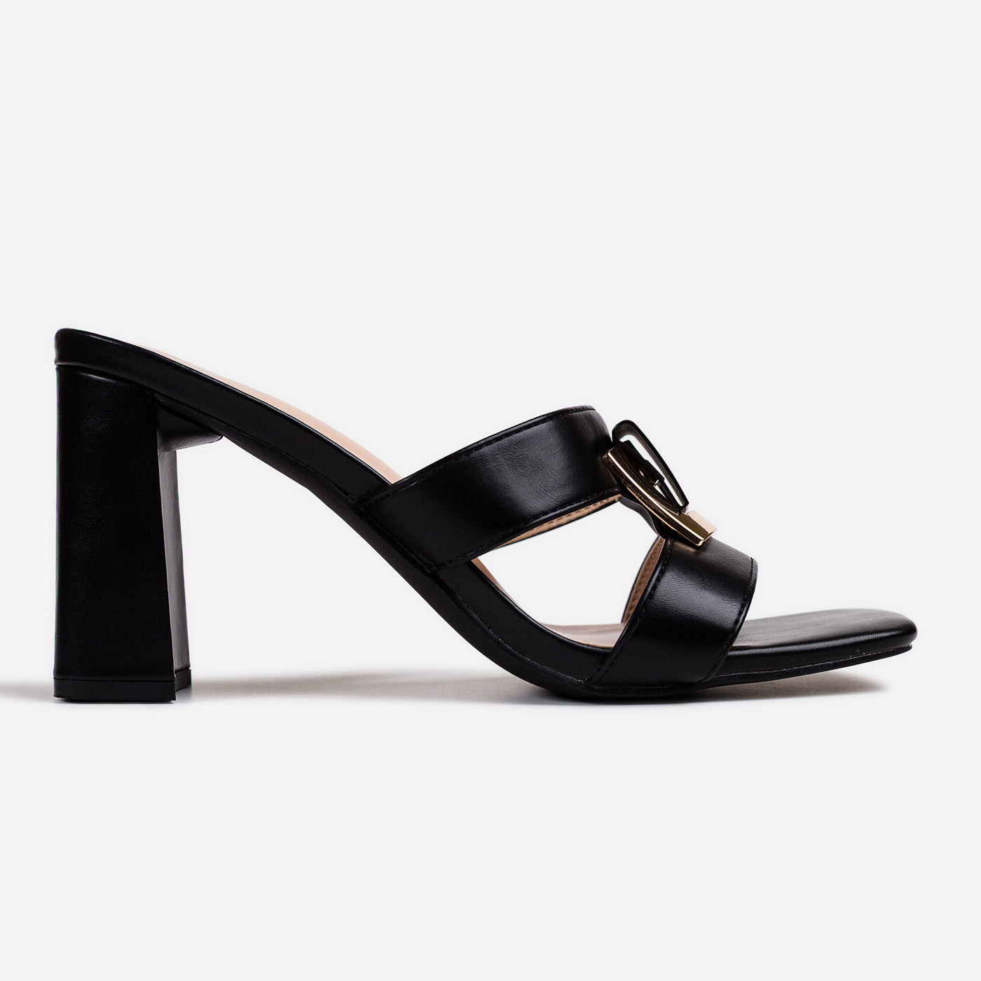 Turn heads with these Bold Classic block-heel slides, designed for effortless style and all-day confidence. The sleek black finish paired with a striking metallic buckle detail adds a touch of luxe, making them perfect for both chic casual looks and elegant evening outfits.