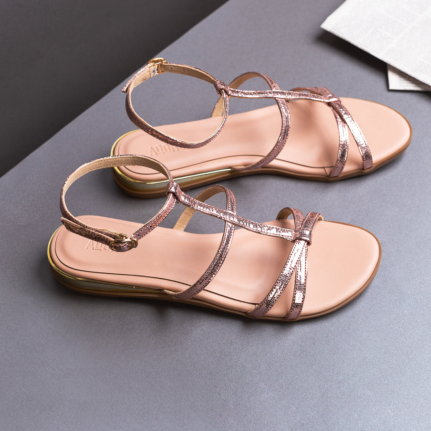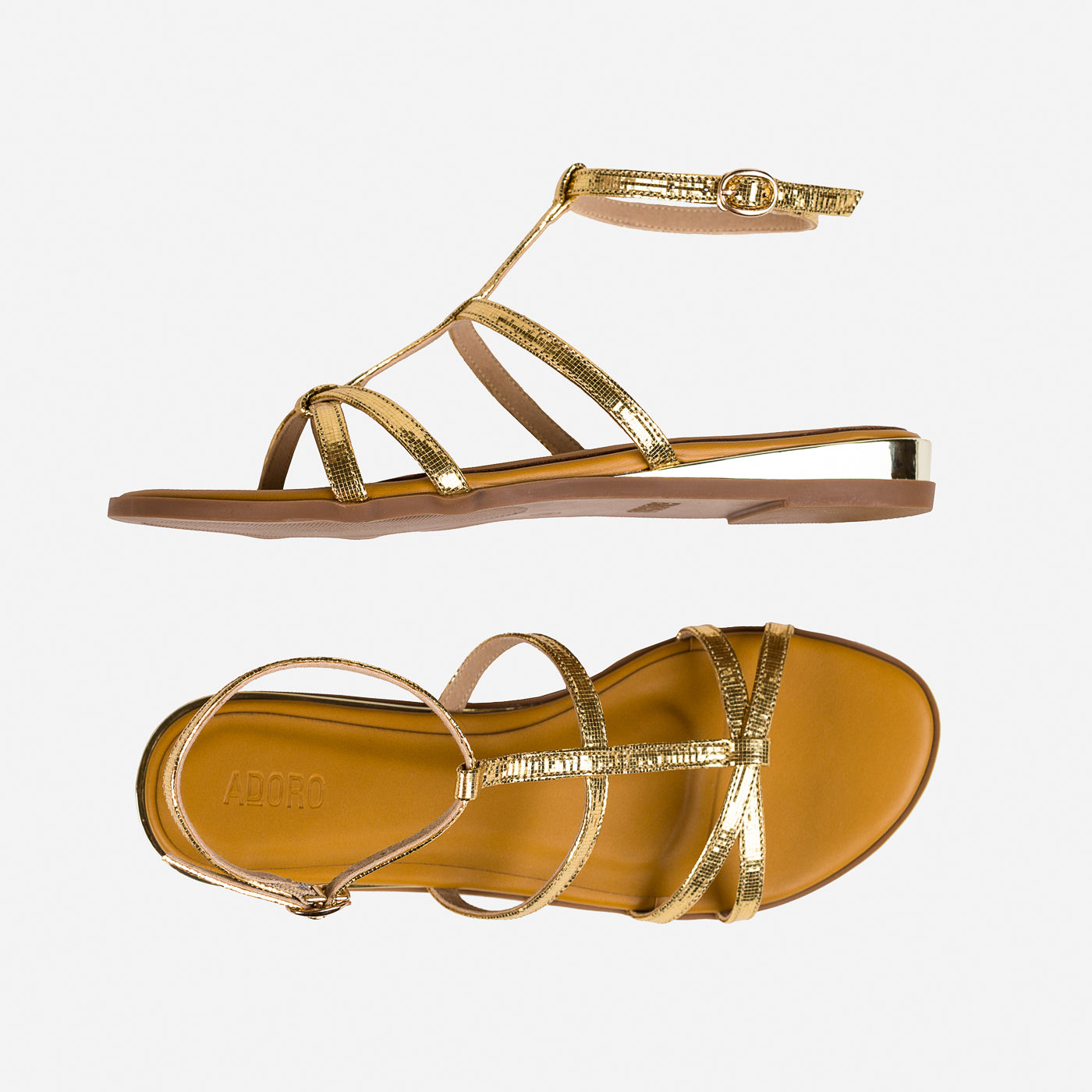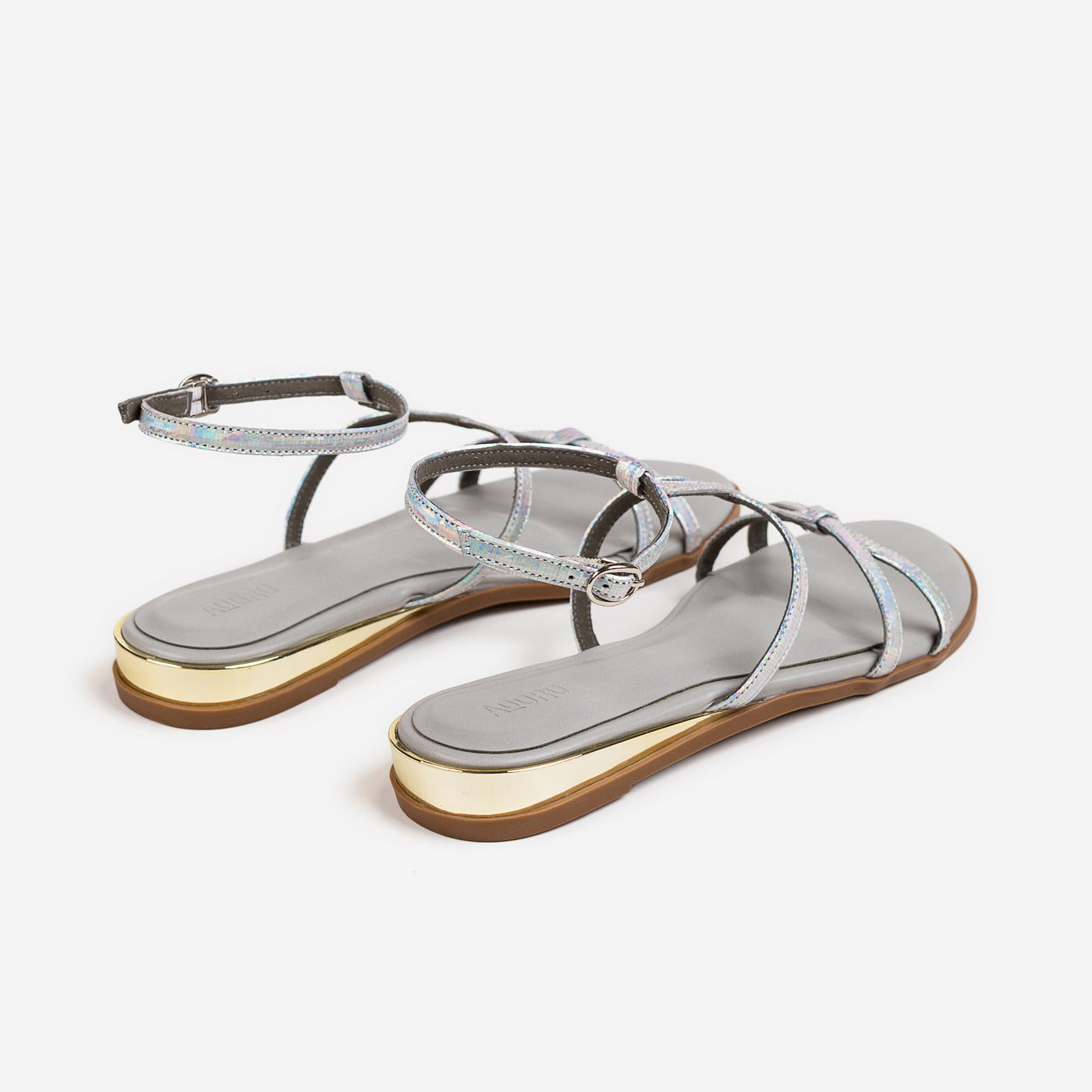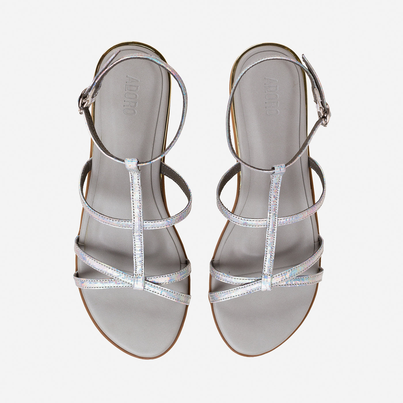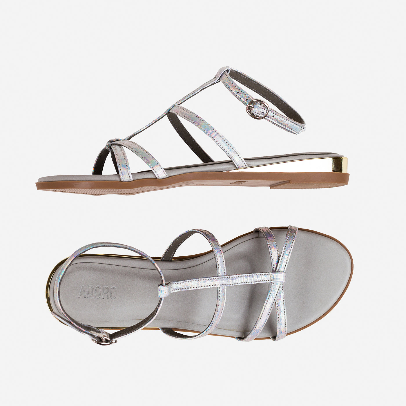 Adoro "Serenity" sandal offers minimal elegance. Its high-sheen synthetic upper with iridescent metallic finish and slender straps provide graceful style. Featuring a round toe, smooth PU lining, cushioned footbed, and adjustable ankle buckle, this flat sandal ensures comfortable poise for any occasion.