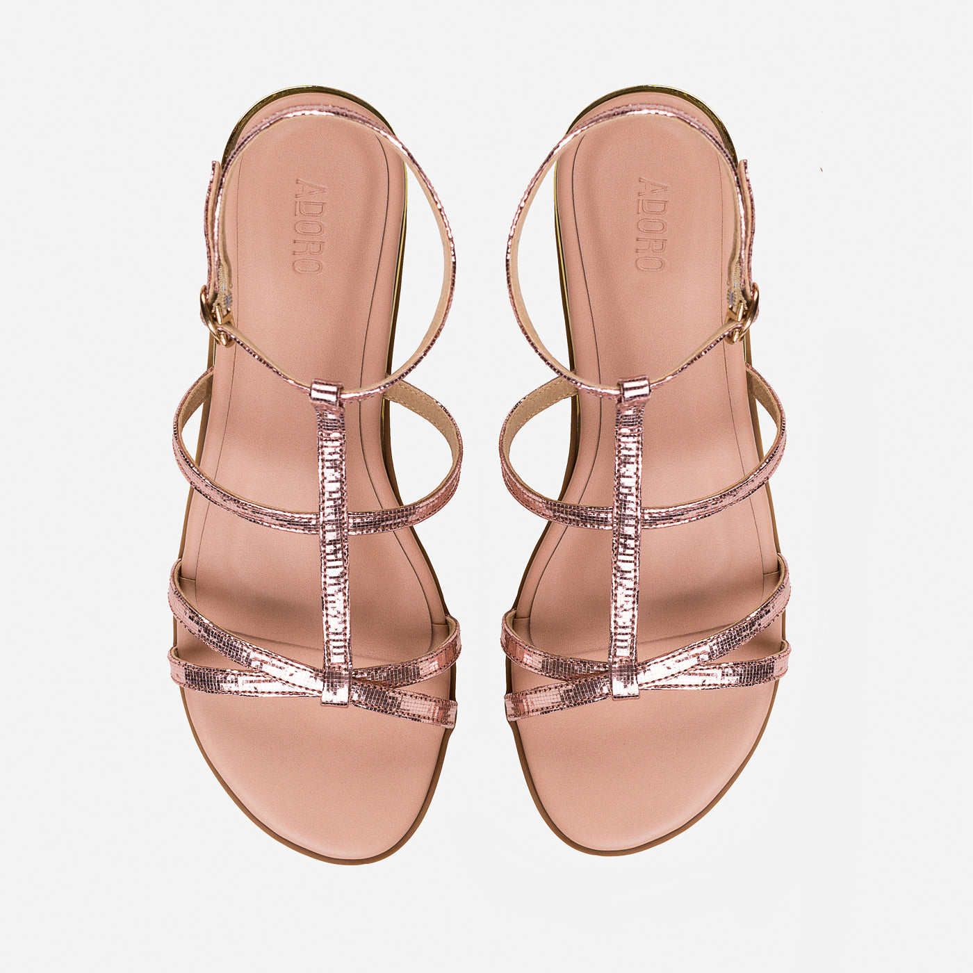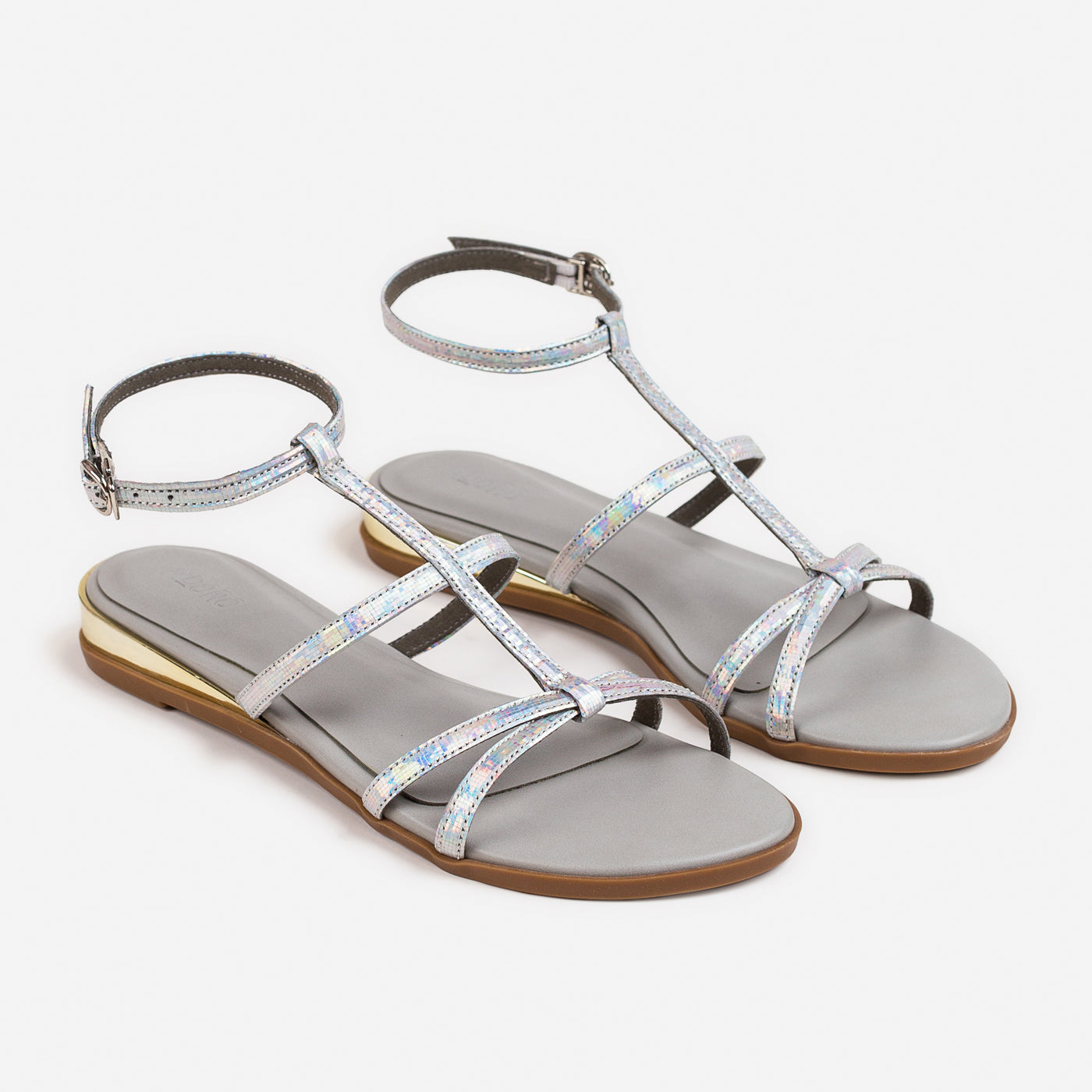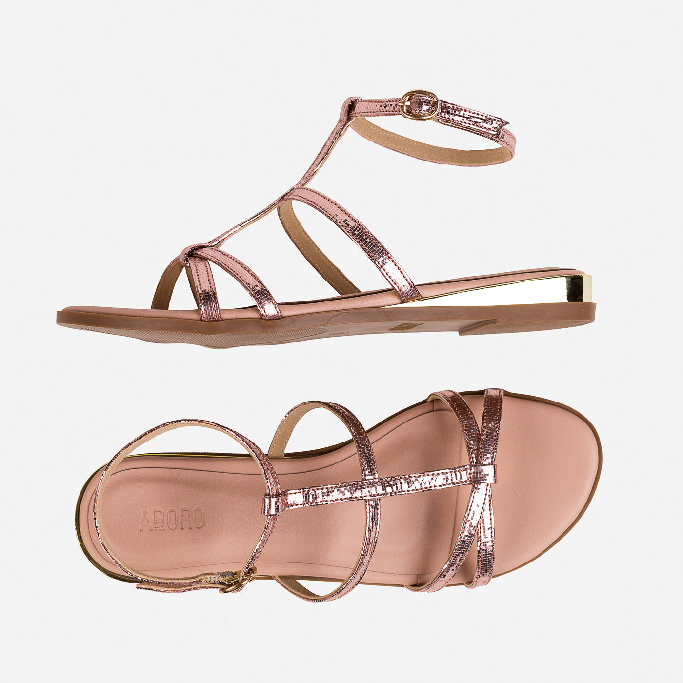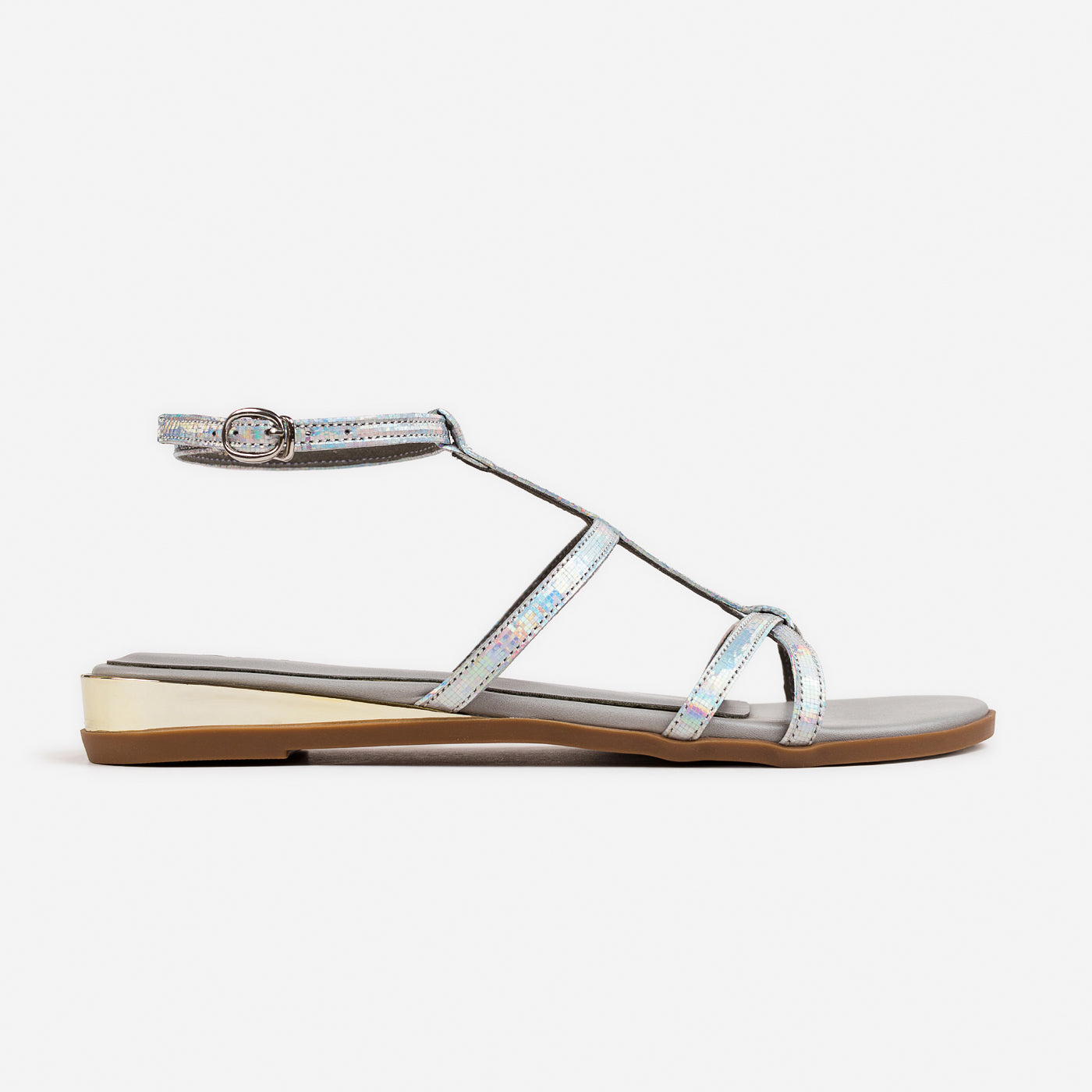 Adoro "Serenity" sandal offers minimal elegance. Its high-sheen synthetic upper with iridescent metallic finish and slender straps provide graceful style. Featuring a round toe, smooth PU lining, cushioned footbed, and adjustable ankle buckle, this flat sandal ensures comfortable poise for any occasion.