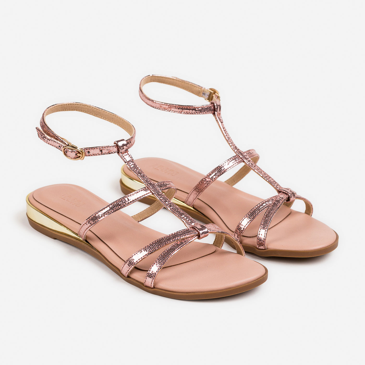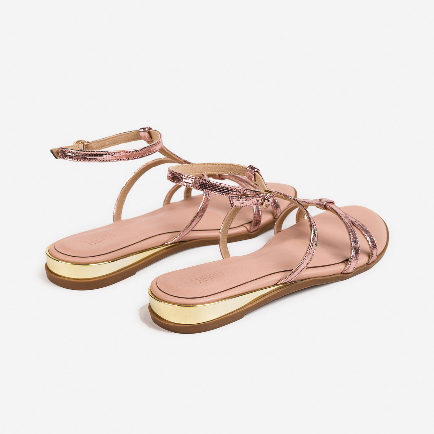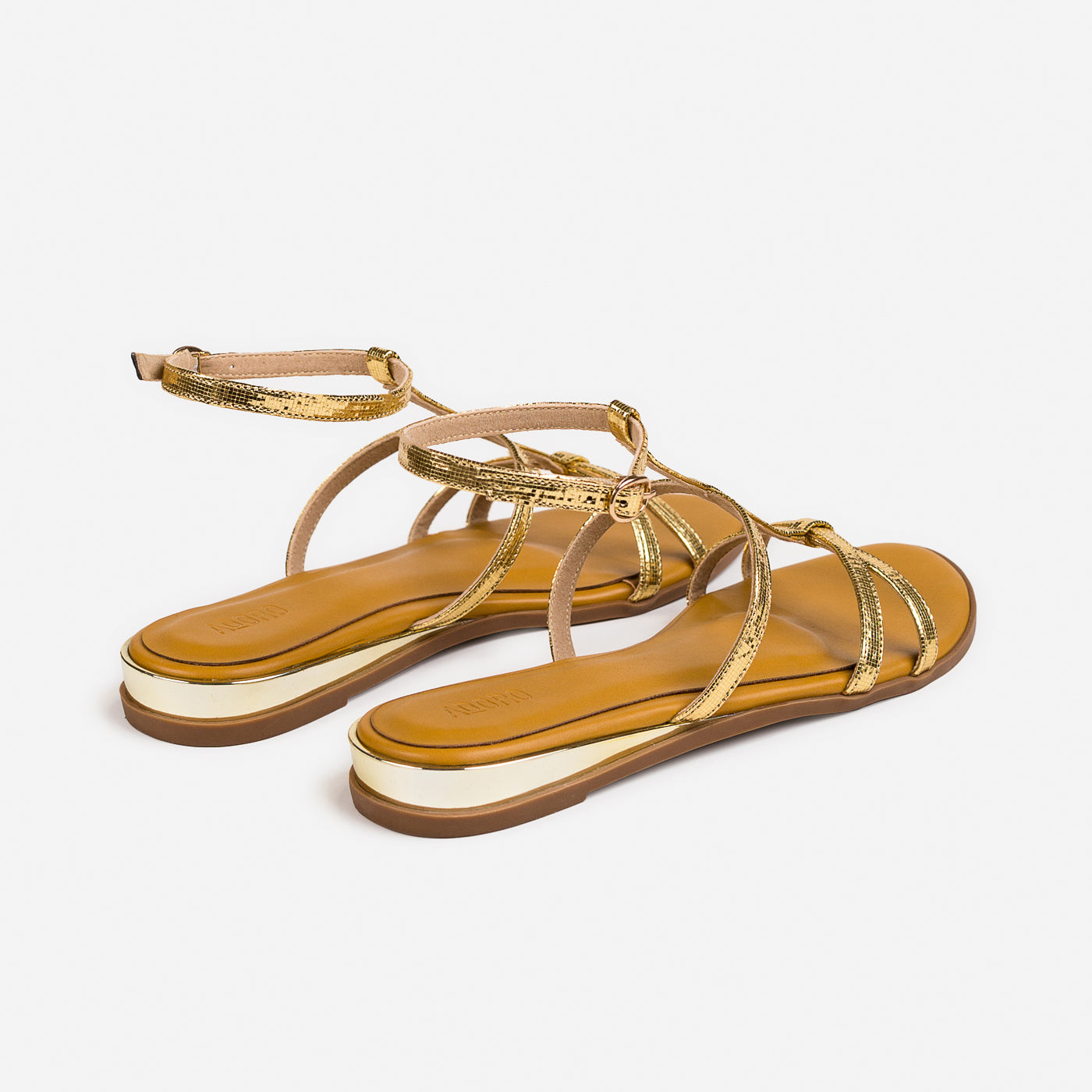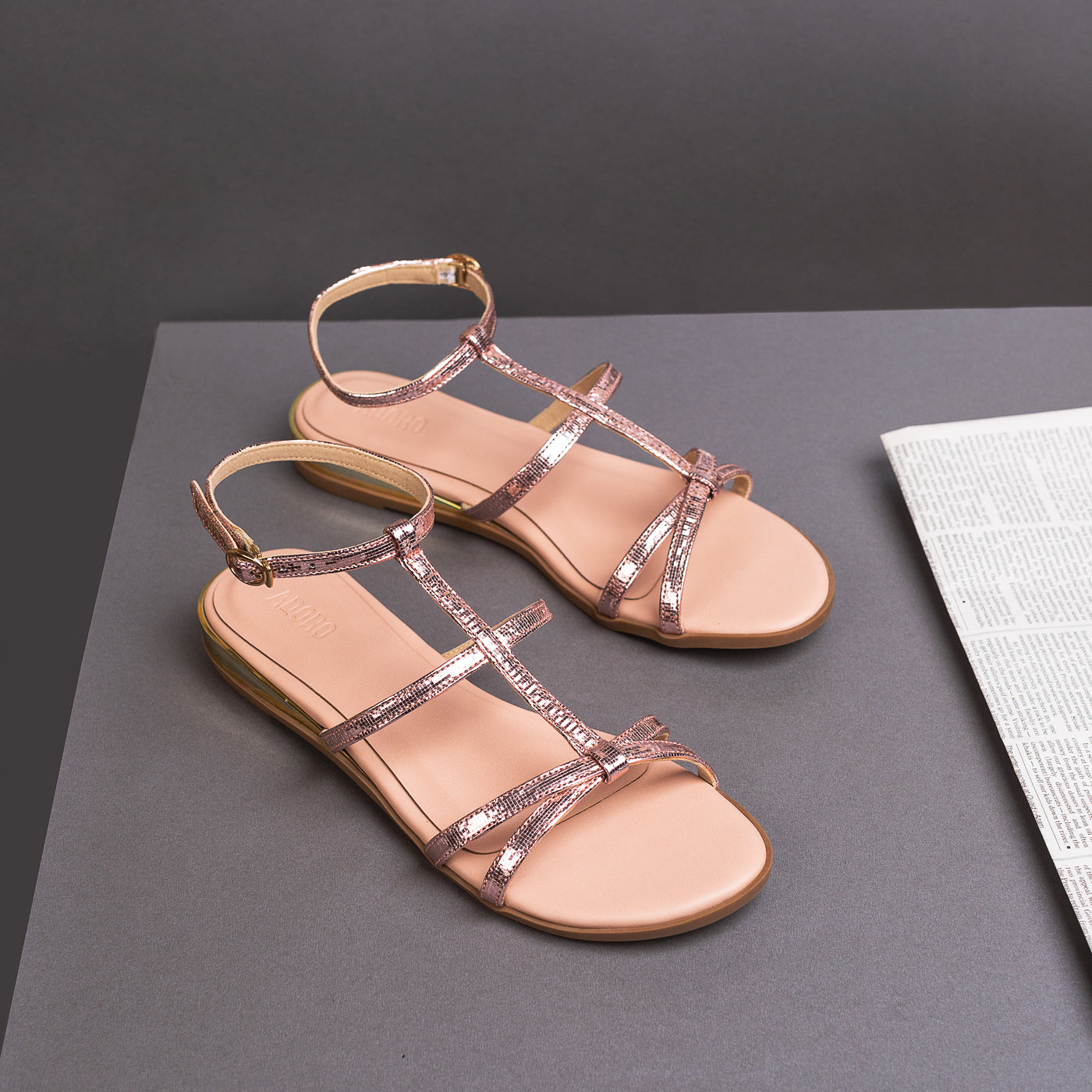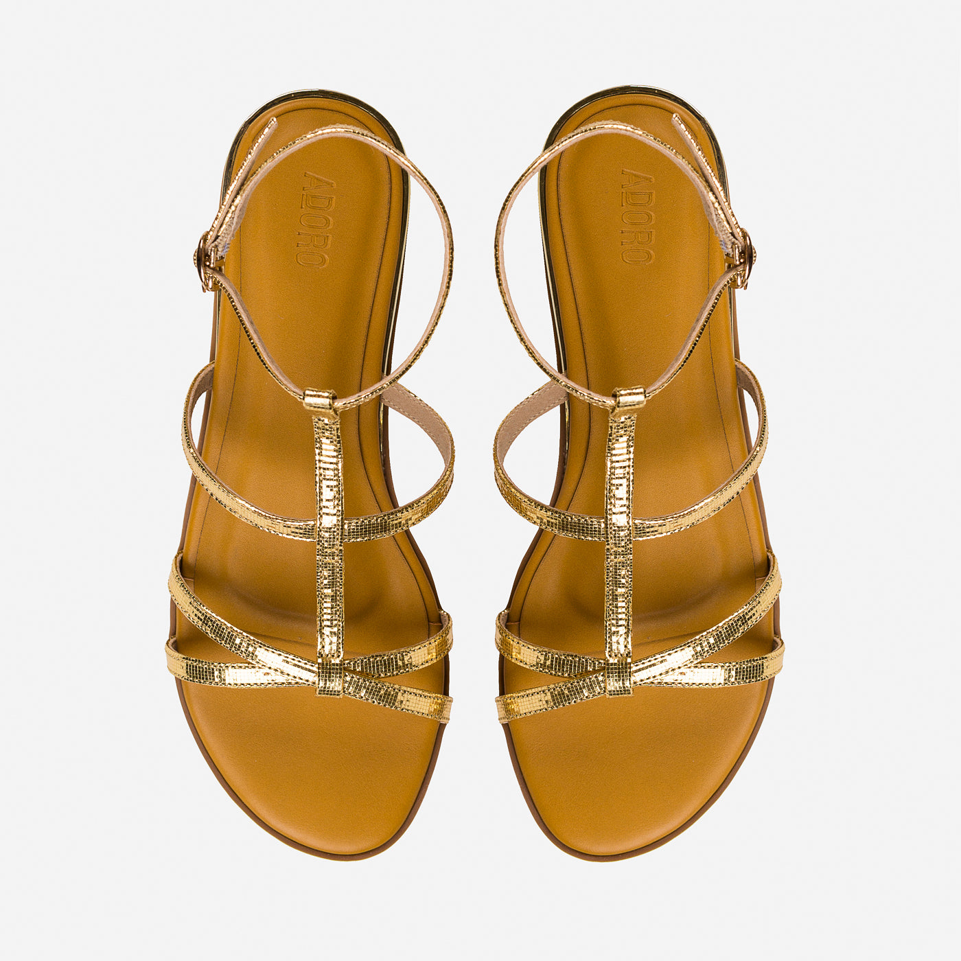 Adoro "Serenity" sandal offers minimal elegance. Its high-sheen synthetic upper with iridescent metallic finish and slender straps provide graceful style. Featuring a round toe, smooth PU lining, cushioned footbed, and adjustable ankle buckle, this flat sandal ensures comfortable poise for any occasion.