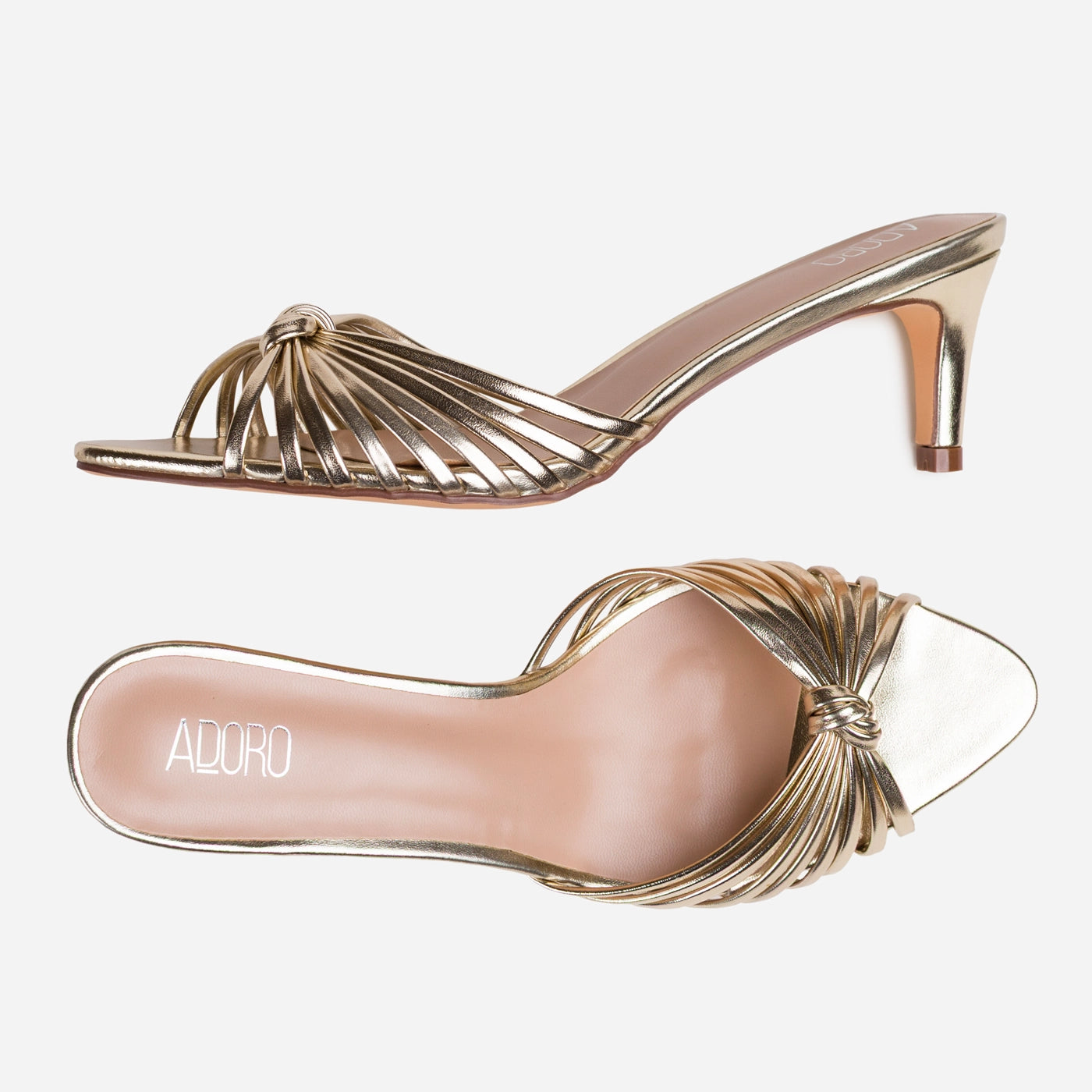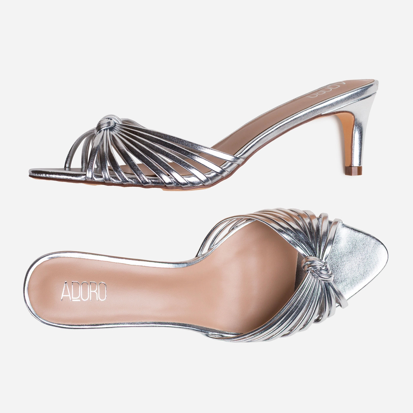 Glamorous sophistication in a sleek mule silhouette. These kitten heel slides feature radiating metallic straps gathered into an elegant knotted detail at the toe, creating dimensional visual interest. The slip on design offers effortless wear, while the slender kitten heel provides graceful elevation. Cushioned footbed ensures comfort through extended wear.