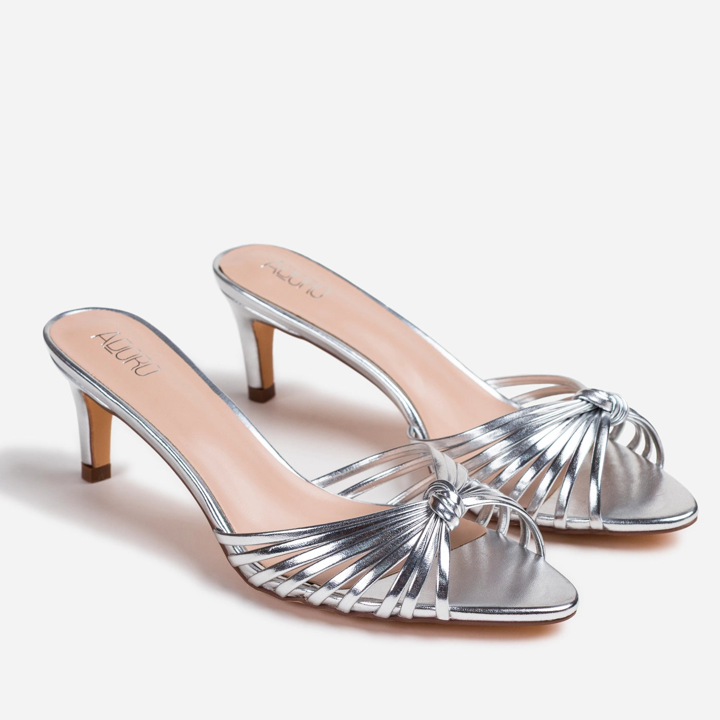 - Design: Slip-on mule with knotted toe detail and slender kitten heel