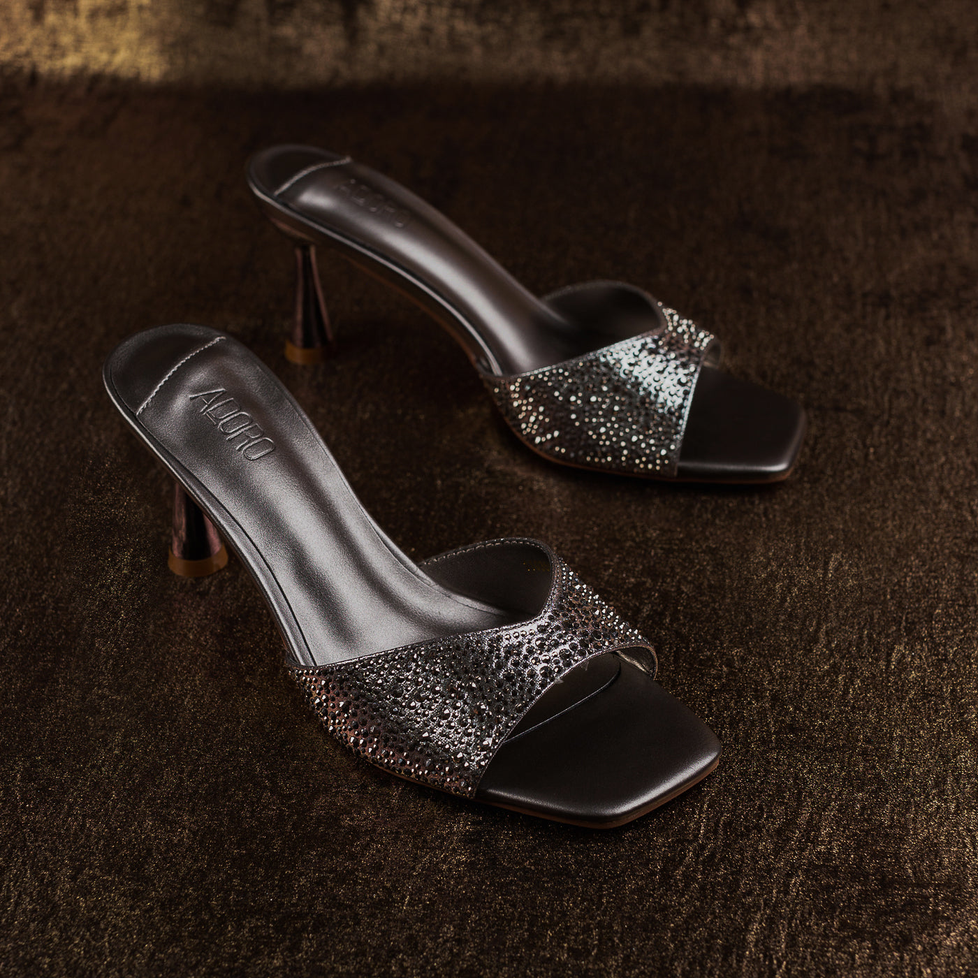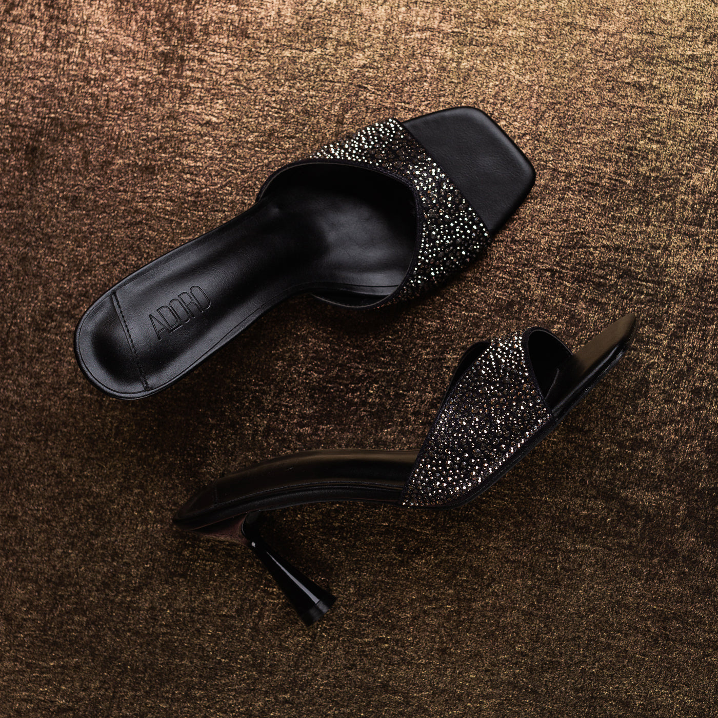 Adoro Noir Crystal Mule adds a touch of captivating sparkle to your look. Featuring a sleek finish and intricate crystal embellishments, these mules create a glamorous look. The unique sculpted heel and comfortable slip-on design offer both style and ease.
