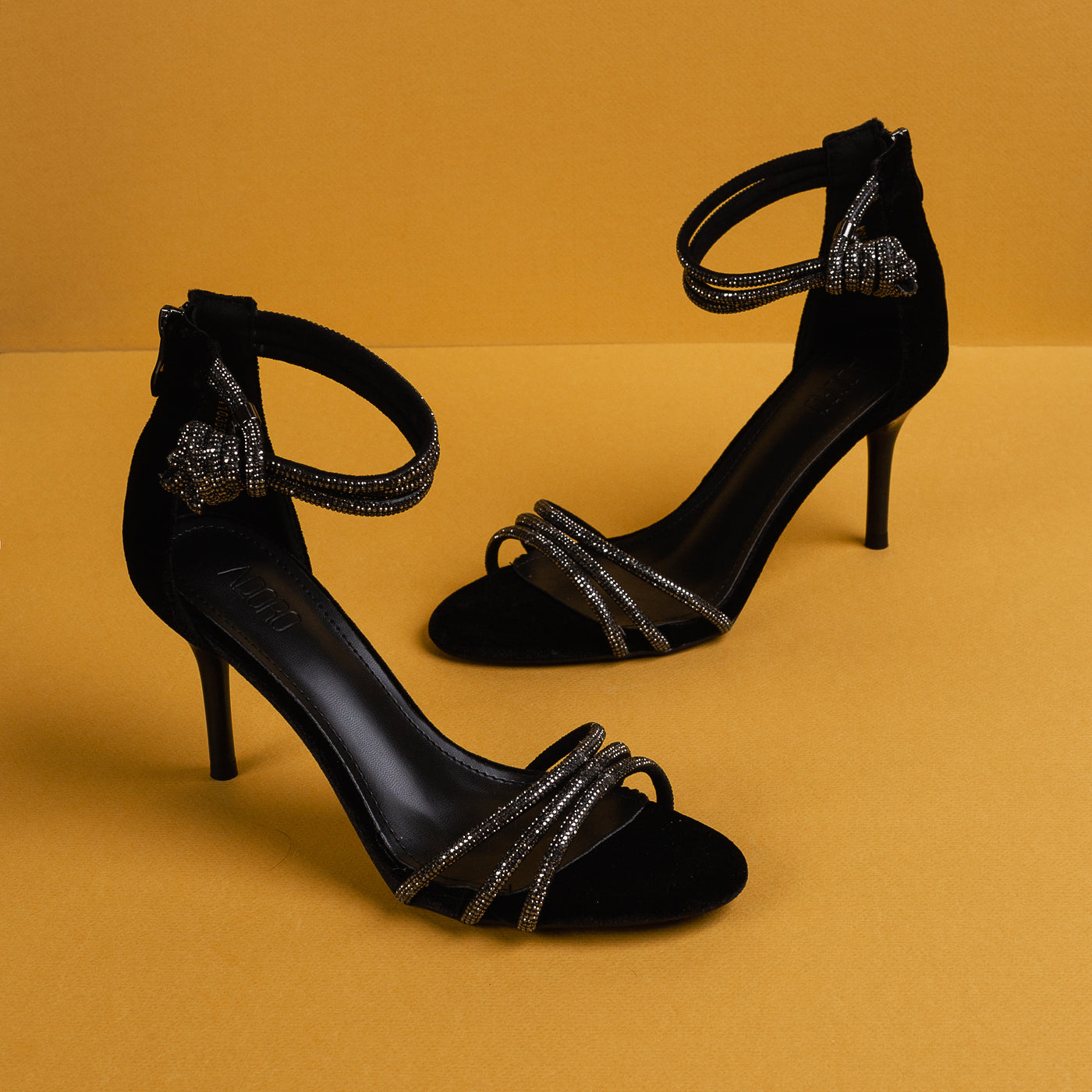 Experience sophisticated sparkle with the Adoro Starlight Rhinestone Sandal. The sleek suede finish and gemstone-like rhinestone embellishments add a touch of glamour. The slender stiletto heel and adjustable ankle strap create a flattering and secure fit, ideal for any special occasion.