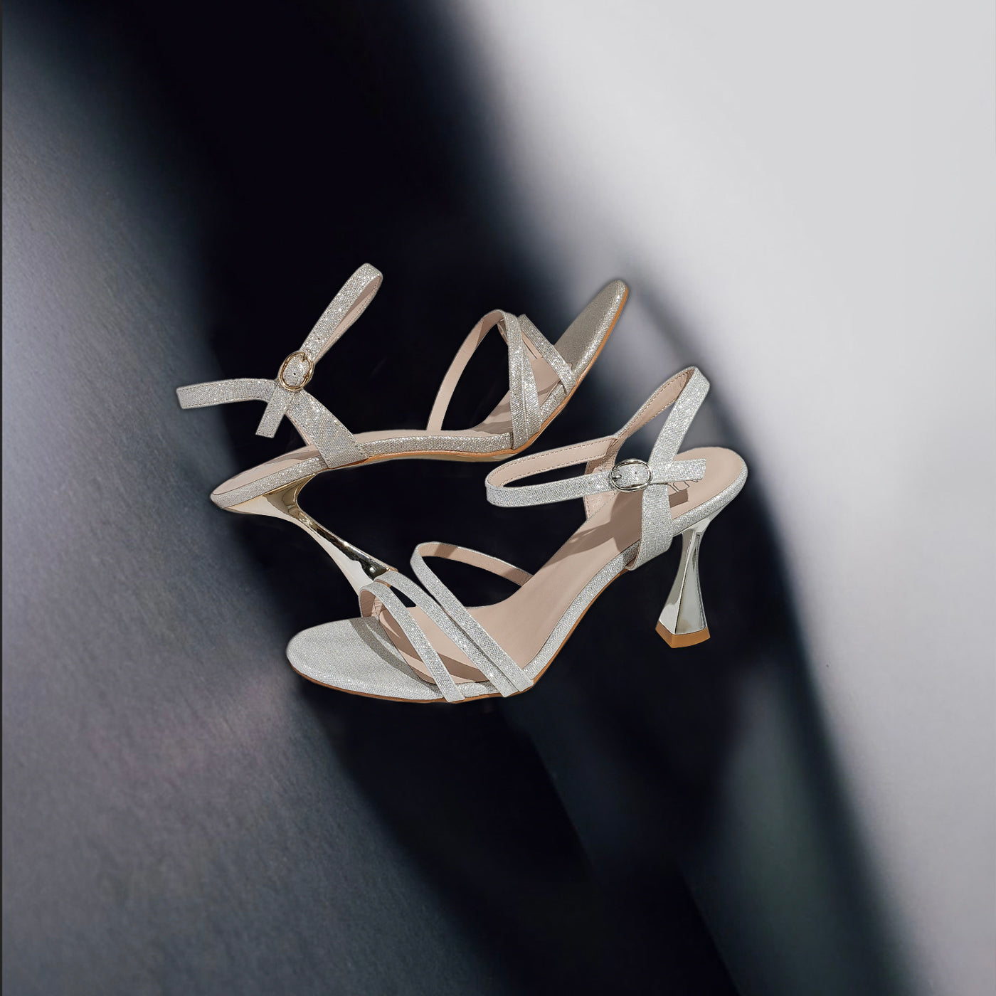 Radiating modern elegance, these heels redefine evening sophistication. Crafted with shimmering straps that wrap gracefully around the foot, they offer a sleek, balanced silhouette. The metallic stiletto heel adds a sculptural touch, creating a refined interplay of light and form. Designed for confidence and comfort, this pair transitions effortlessly from formal gatherings to elevated celebrations.