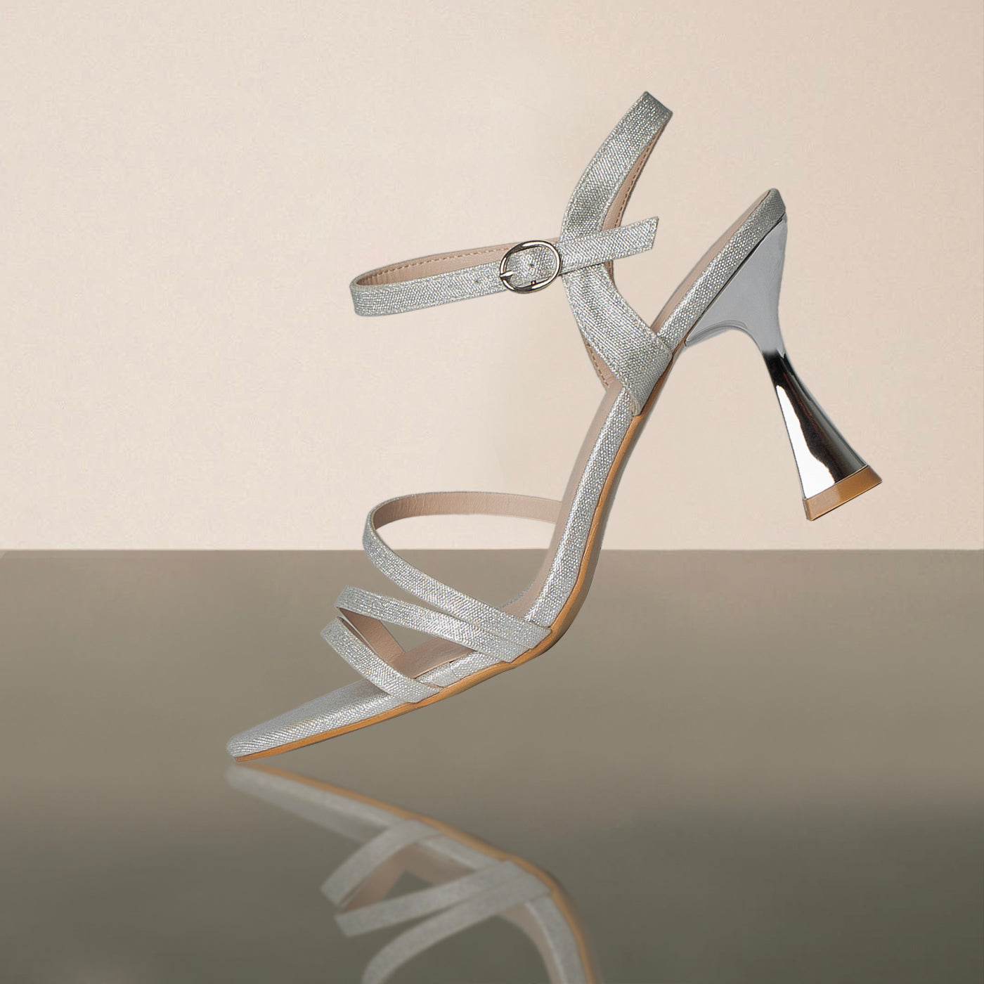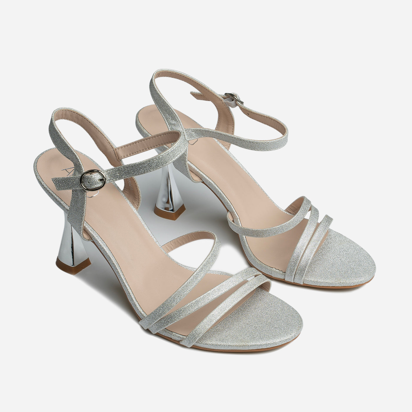 Elegant and modern, these strappy heel sandals embody sleek sophistication. They create a refined, sculptural profile that elongates the foot. The flared metallic heel adds a distinctive architectural edge, blending strength with grace. Designed with an adjustable ankle strap for stability and a cushioned insole for comfort, this pair transitions seamlessly from formal events to evening occasions with polished allure.