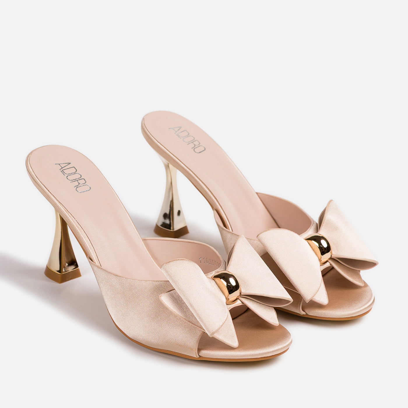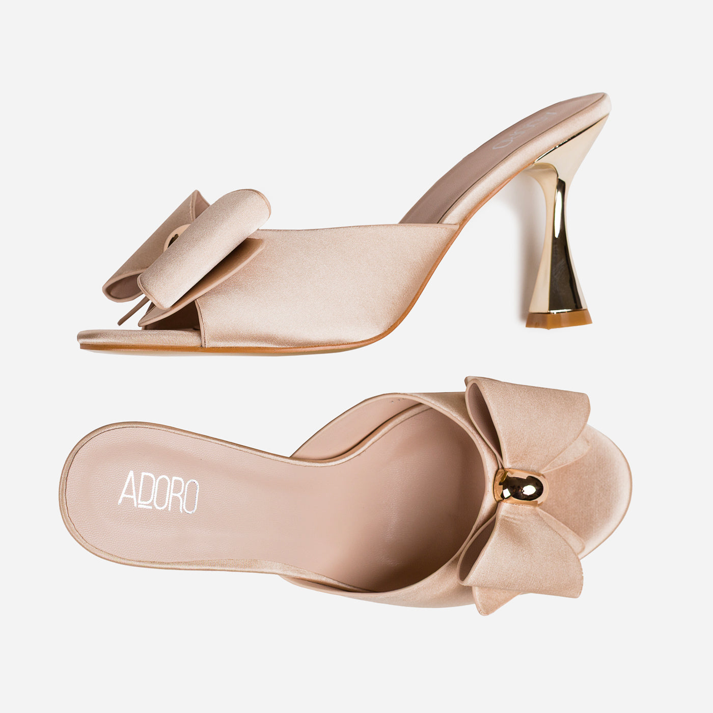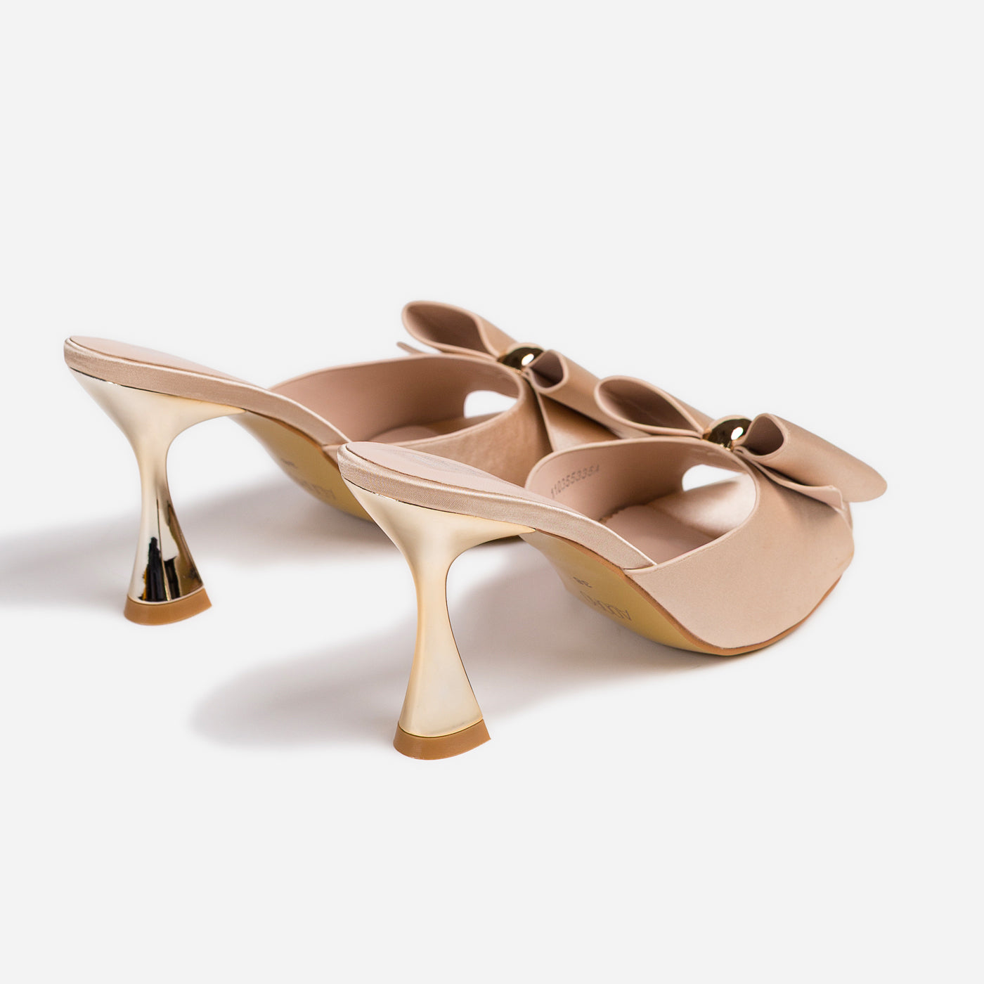 - Design: Open-toe silhouette with oversized bow & gold detail