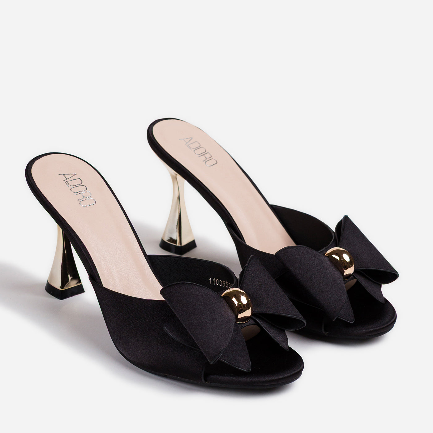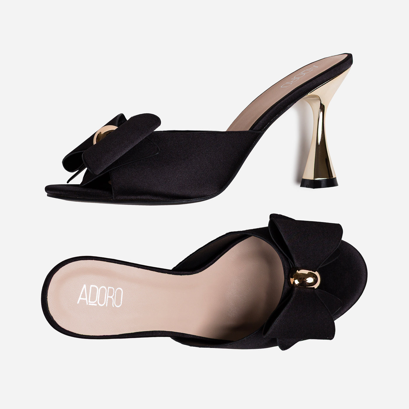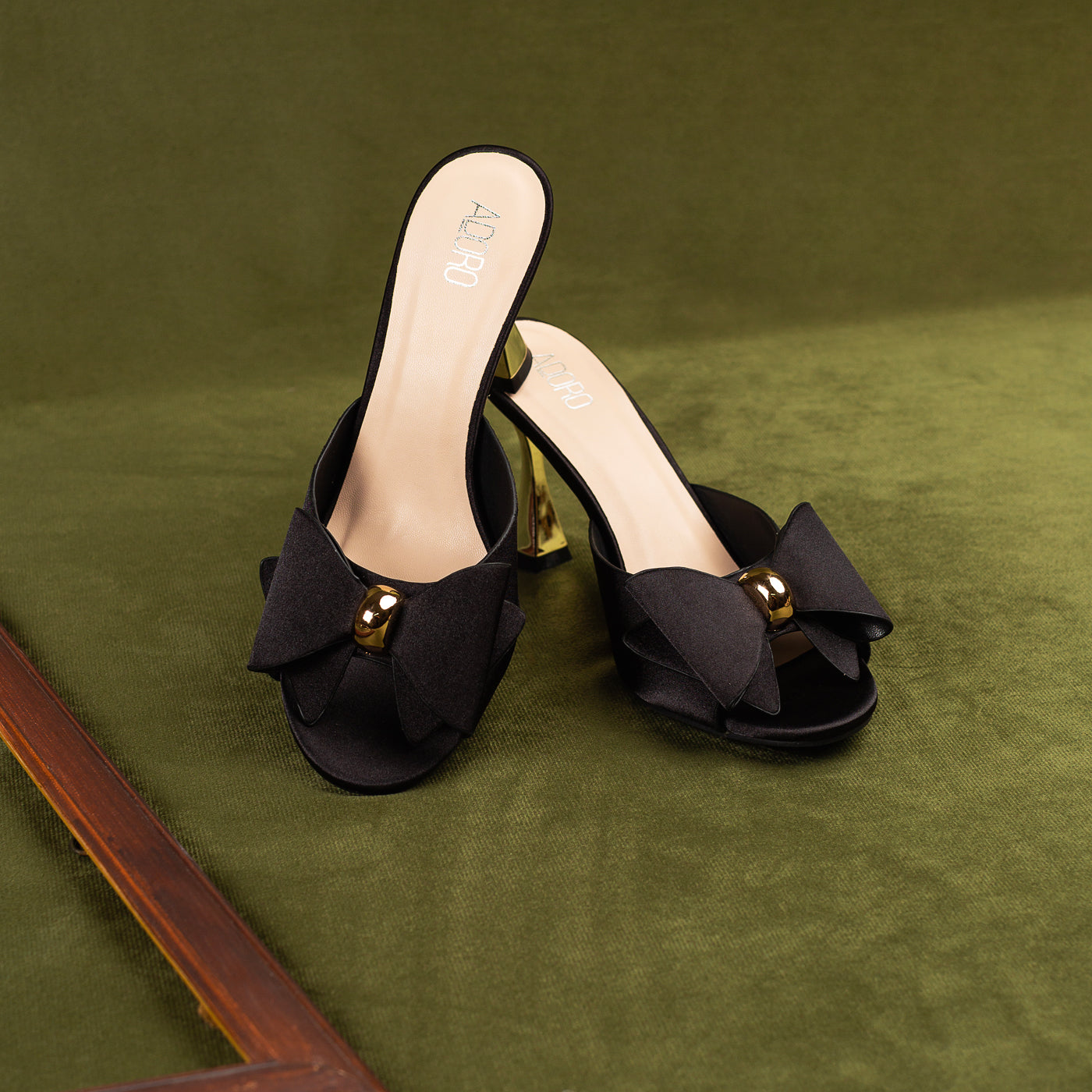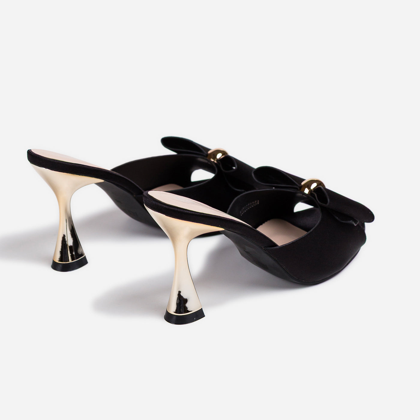 These black slip-on heels bring a beautiful harmony of sophistication and playfulness. The standout bow detail, centered with a polished gold accent, adds a soft romantic charm, while the sleek silhouette and open toe keep things modern and refined. A glam surprise with every step.