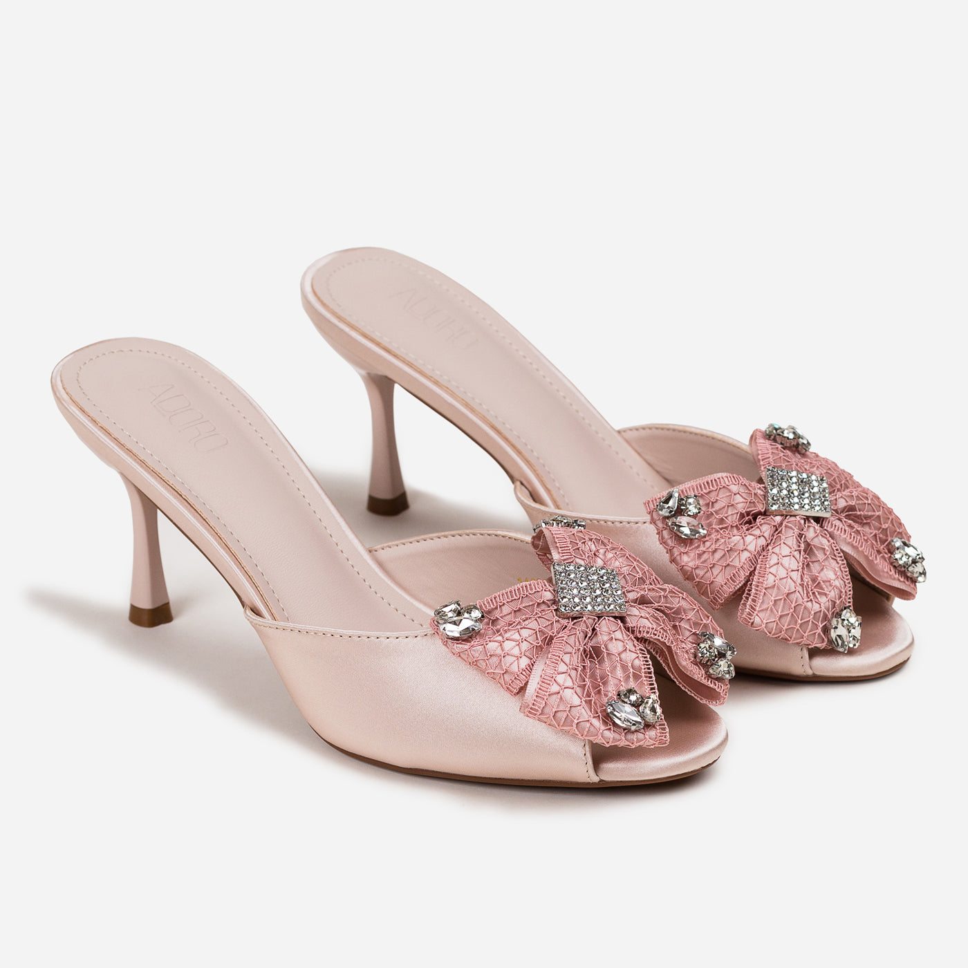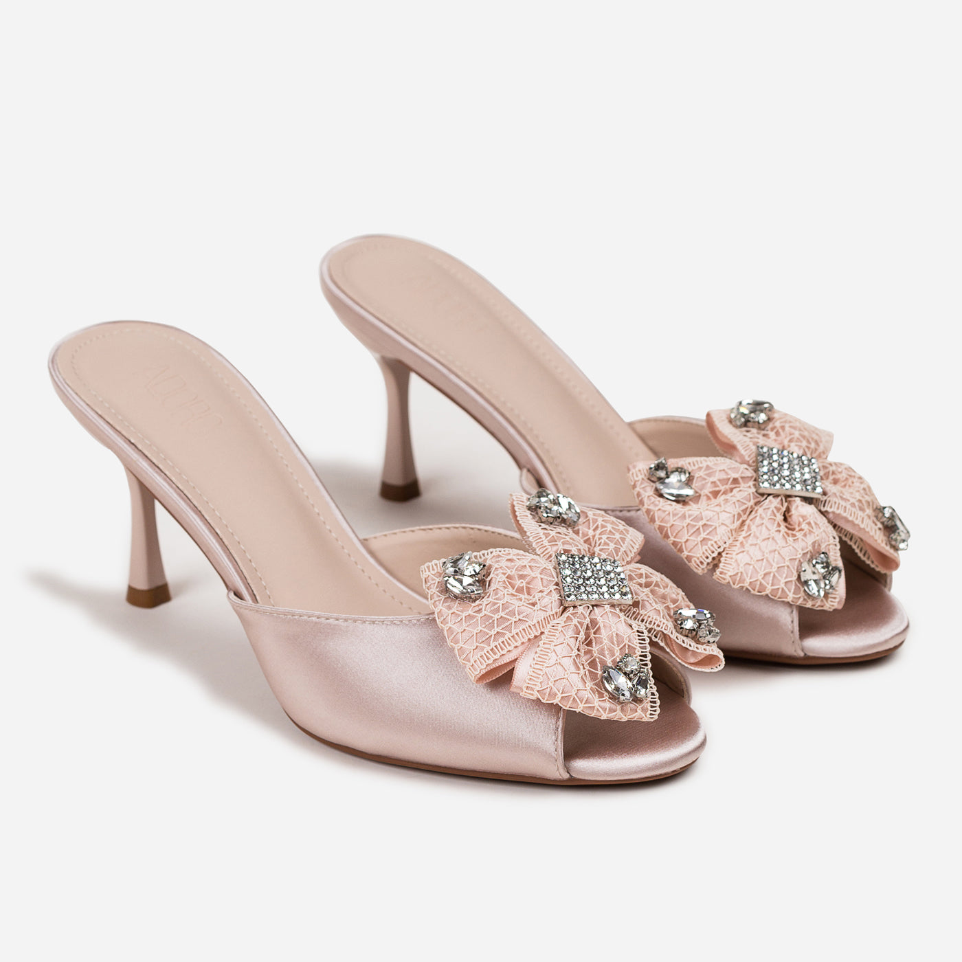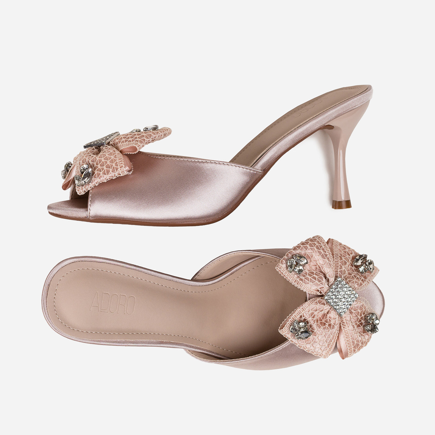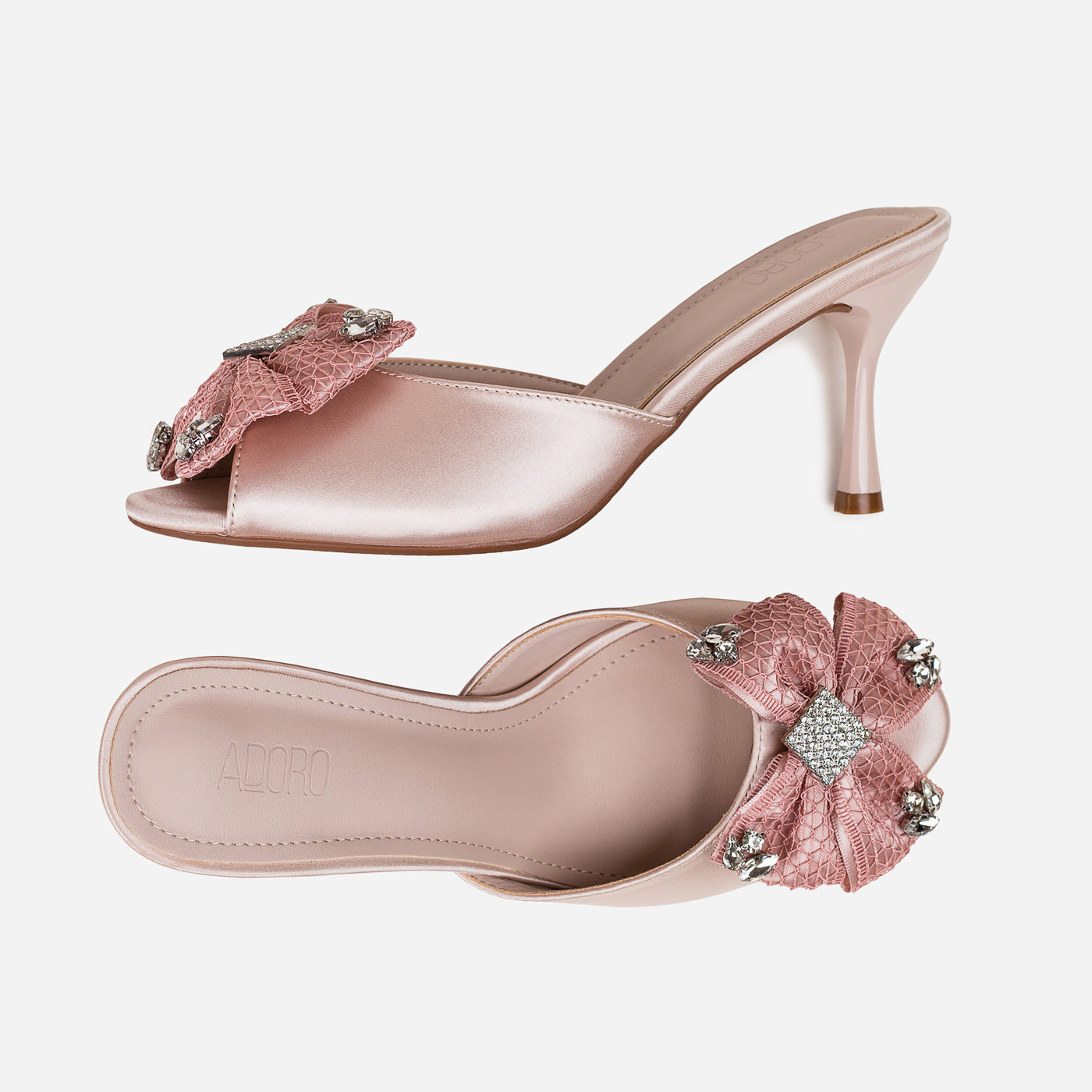 Step into elegance with Adoro’s Bow Luxe heels, designed to make every step feel extraordinary. These peep-toe sandals feature a graceful satin finish paired with a statement oversized bow, beautifully layered with lace detailing. The bow is adorned with sparkling rhinestones and a central crystal accent, adding a glamorous touch that instantly elevates your look. Set on a slender stiletto heel, these heels strike the perfect balance between sophistication and allure, making them ideal for evening occasions, weddings, or festive gatherings. With their chic design and striking embellishment, the Bow Luxe heels are crafted to be the centerpiece of your outfit.