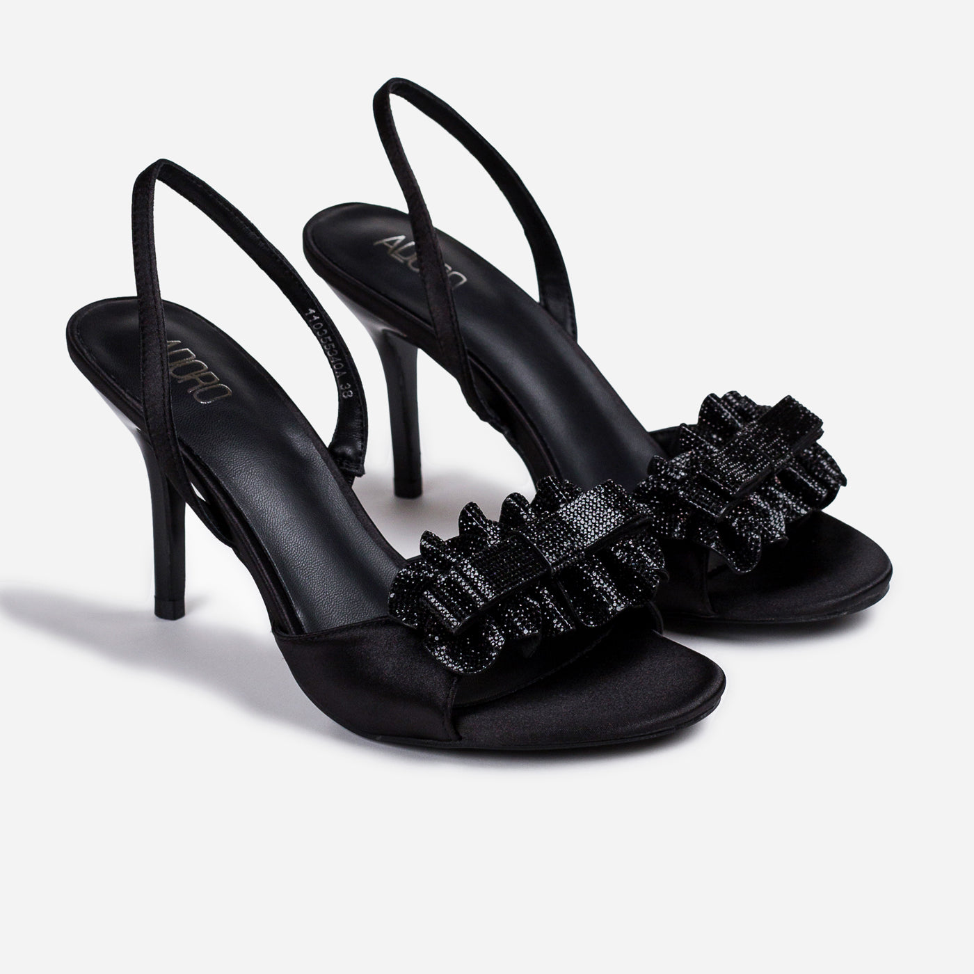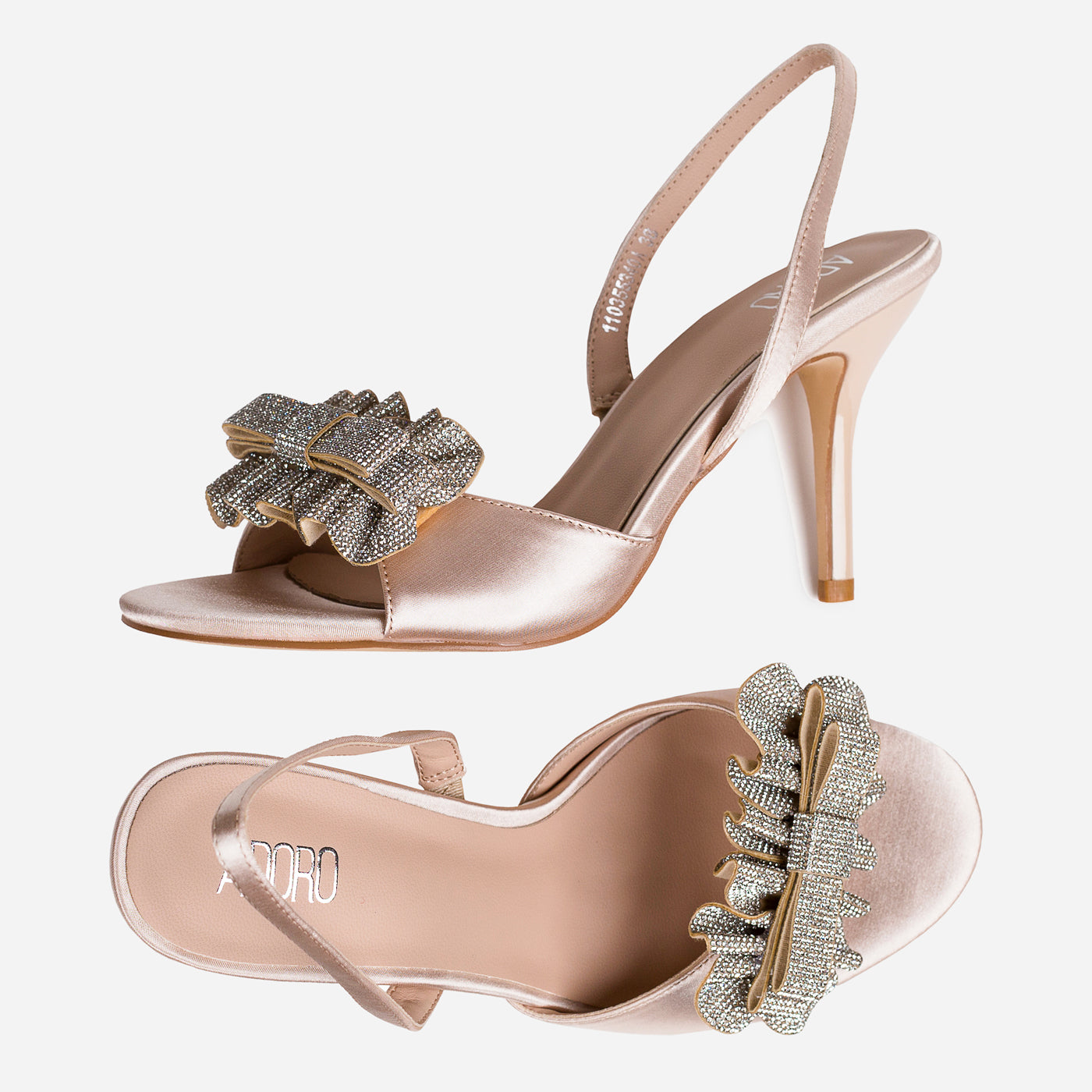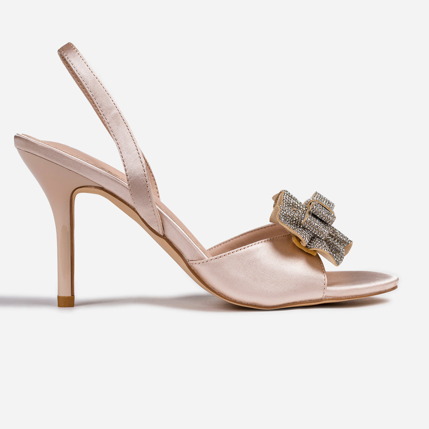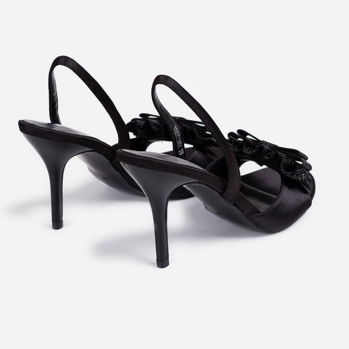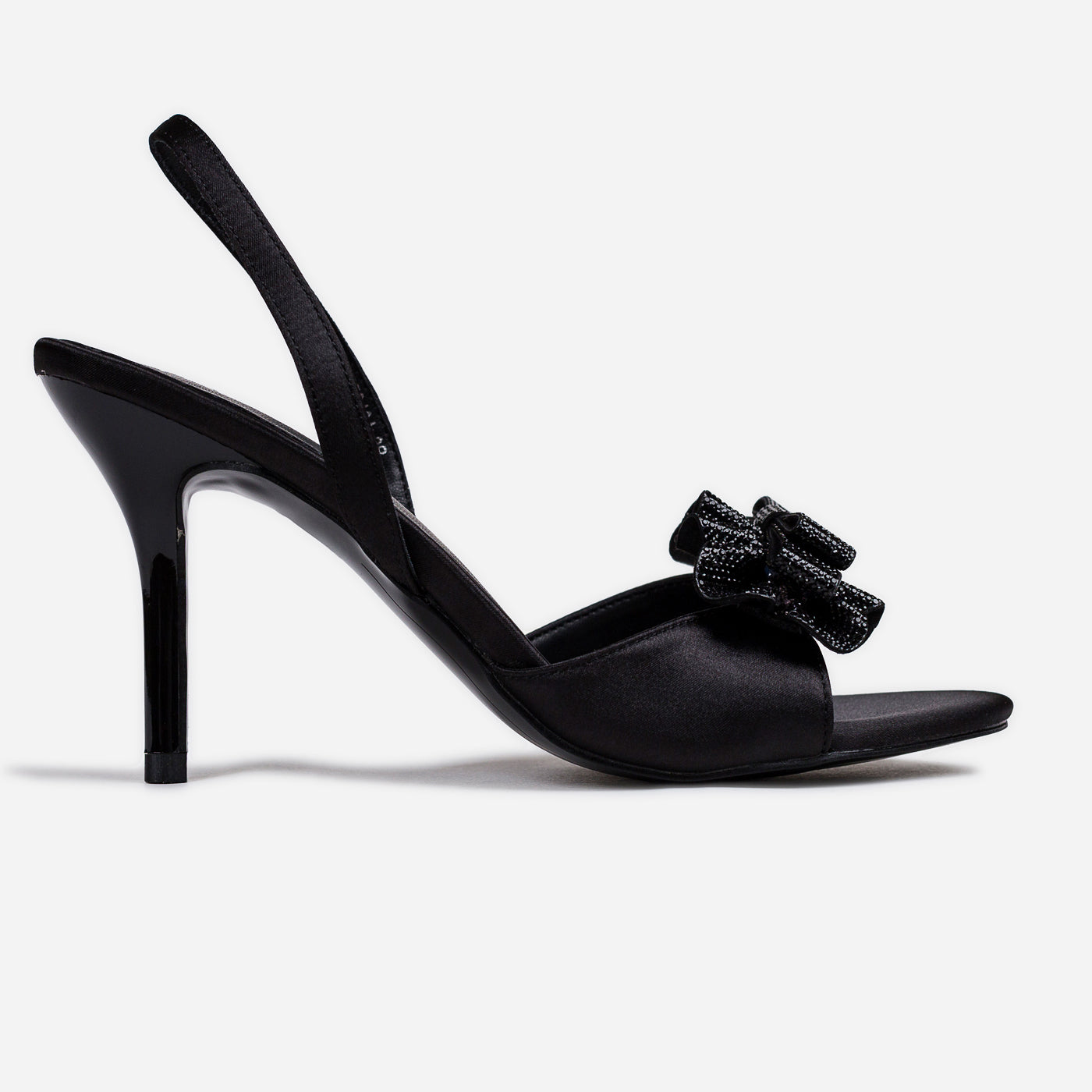 Step into elegance with Glimmer Bloom a refined pair designed to elevate your formal and festive looks. Crafted with a smooth satin upper and detailed with a sparkling embellished bow, this design blends timeless charm with a touch of glamour. The sleek slingback strap provides a comfortable yet secure fit, while the pointed silhouette and stiletto heel add height and poise. Perfect for evening gatherings, celebrations, or formal occasions, this pair brings a polished finish to any outfit.