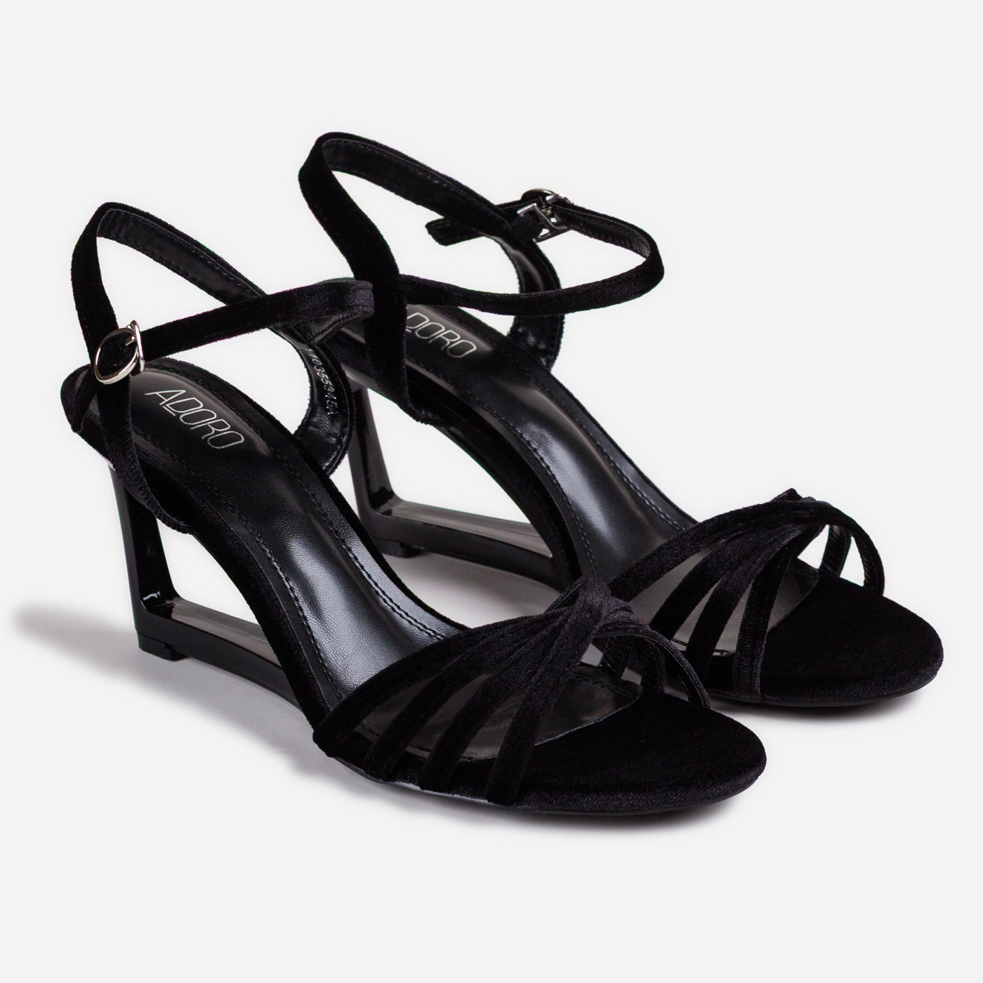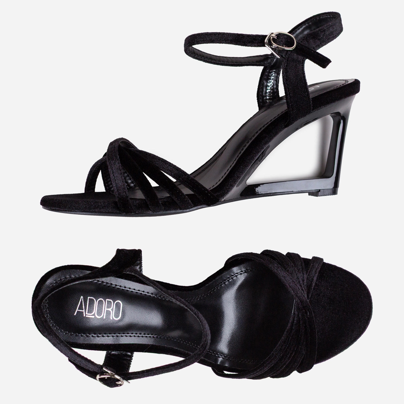 - Design: Multi strap construction with ankle closure and transparent wedge detail