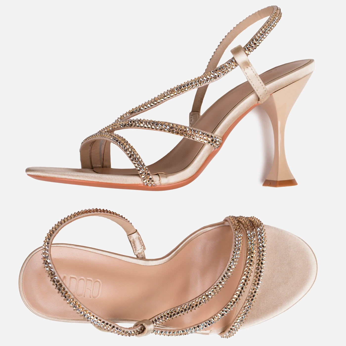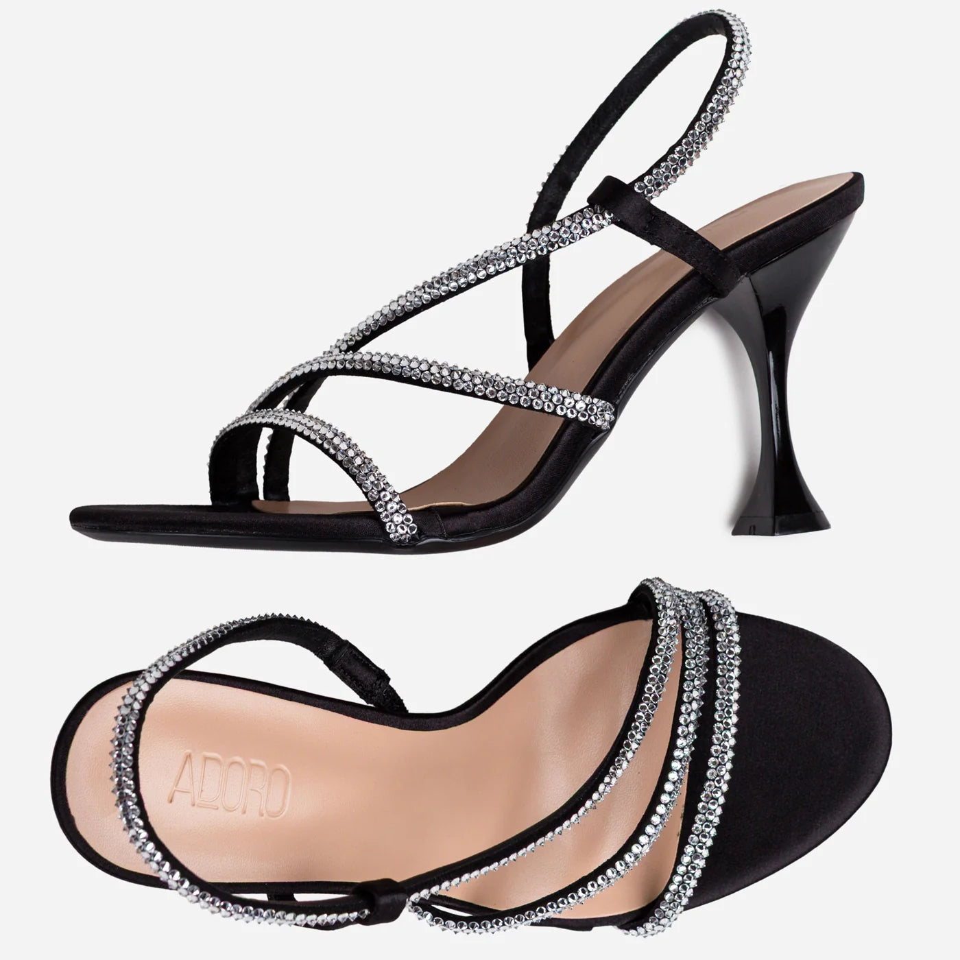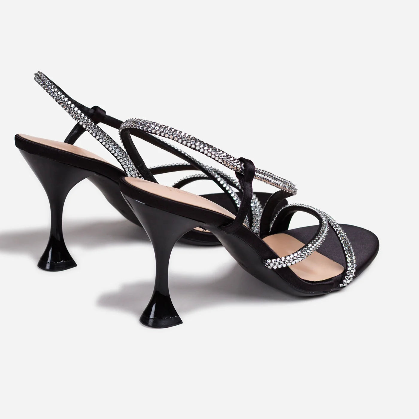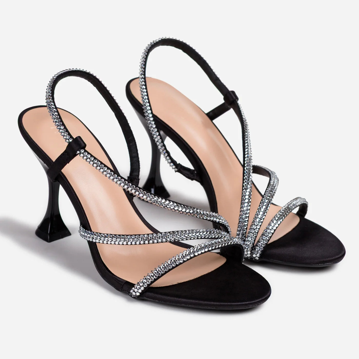 Dazzling glamour in a sophisticated strappy silhouette. This piece features delicate crystal embellished straps creating luxurious dimensional sparkle and elegant crisscross design. The slingback strap with adjustable buckle ensures secure fit, while the cushioned footbed provides all-day comfort. Flared sculptural heel adds modern architectural statement.