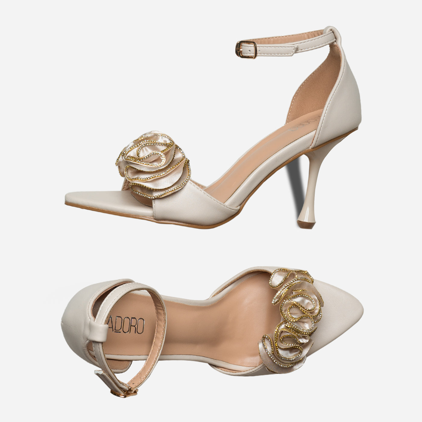 Adorn your look with the Adoro Flora Bloom Stiletto. Crafted from soft matte suede, this ankle strap heel features a captivating floral embellishment with metallic accents. The pointed toe and four-inch stiletto heel create a refined silhouette. With a synthetic suede lining and sole, it offers both style and comfort, perfect for elegant occasions.