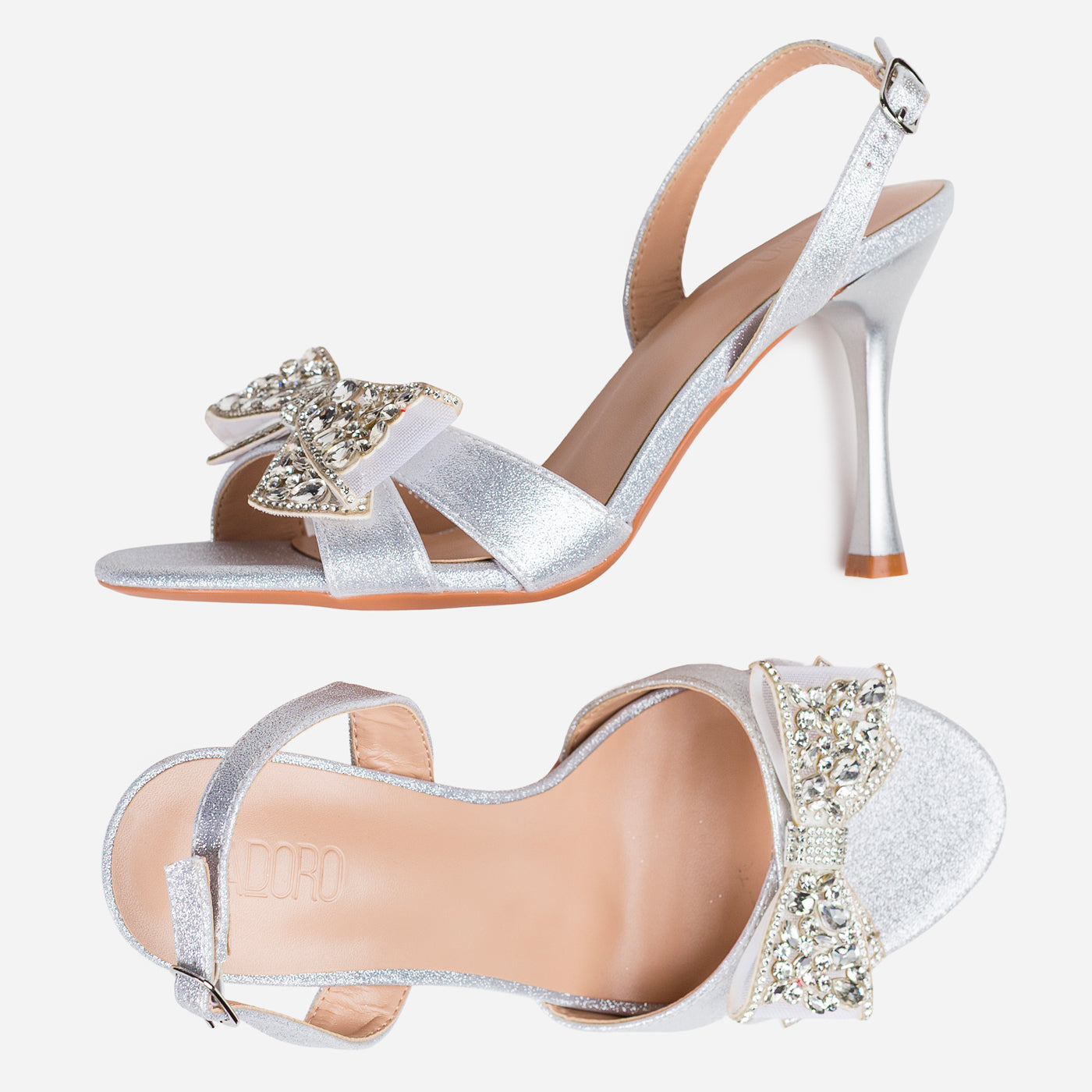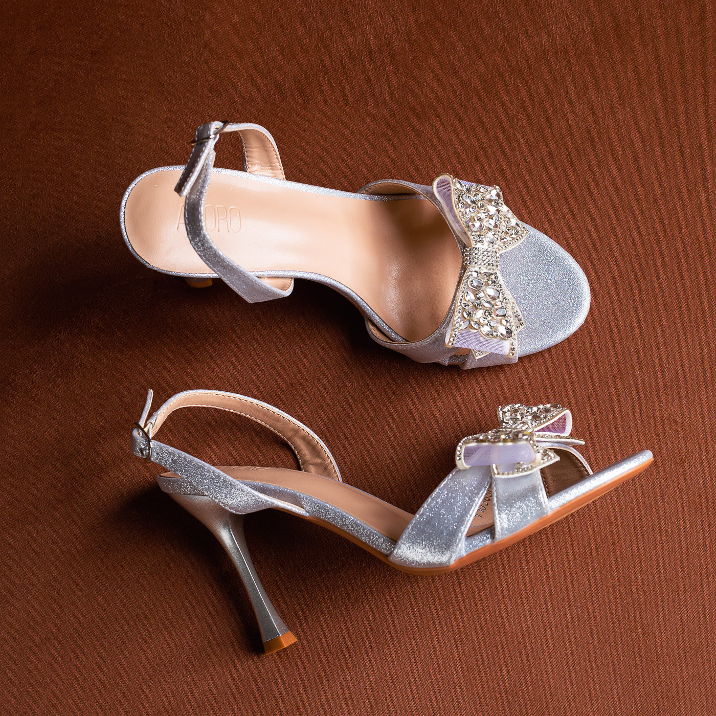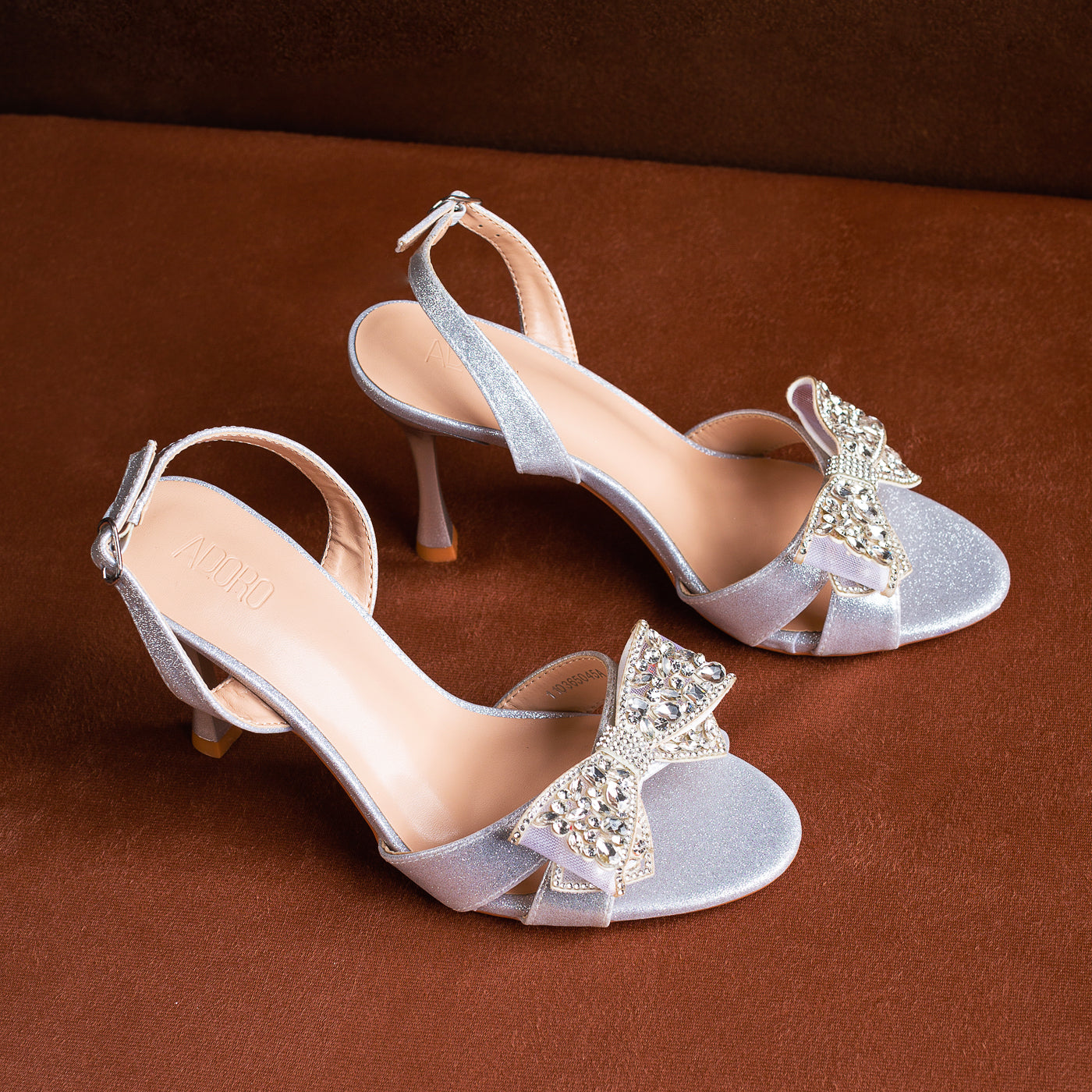 Refined glamour meets playful charm these heels shimmer beautifully with every step, highlighted by a luxe embellished bow that adds a feminine, statement touch. Designed for celebrations and special evenings, they balance elegance and sparkle effortlessly.