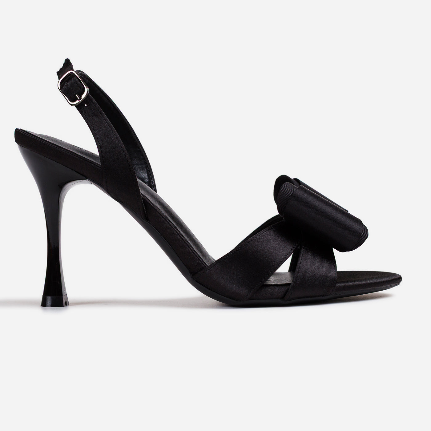 These bow-accent slingback heels exude evening sophistication with a touch of playful charm. The sculpted satin bows are beautifully adorned with a sparkling crystal detail, adding a luxe, jewelry like finish. Sleek straps and a slender heel elongate the silhouette, while the all-black satin base keeps the look polished and classic.