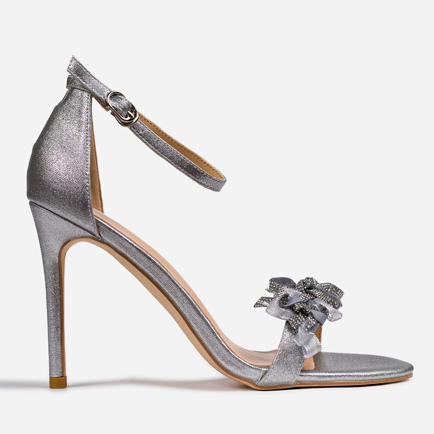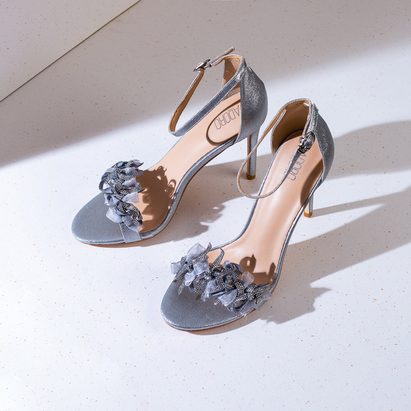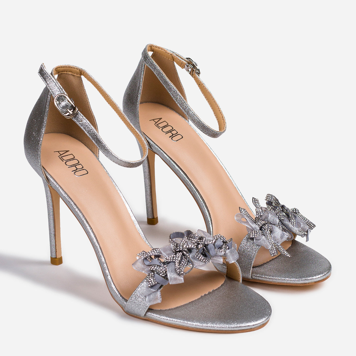 Elegant and eye-catching, this heel features a slender stiletto design enhanced with delicate bow accents across the front strap. The ankle closure offers a secure, graceful fit, while its refined shimmer adds a touch of sophistication. Perfect for evening wear, it captures the essence of poised femininity and modern glamour.