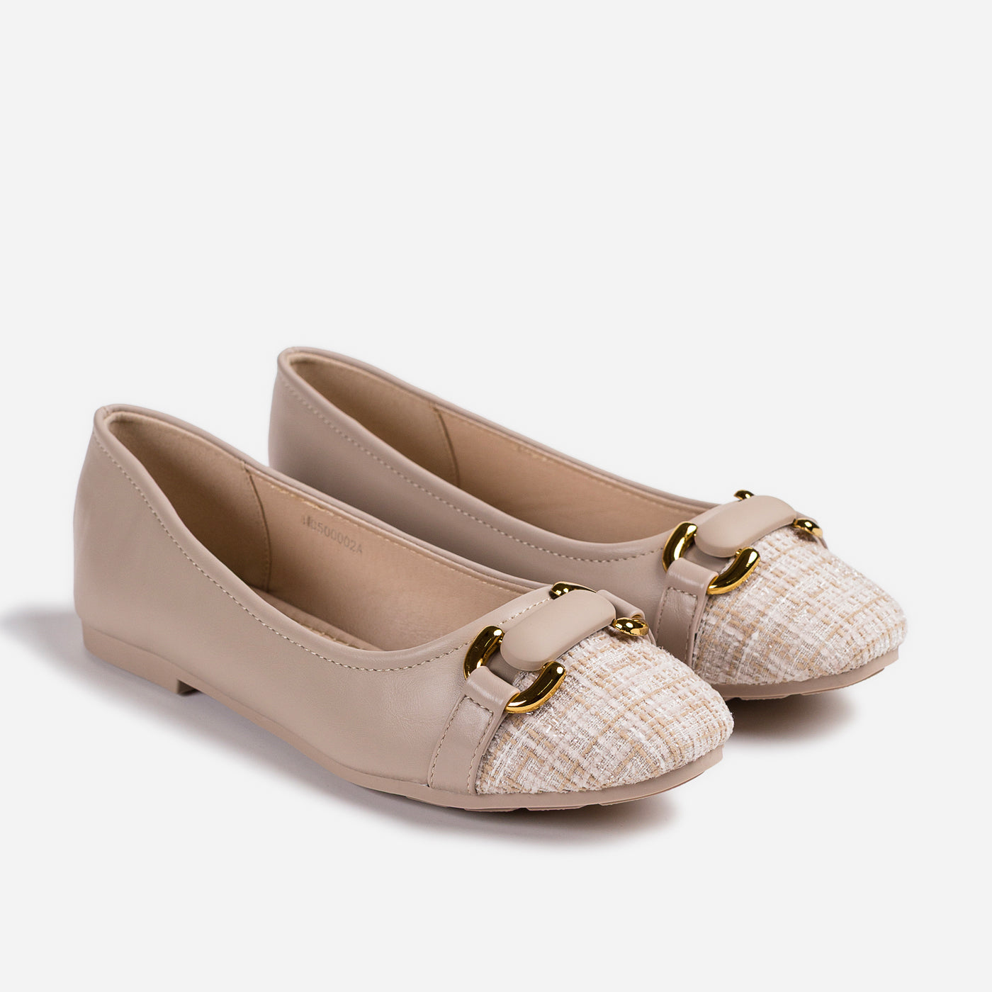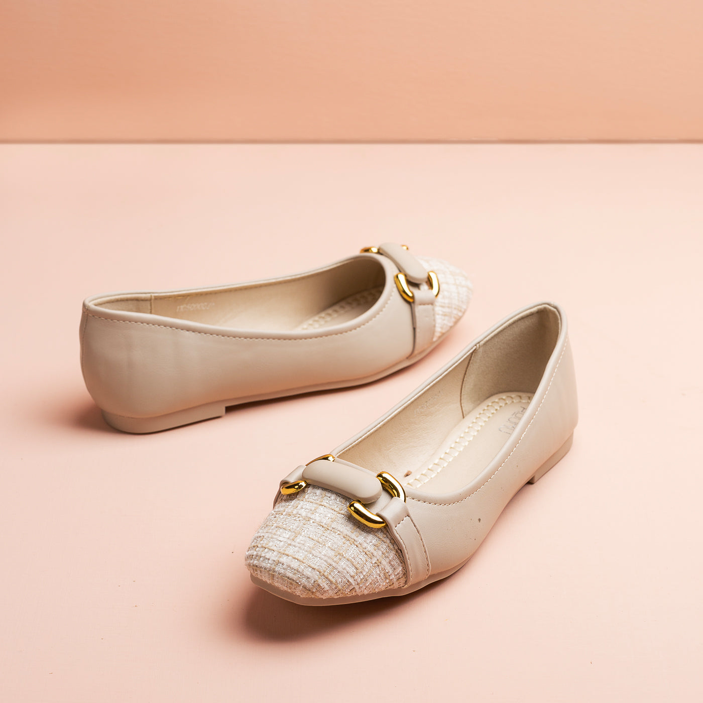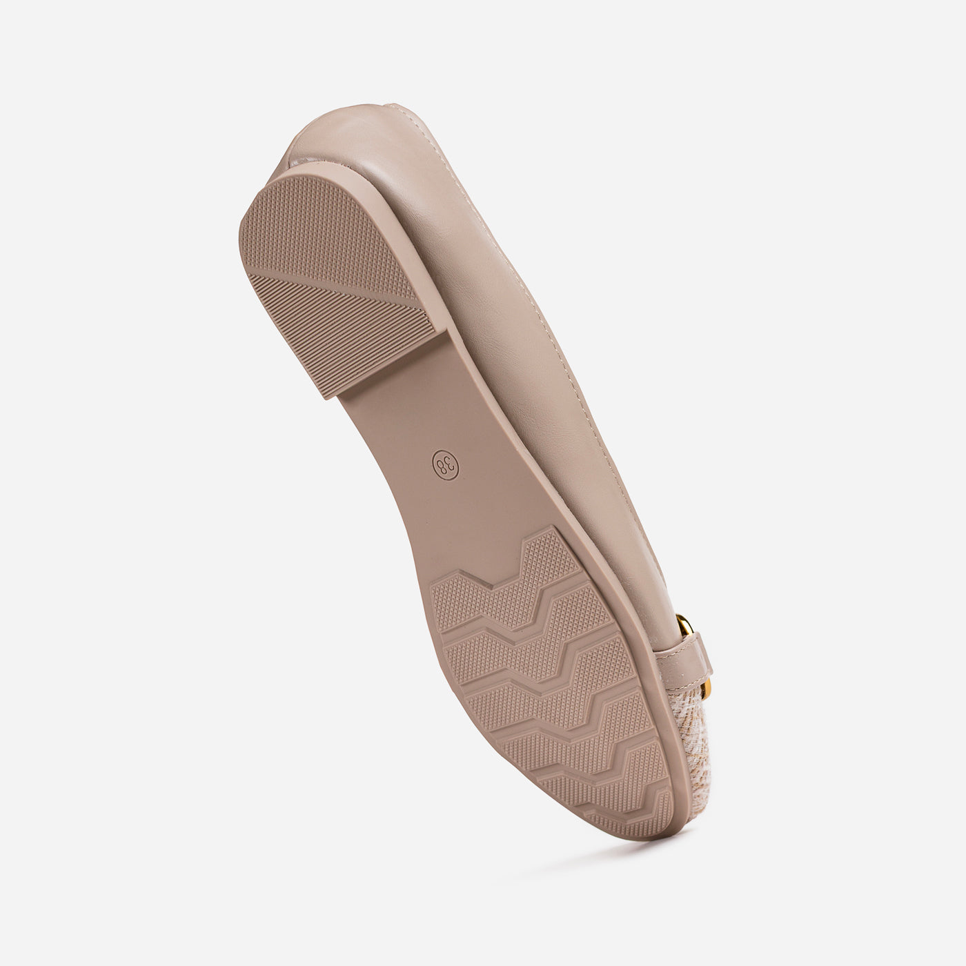 Featuring a chic tweed toe accent and polished gold-tone hardware, this pair blends timeless charm with contemporary style. The smooth beige finish adds a warm, feminine touch, making it perfect for workdays, brunch dates, and everything in between. Crafted with a cushioned insole and a sleek low-profile design, these shoes offer effortless comfort without compromising on elegance. A subtle square toe and luxe detailing elevate any outfit from tailored pants to flowy dresses. Classic texture meets modern elegance for the woman who loves subtle luxury.