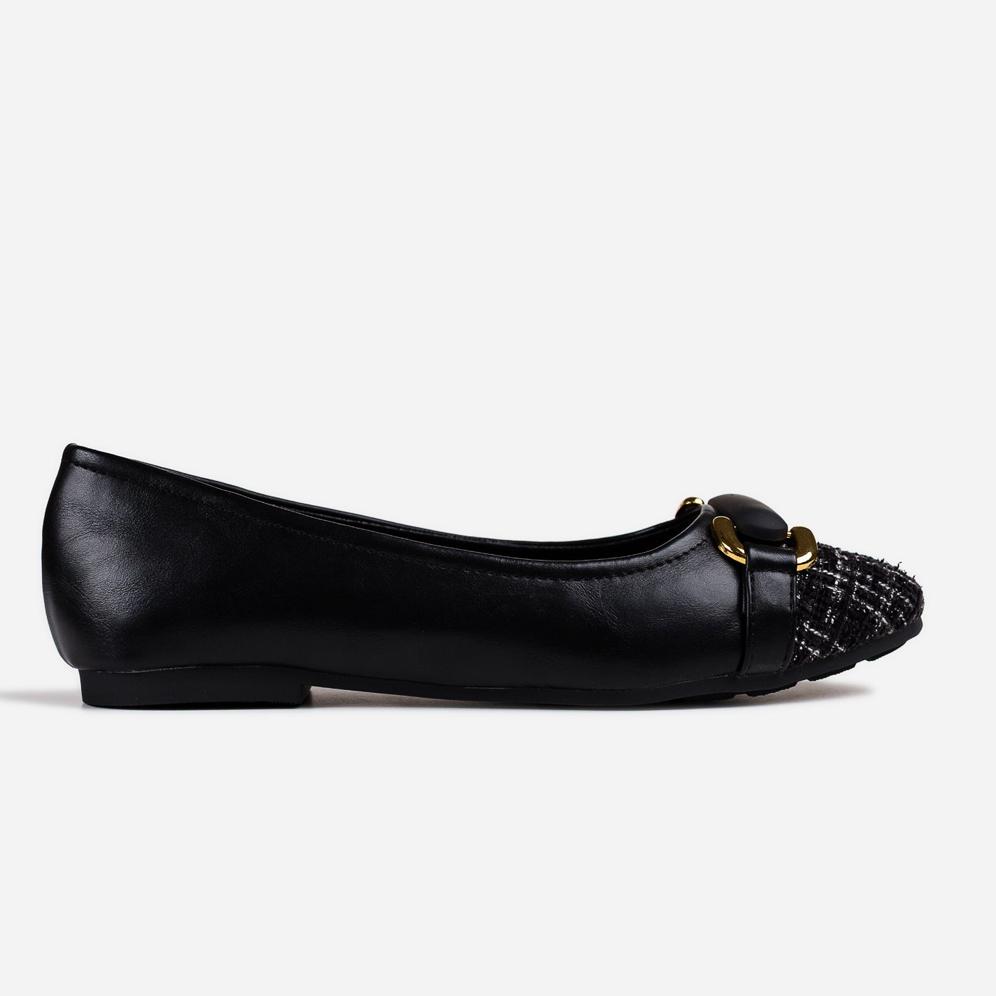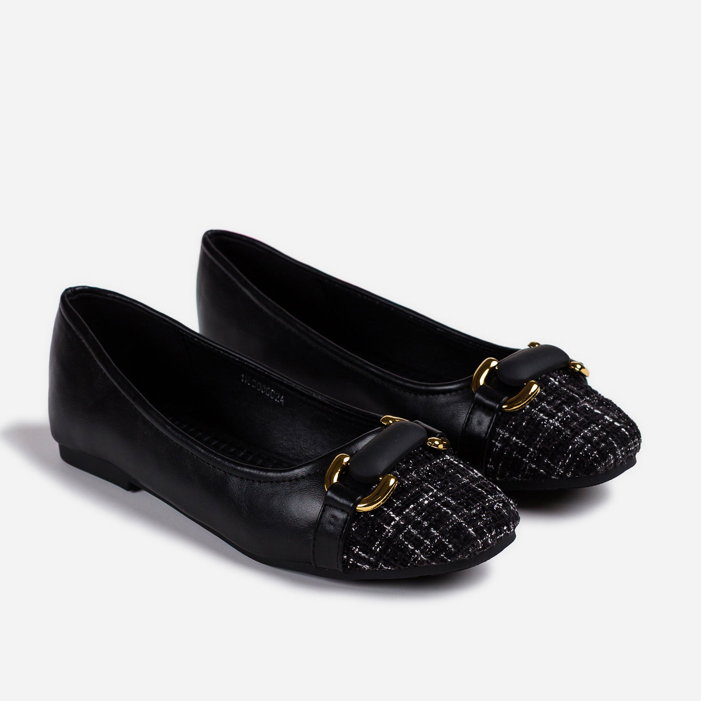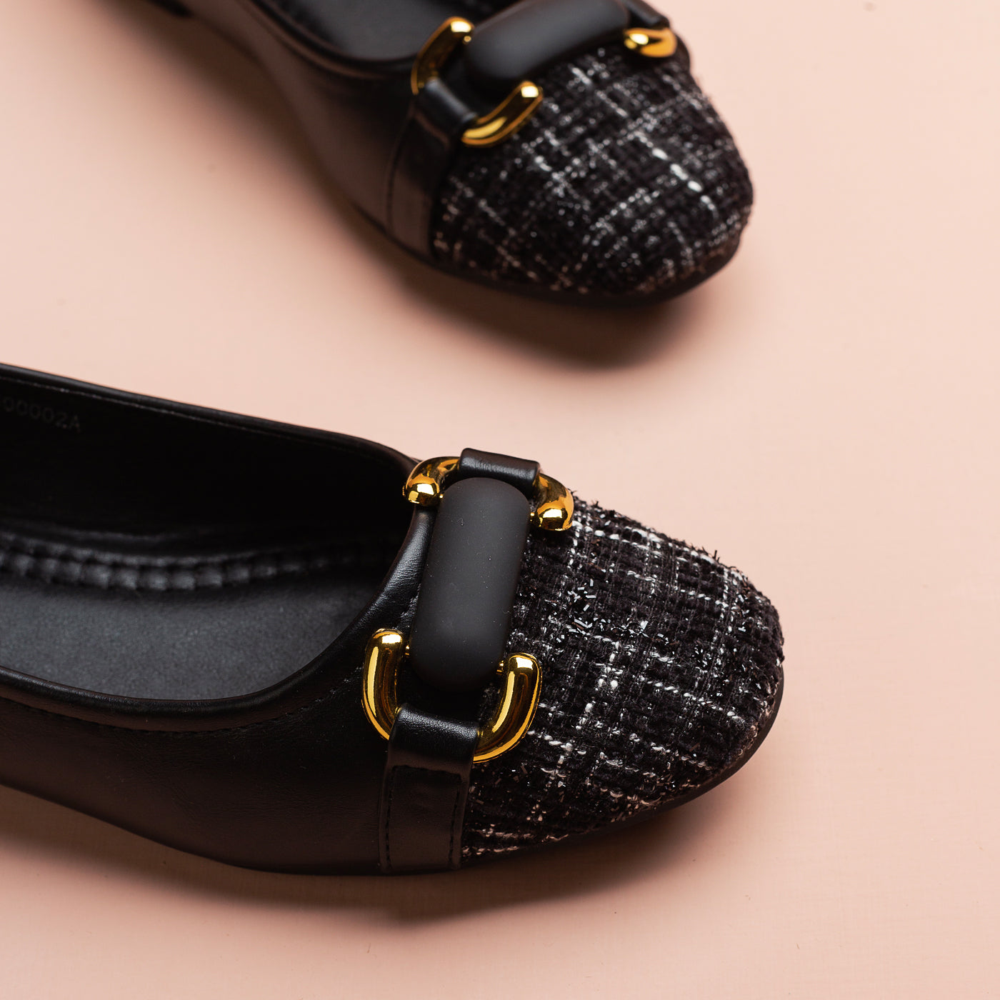The rich black tweed toe, paired with sleek faux-leather and polished gold hardware, brings Parisian elegance to your wardrobe. Perfect for transitioning from boardroom chic to evening sophistication without changing a thing. Designed with a soft cushioned footbed and a sleek silhouette, these flats offer all-day comfort wrapped in high-fashion flair. The structured square toe and glossy accents make this pair a polished essential for women who appreciate subtle statement style. Bold, refined, and endlessly wearable a wardrobe staple for effortless luxury.