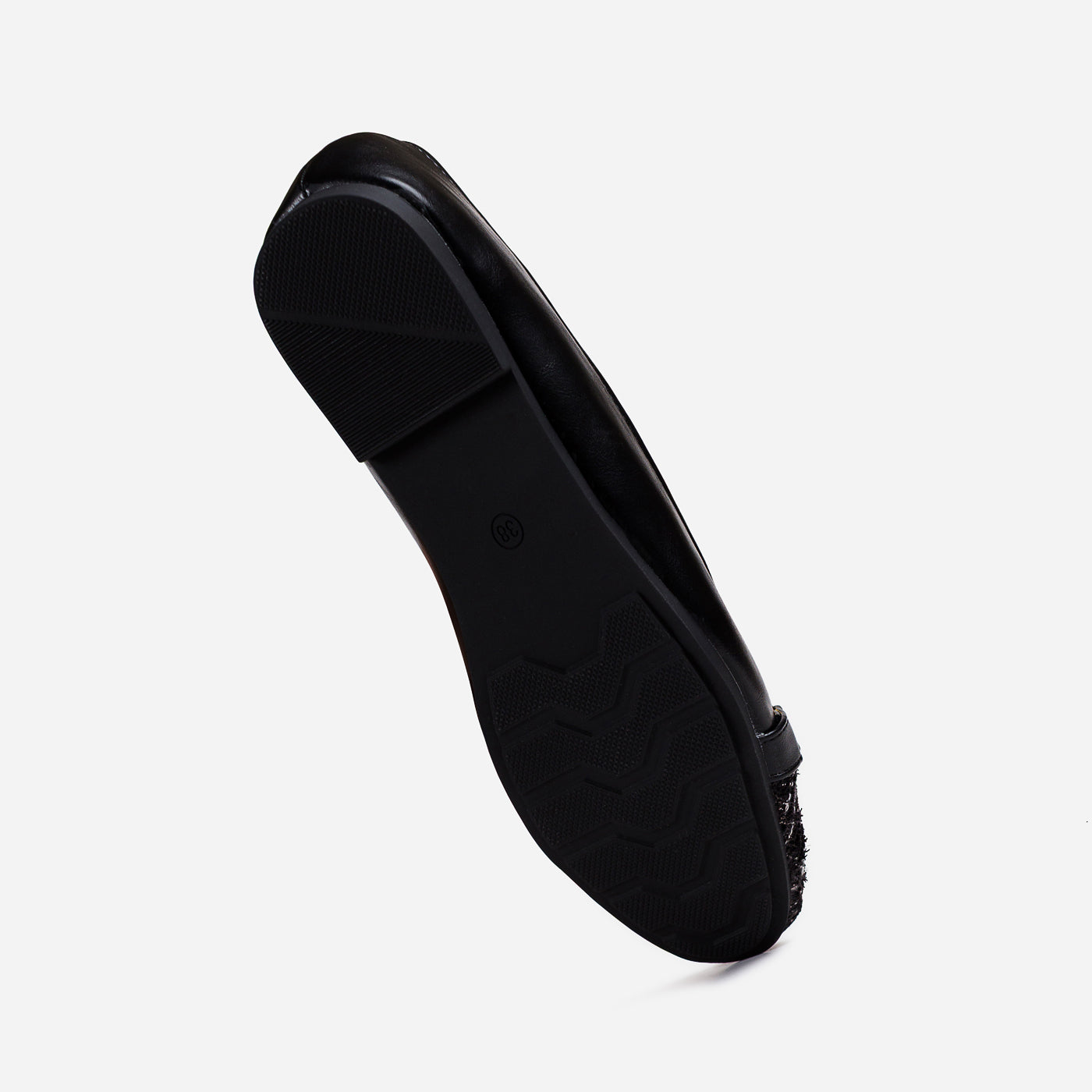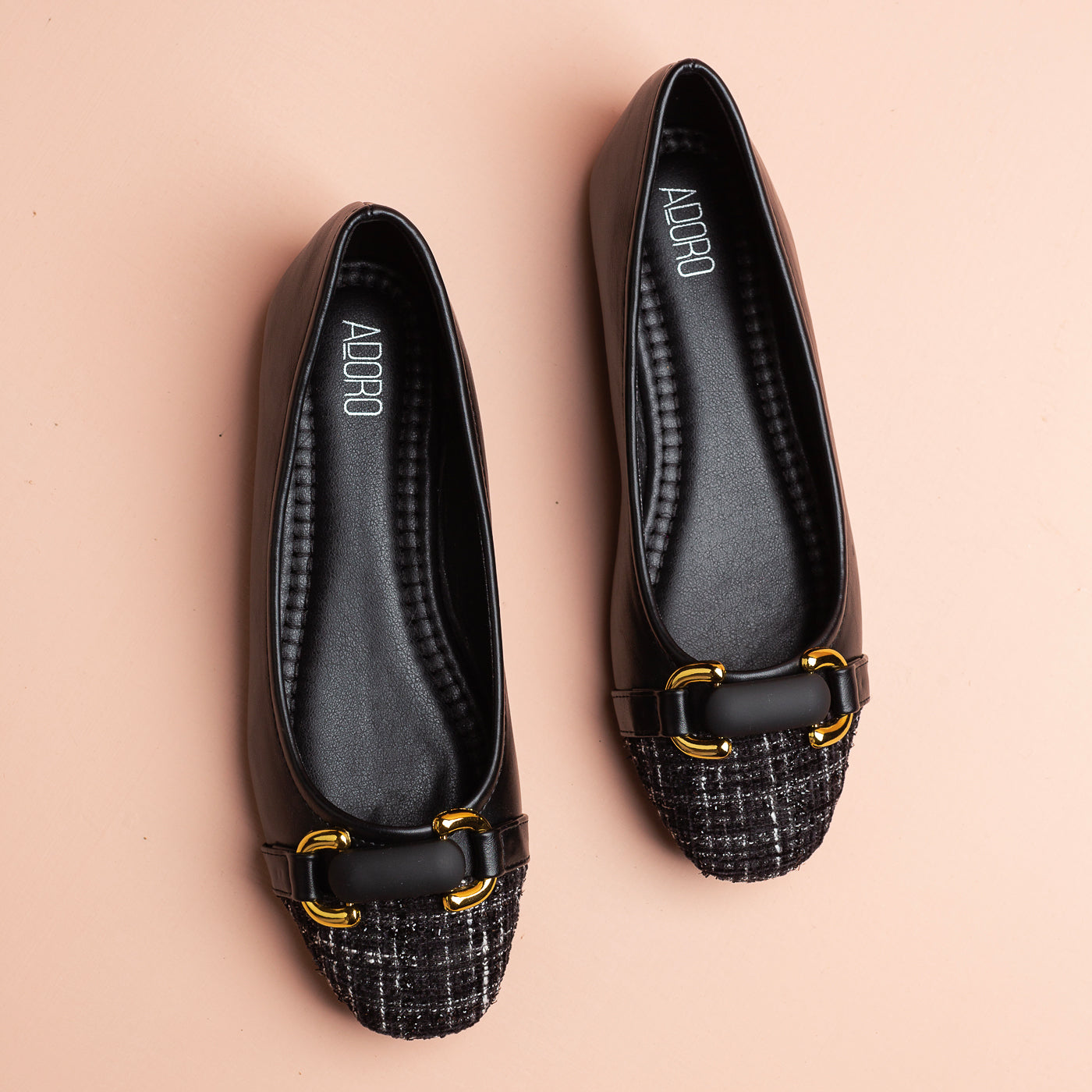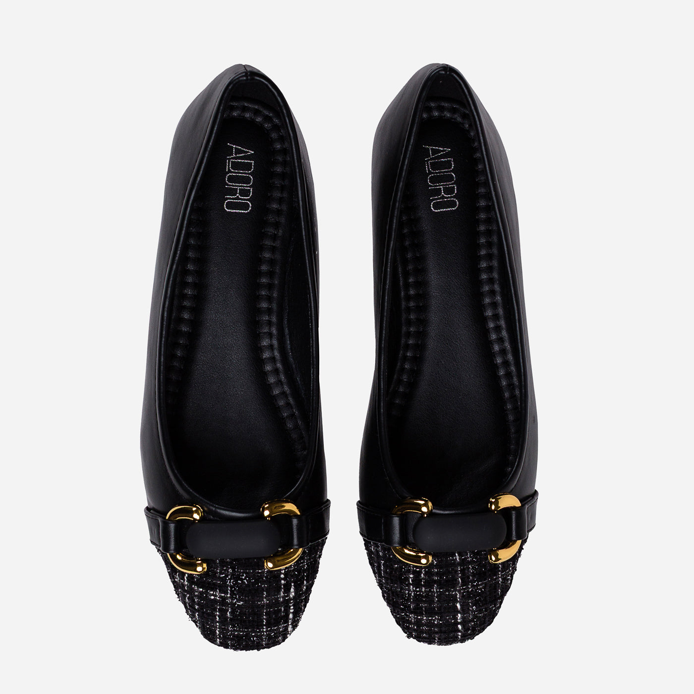 The rich black tweed toe, paired with sleek faux-leather and polished gold hardware, brings Parisian elegance to your wardrobe. Perfect for transitioning from boardroom chic to evening sophistication without changing a thing. Designed with a soft cushioned footbed and a sleek silhouette, these flats offer all-day comfort wrapped in high-fashion flair. The structured square toe and glossy accents make this pair a polished essential for women who appreciate subtle statement style. Bold, refined, and endlessly wearable a wardrobe staple for effortless luxury.