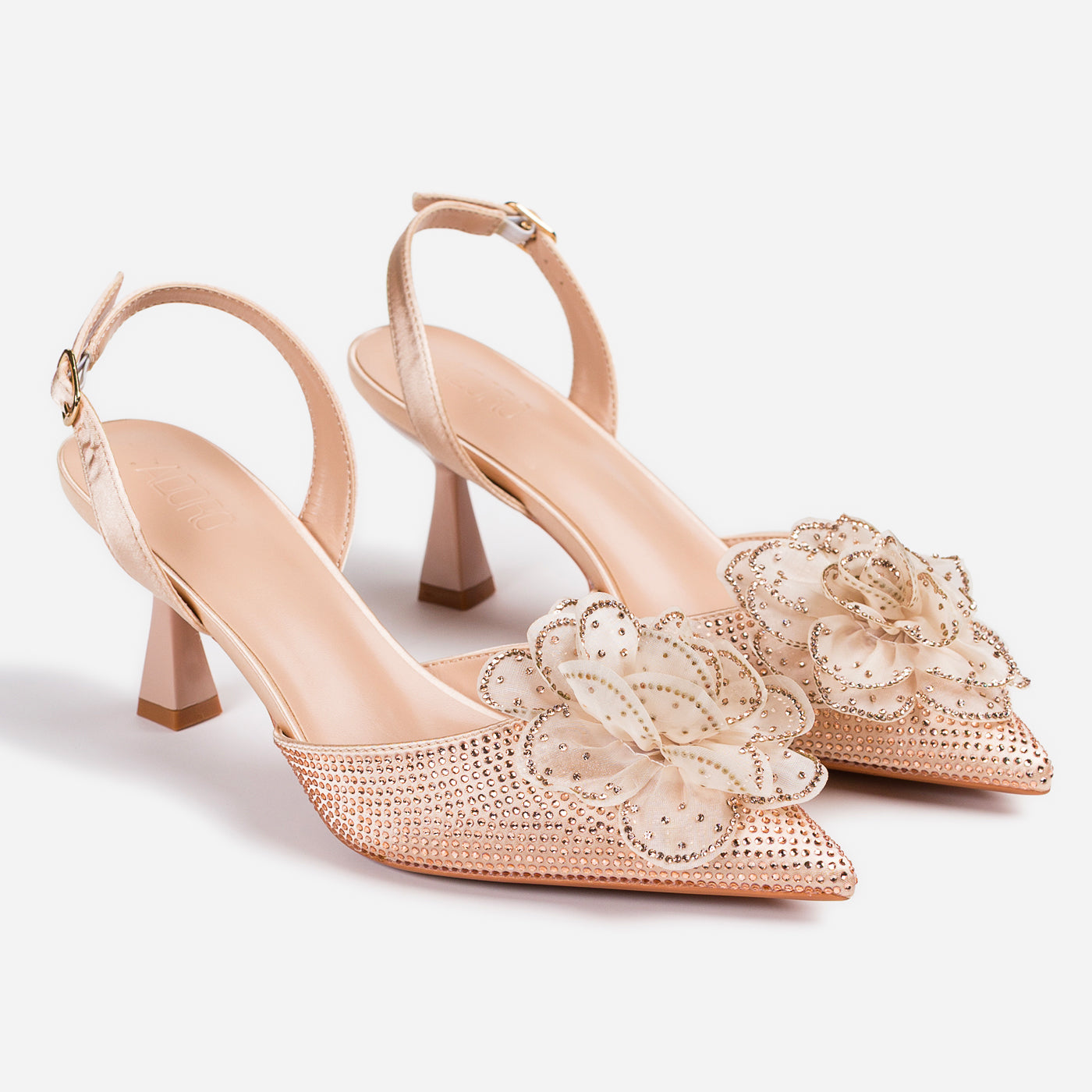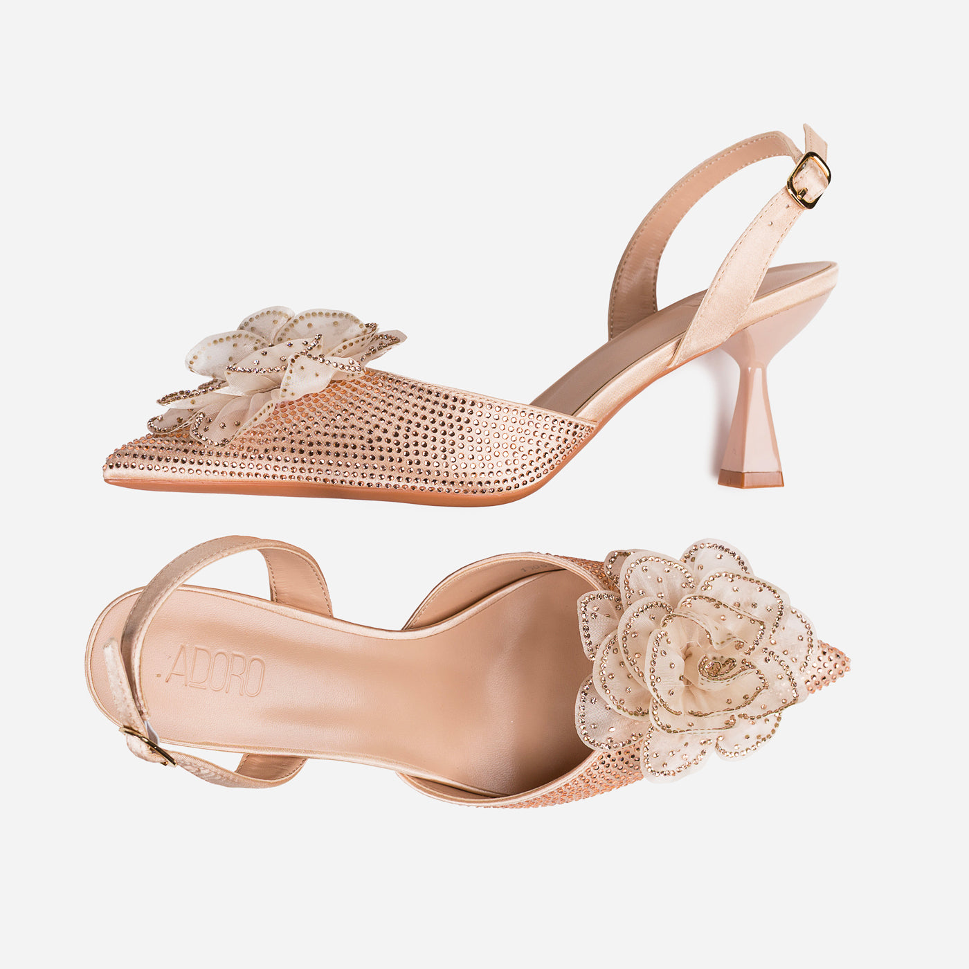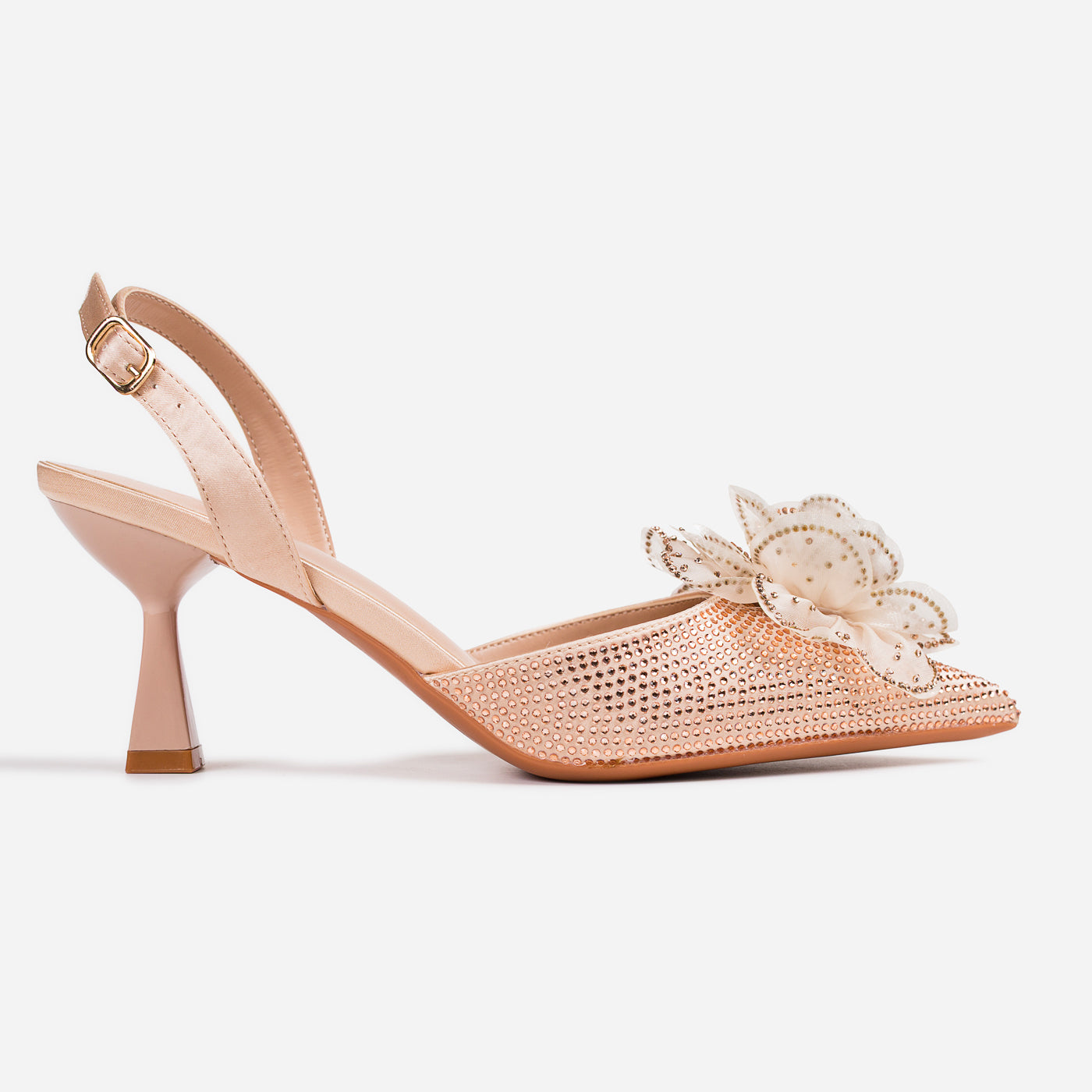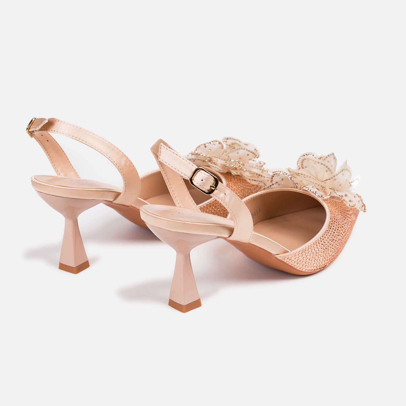 A dreamy, feminine heel crafted to turn heads. The pointed silhouette is adorned with a delicate 3D floral appliqué and shimmering crystal accents, creating a graceful blend of romance and glam. The slingback strap and sculpted heel add comfort and poise for every special step.