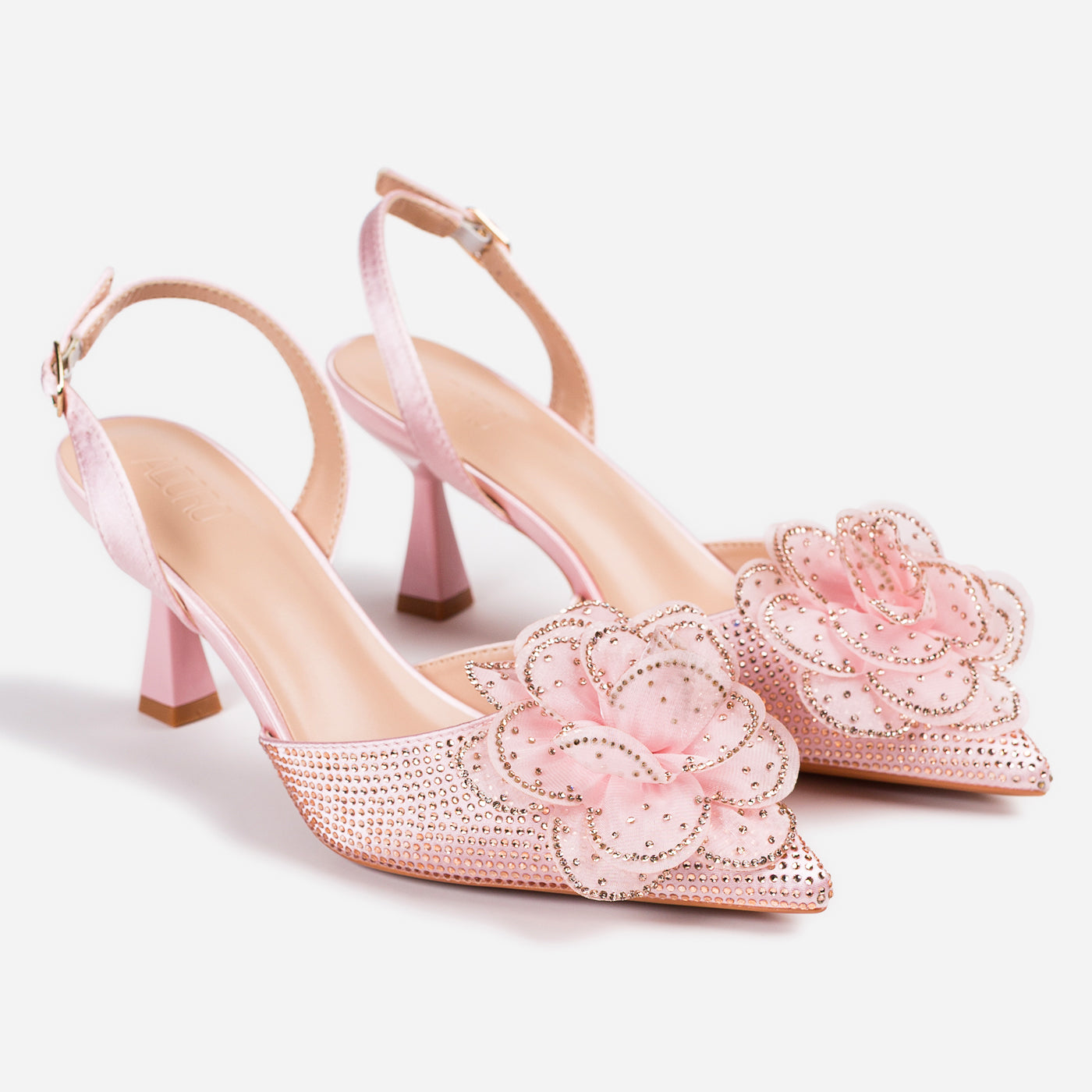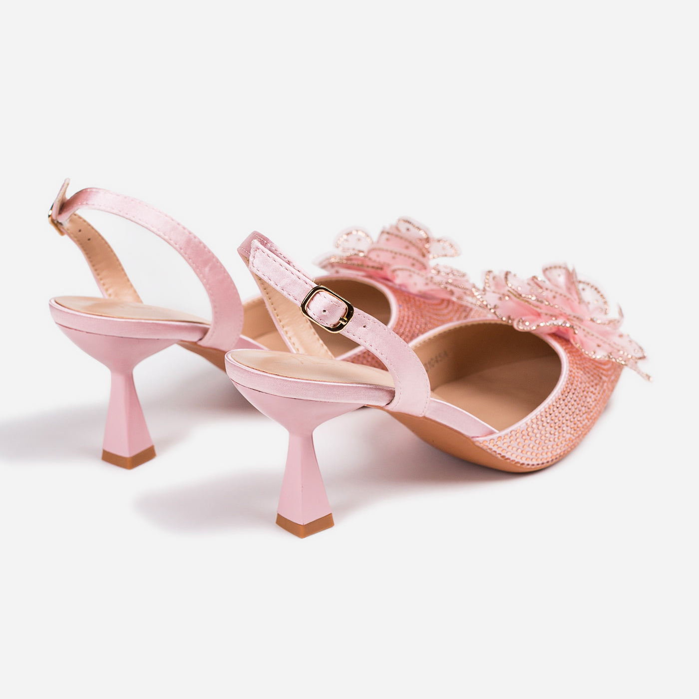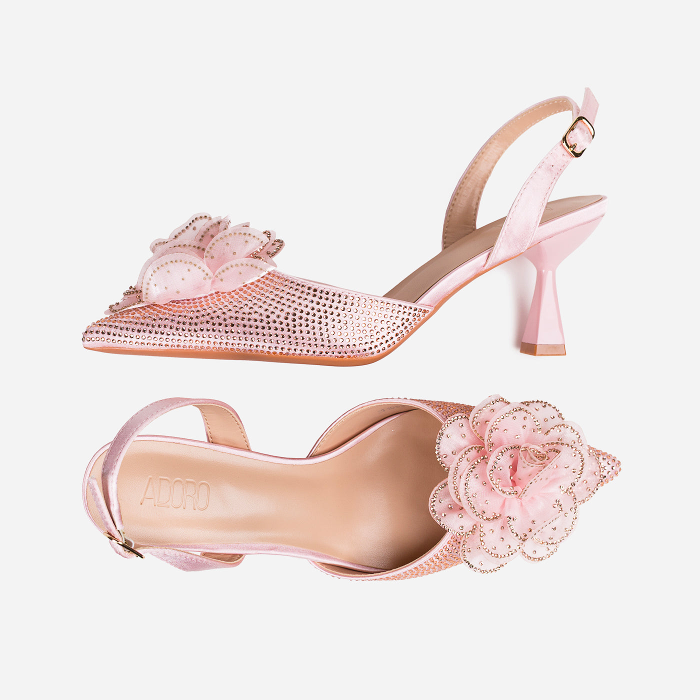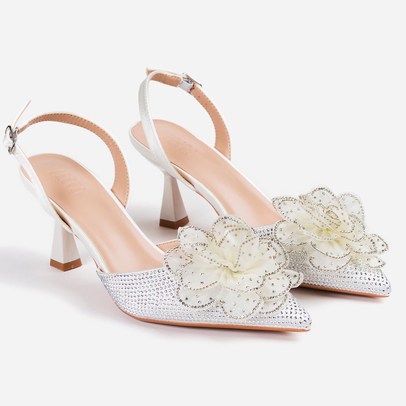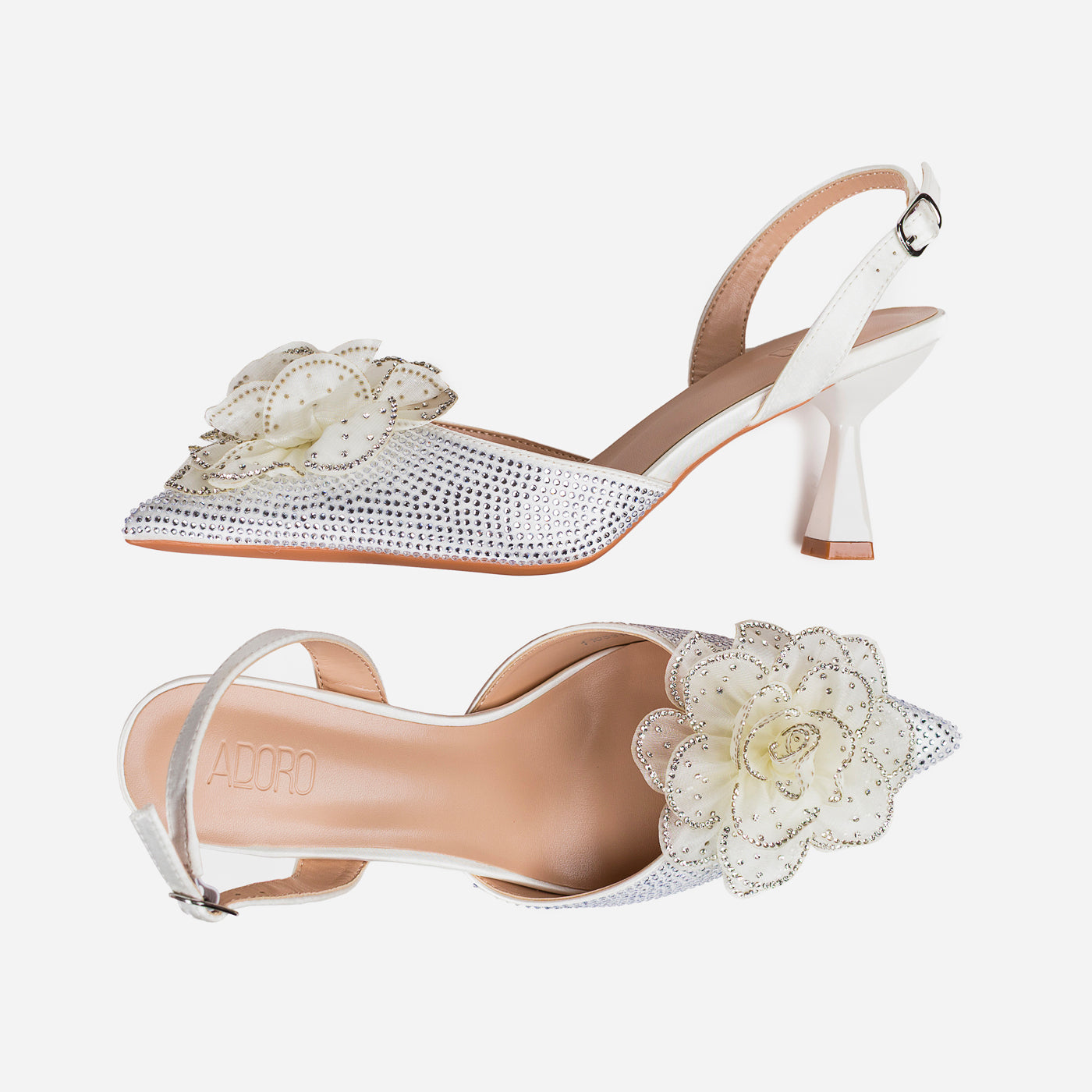 A dreamy, feminine heel crafted to turn heads. The pointed silhouette is adorned with a delicate 3D floral appliqué and shimmering crystal accents, creating a graceful blend of romance and glam. The slingback strap and sculpted heel add comfort and poise for every special step.