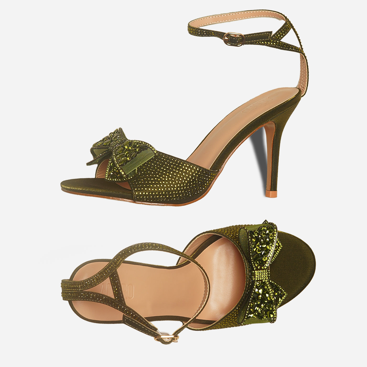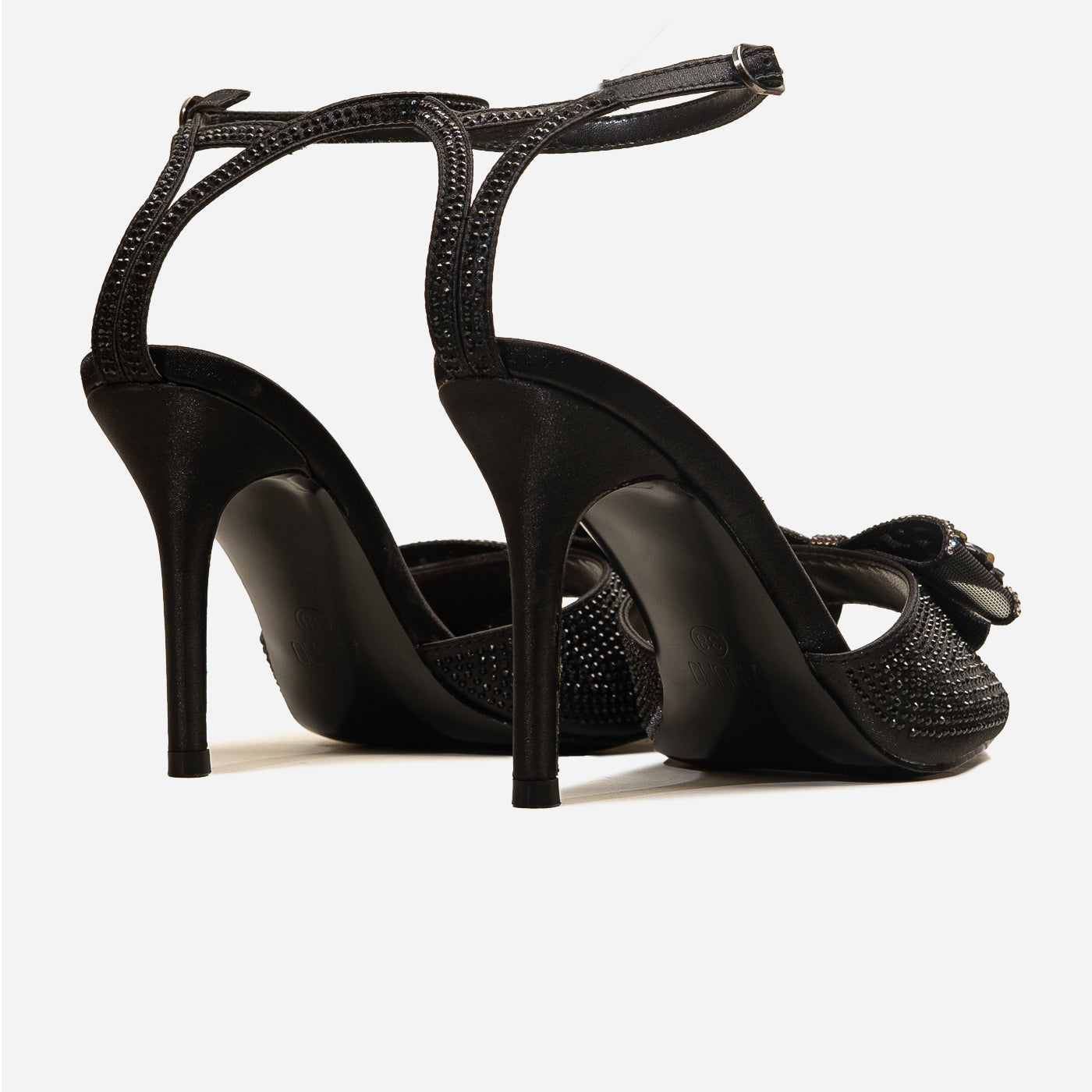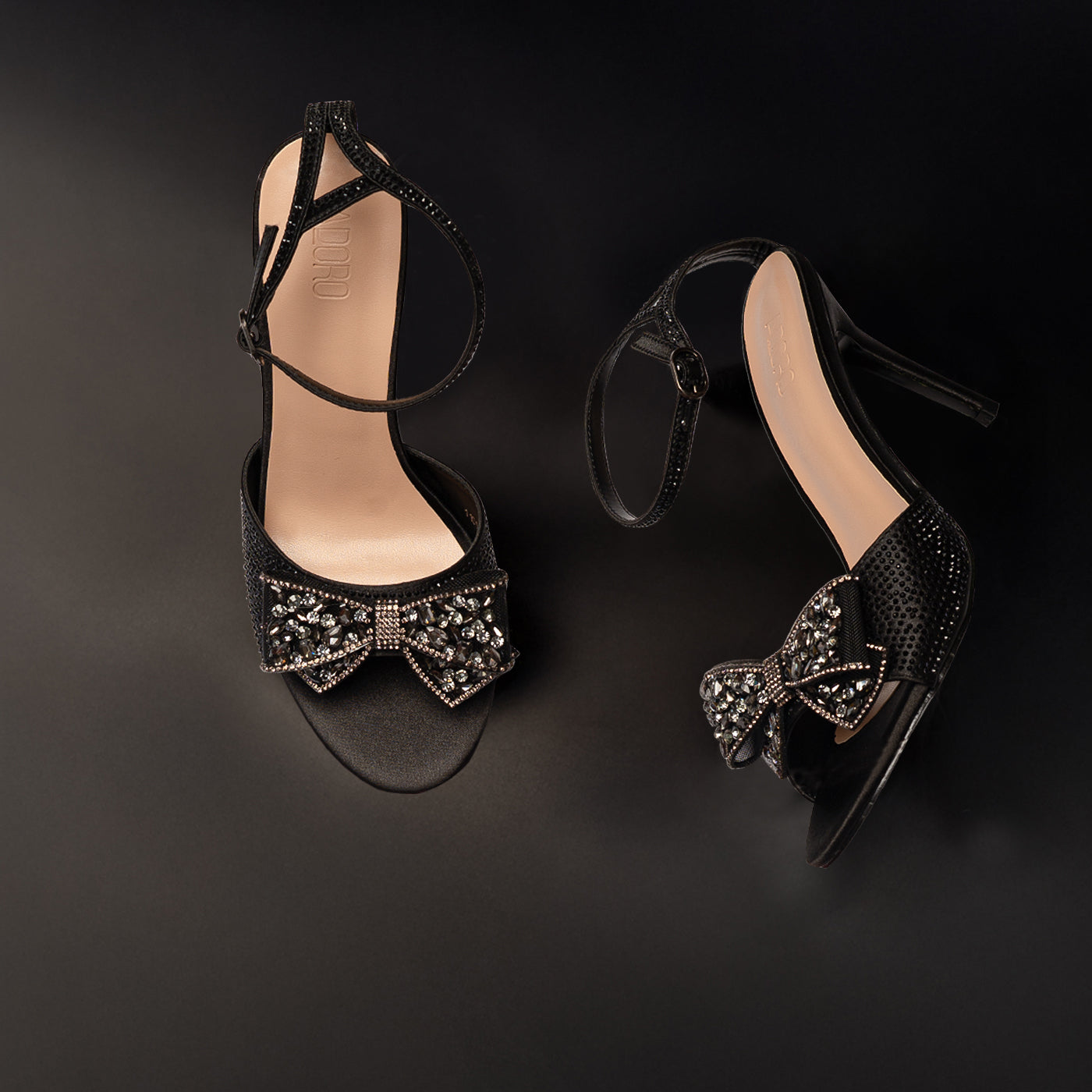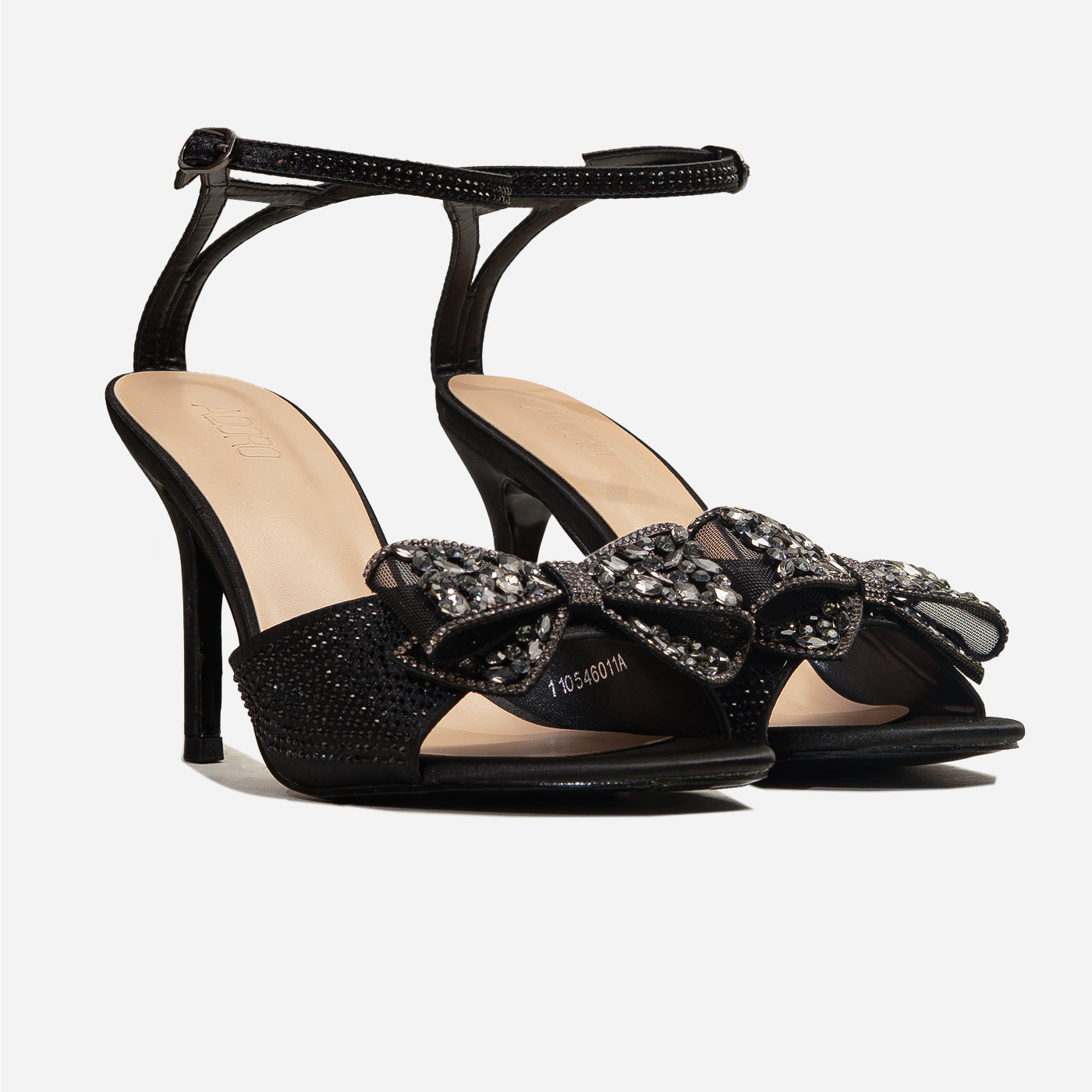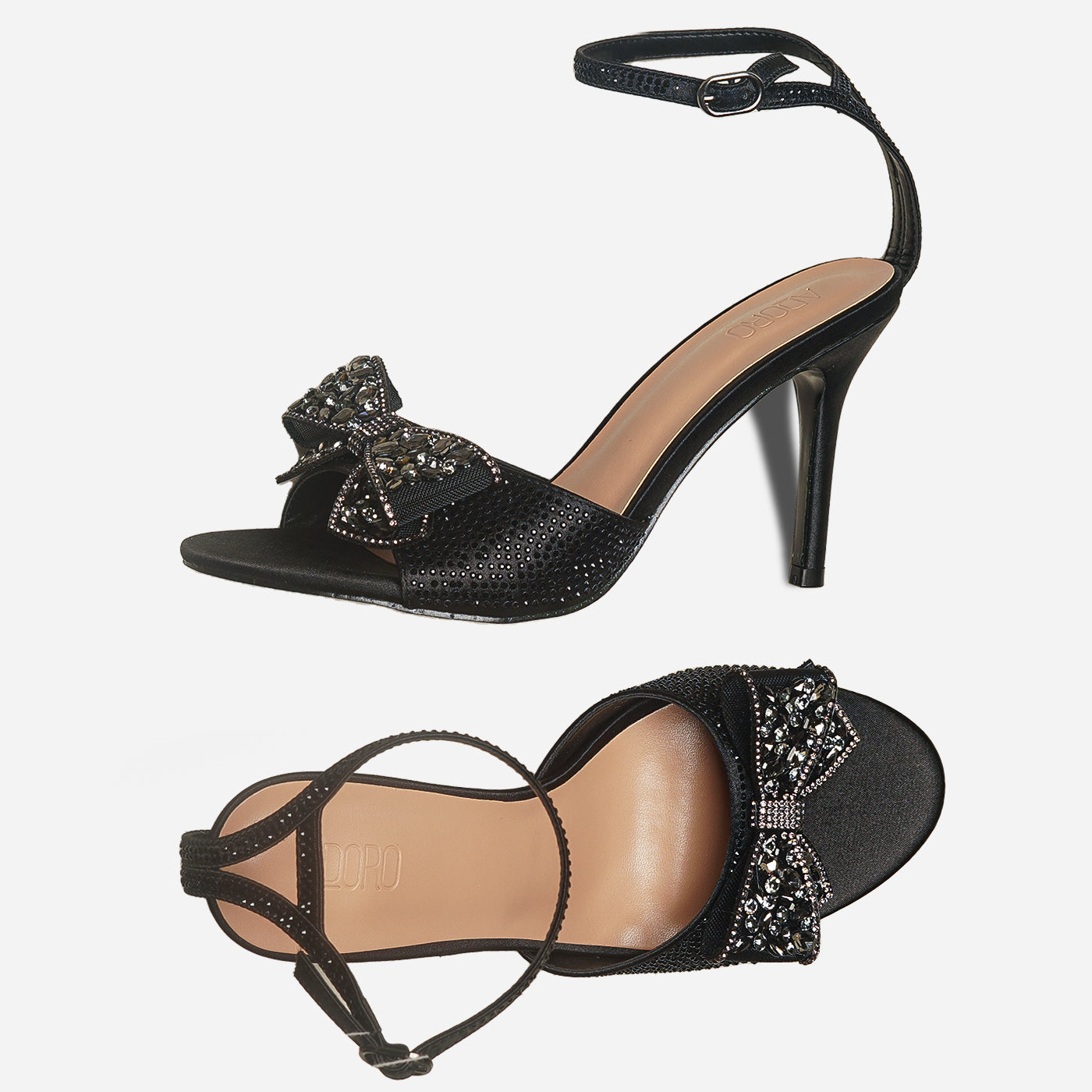 Embrace ultimate elegance with the Adoro "Noir Elegance" Party Sandals. Featuring a black glitter upper and a stunning crystal-adorned bow, these heels exude after-dark sophistication. The high stiletto heel provides a graceful lift, and the ankle strap ensures a comfortable and secure fit for all your Lahore celebrations.