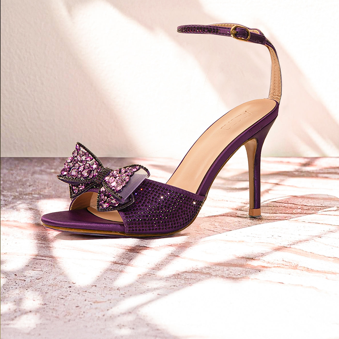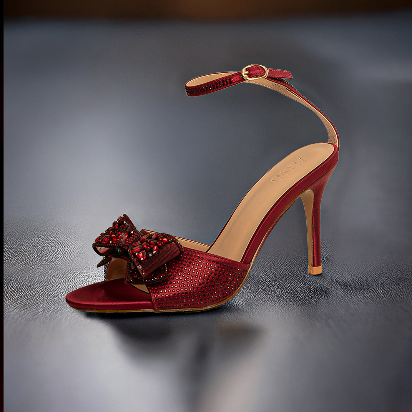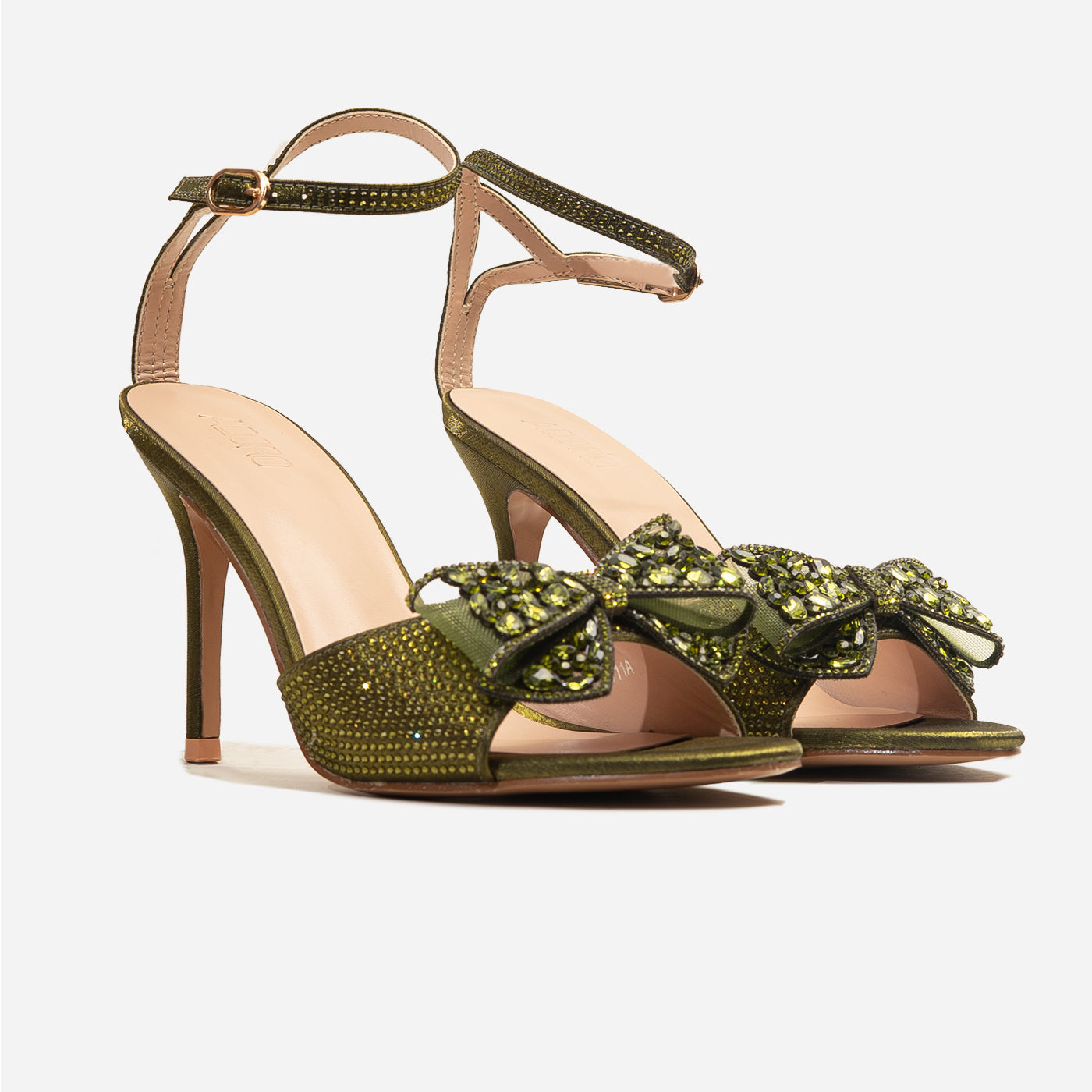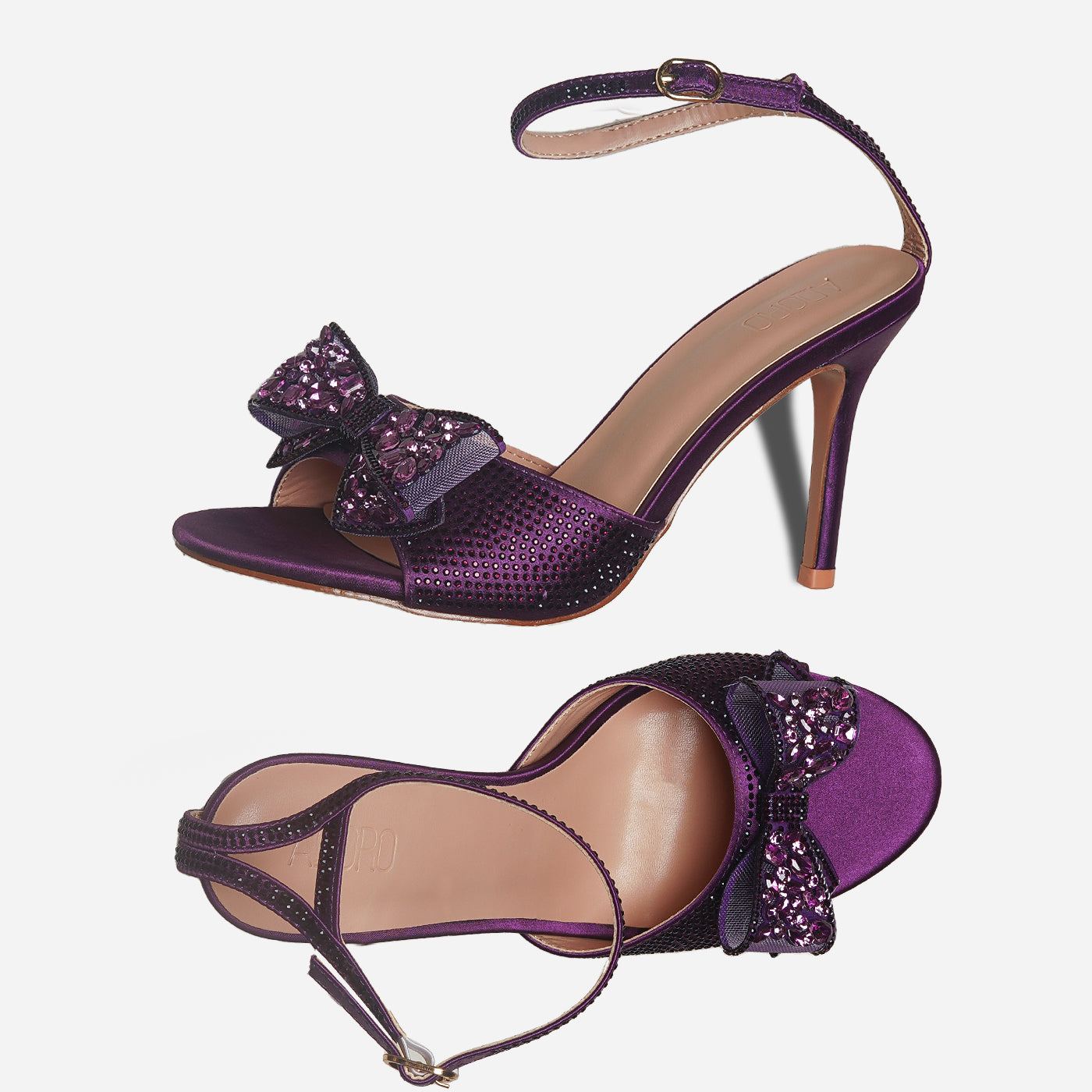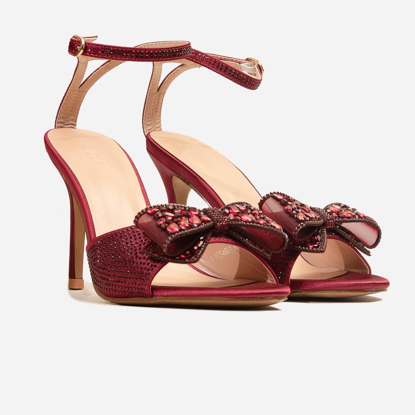 Embrace ultimate elegance with the Adoro "Noir Elegance" Party Sandals. Featuring a black glitter upper and a stunning crystal-adorned bow, these heels exude after-dark sophistication. The high stiletto heel provides a graceful lift, and the ankle strap ensures a comfortable and secure fit for all your Lahore celebrations.
