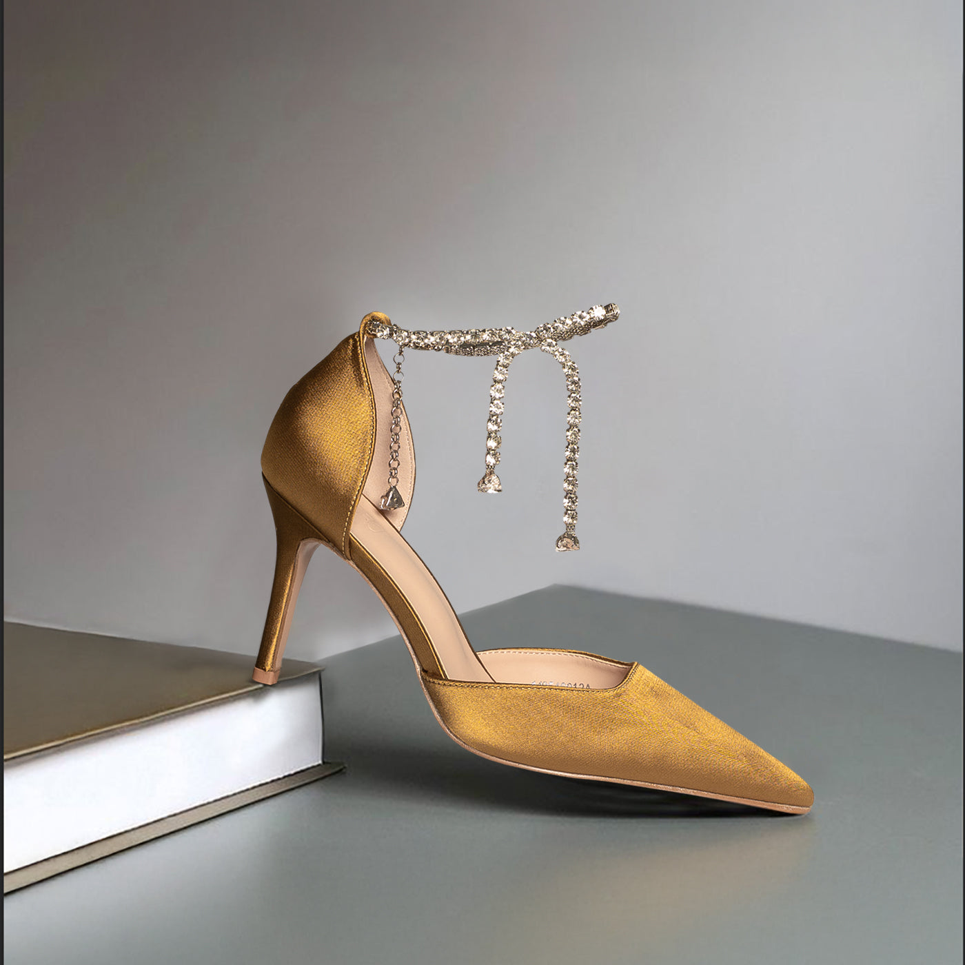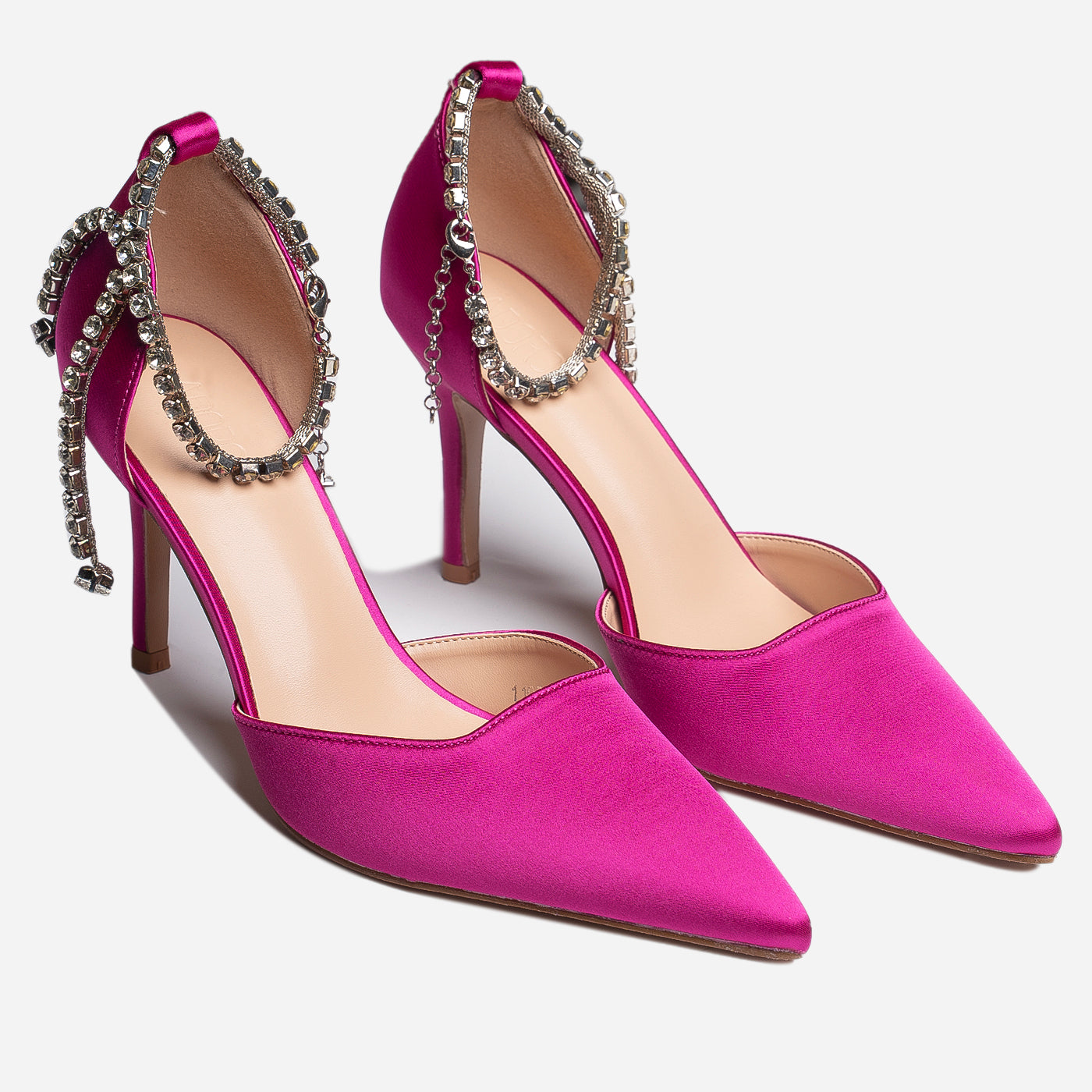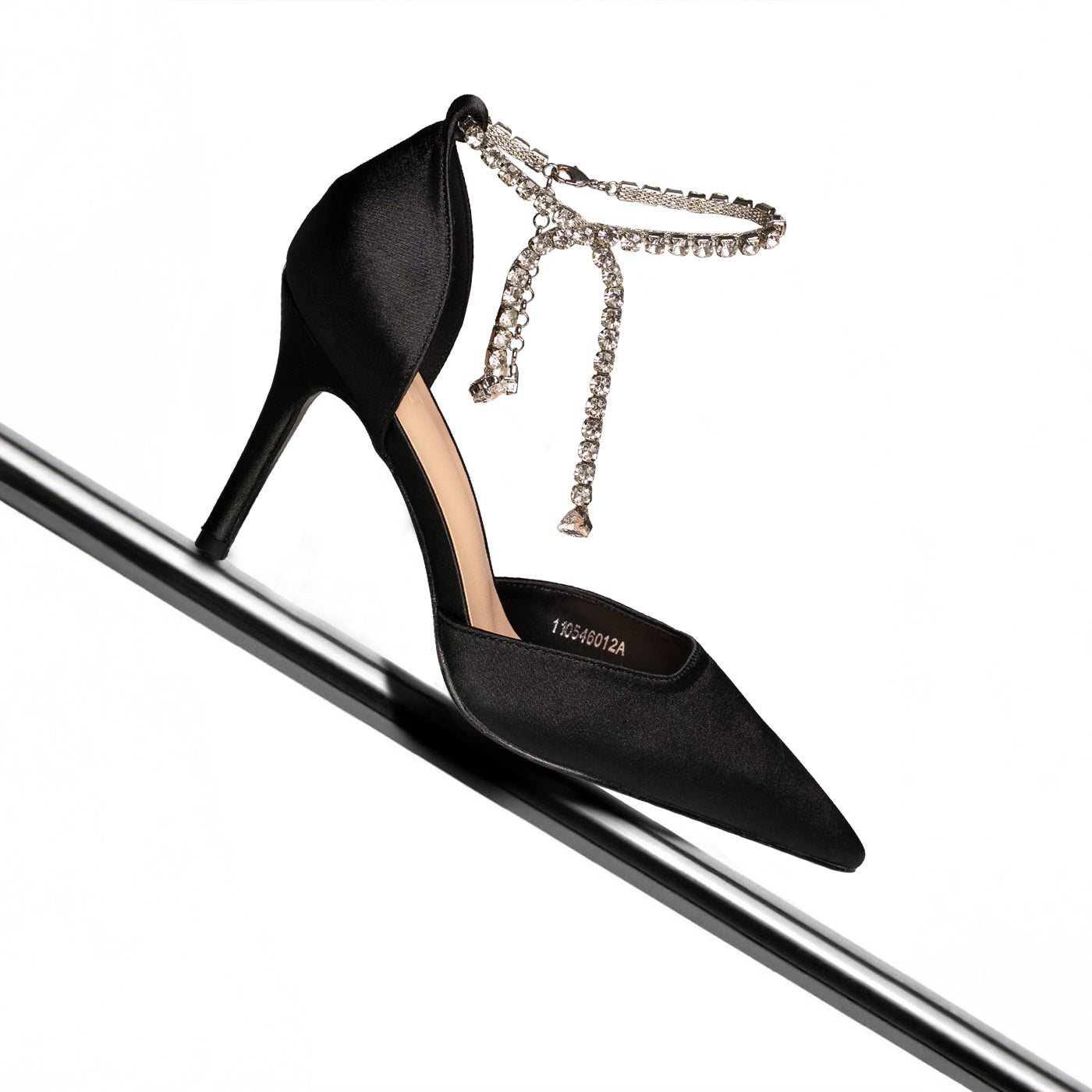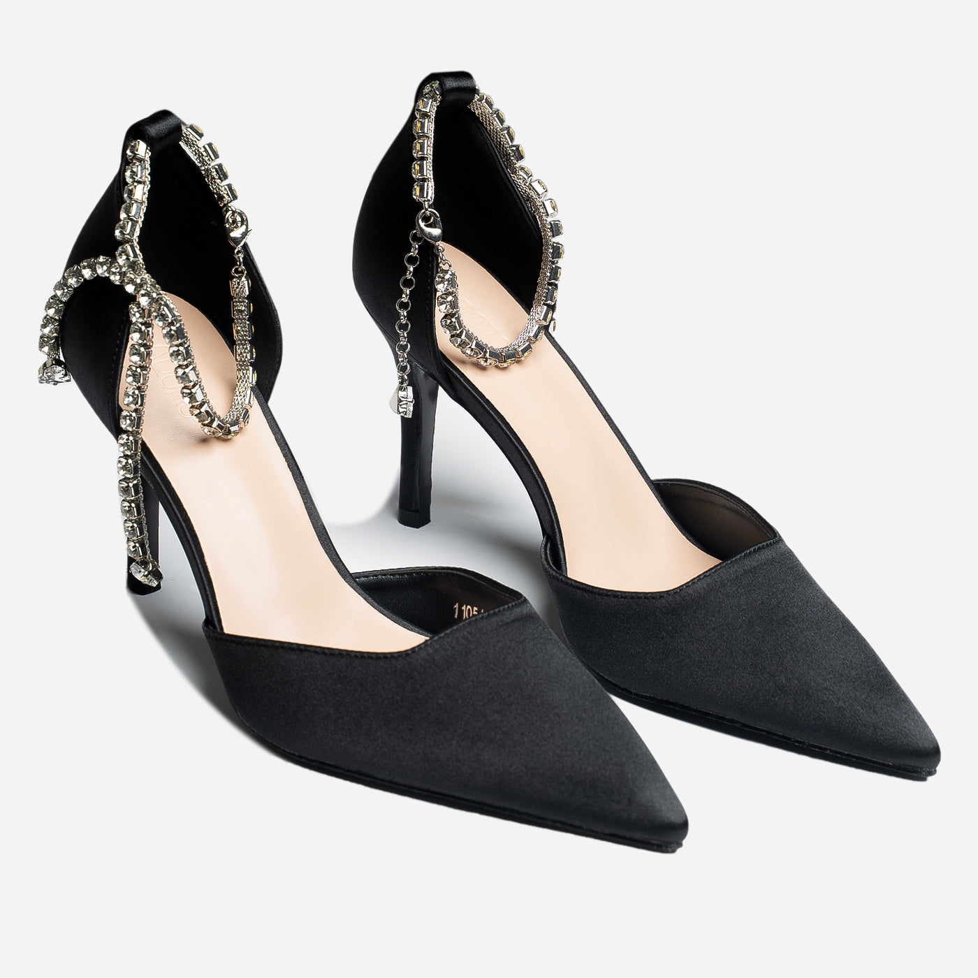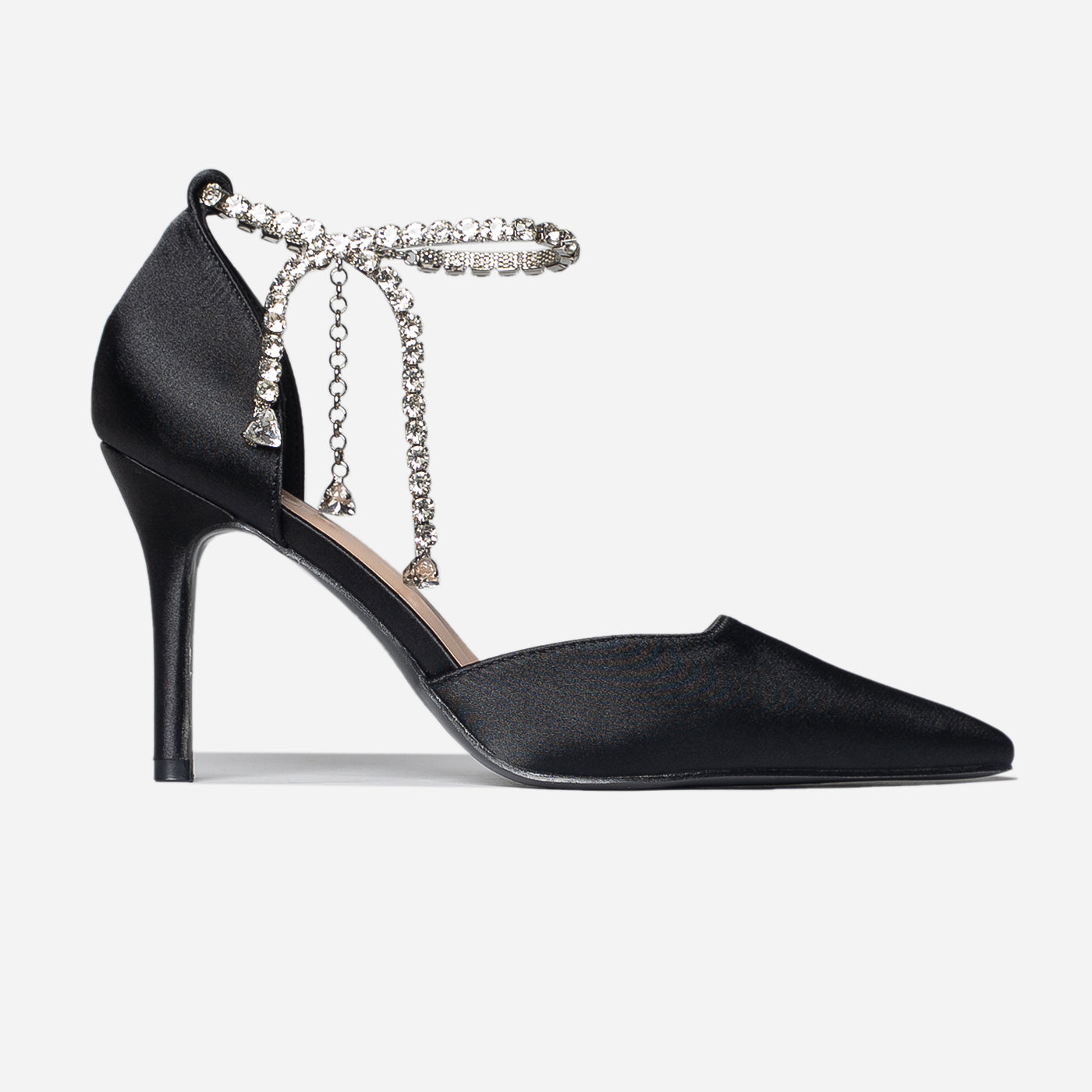 - Design: Pointed toe with draped crystal ankle detail