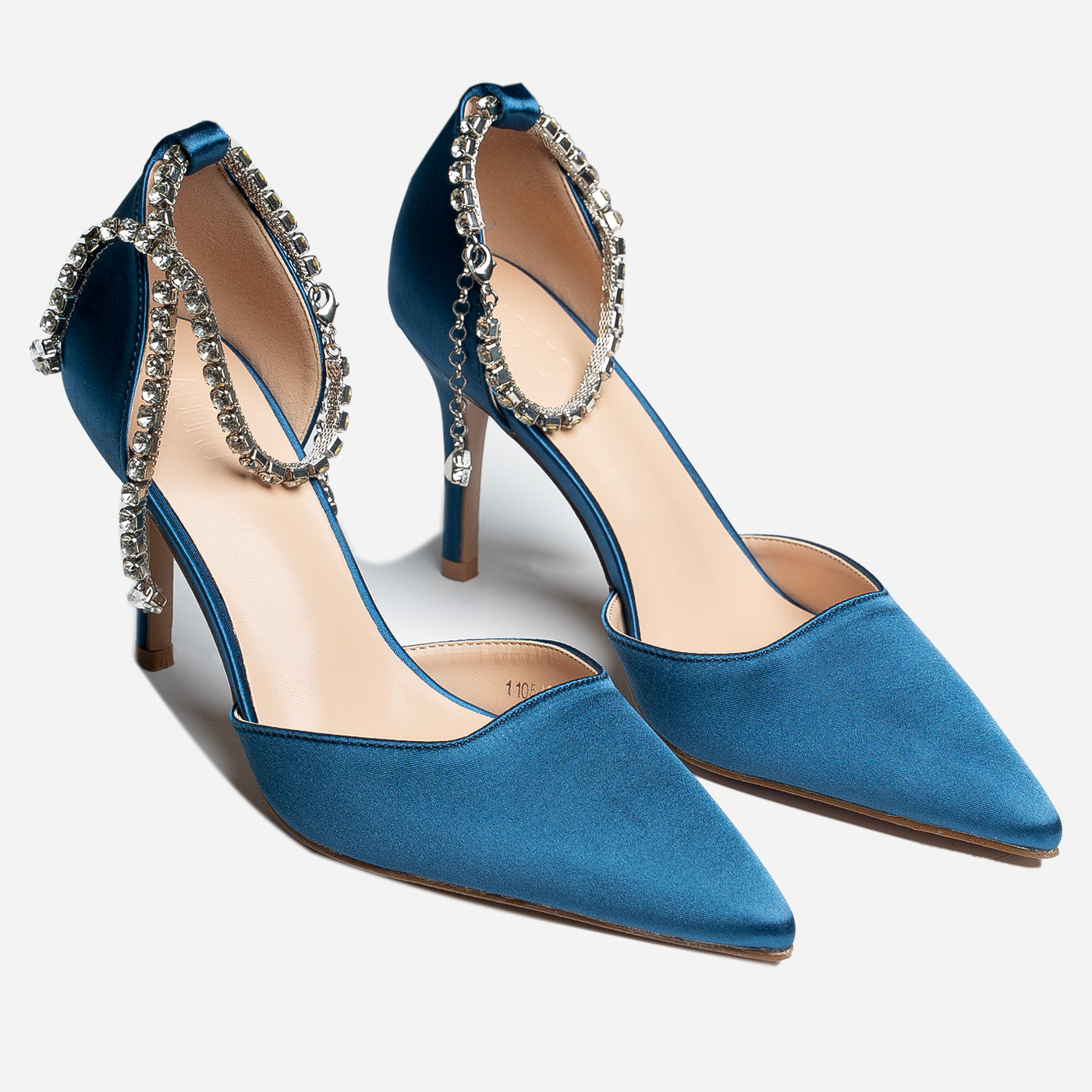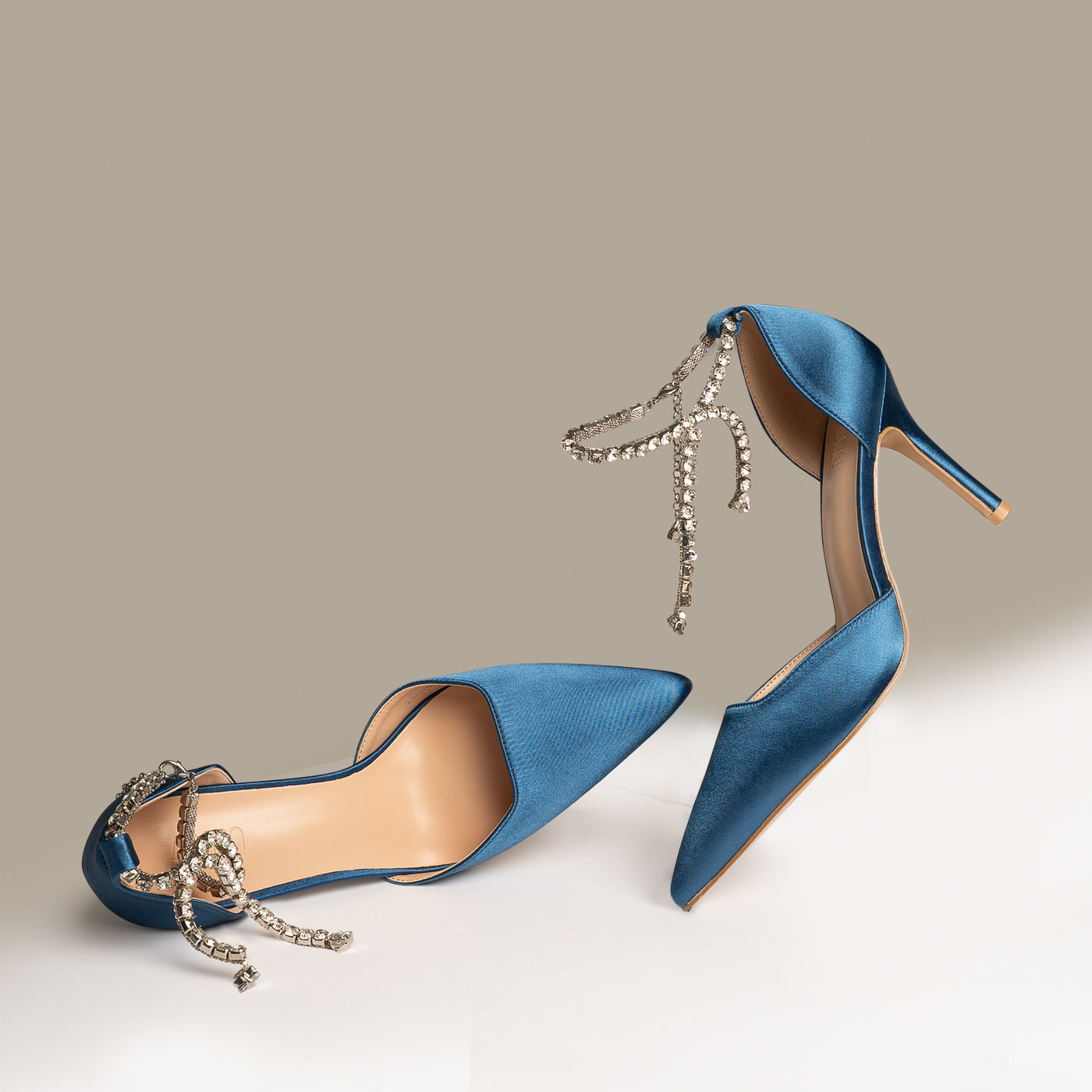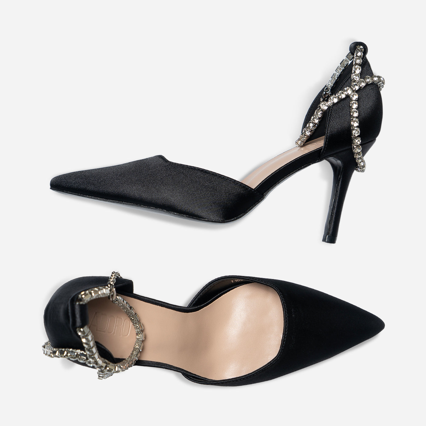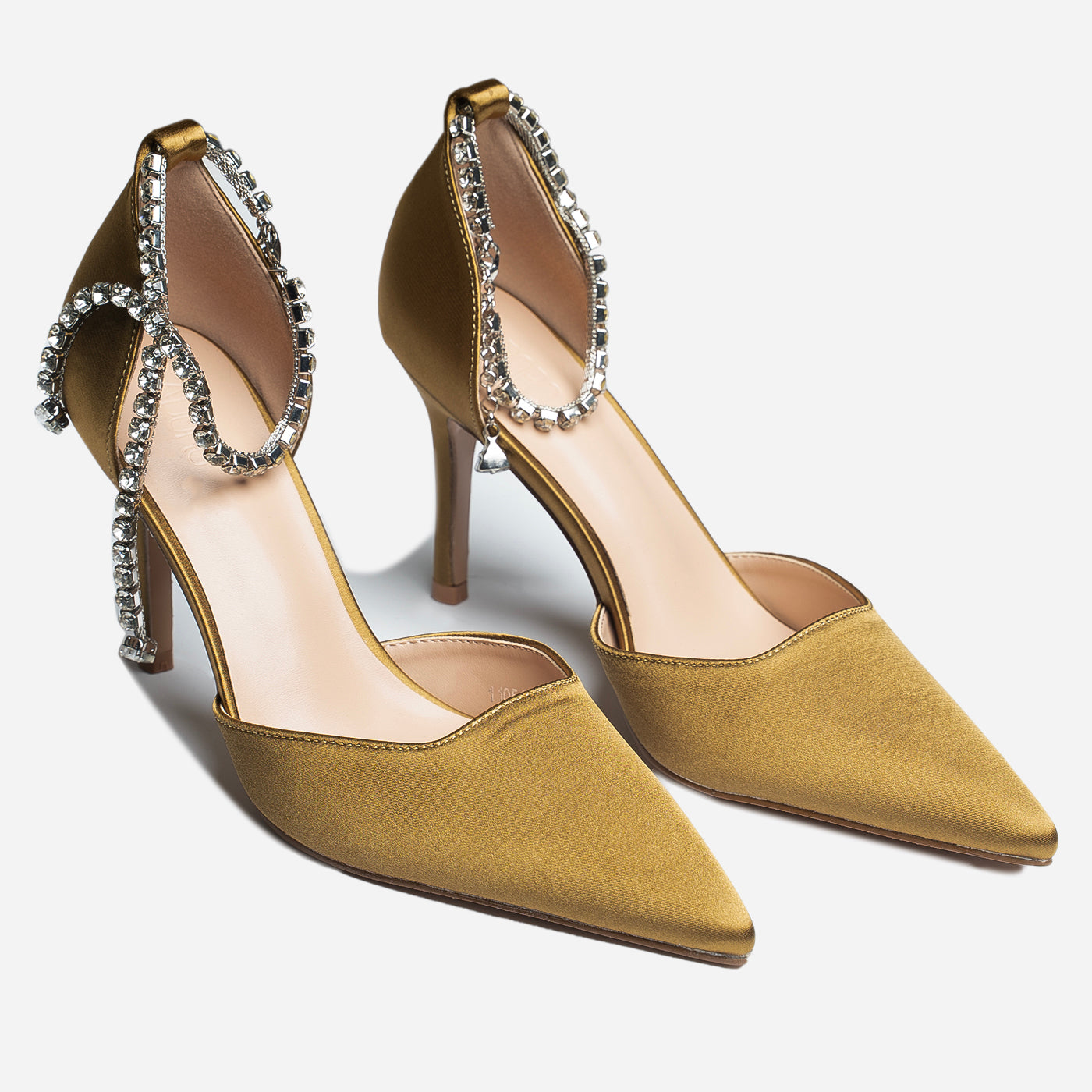 - Design: Pointed toe with draped crystal ankle detail