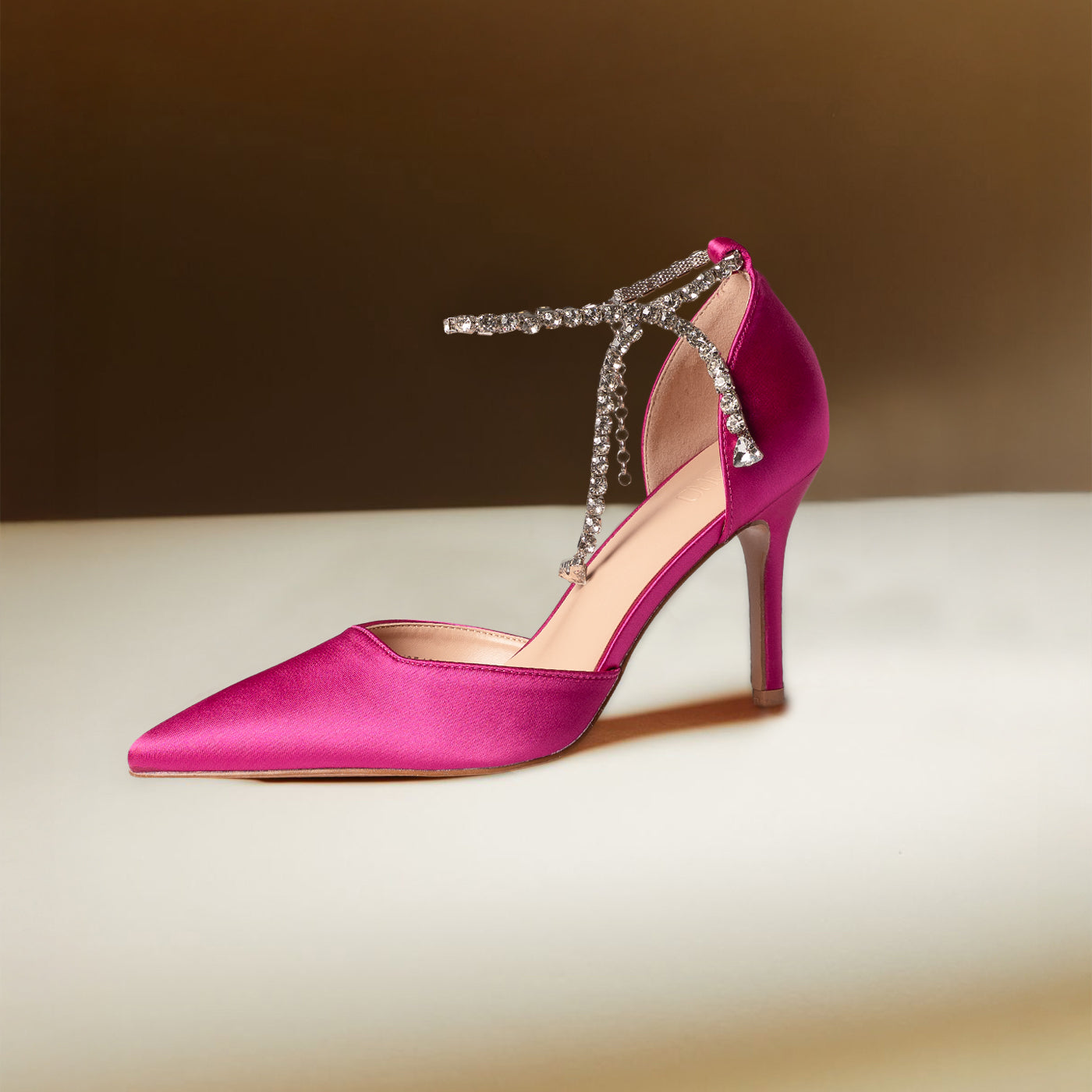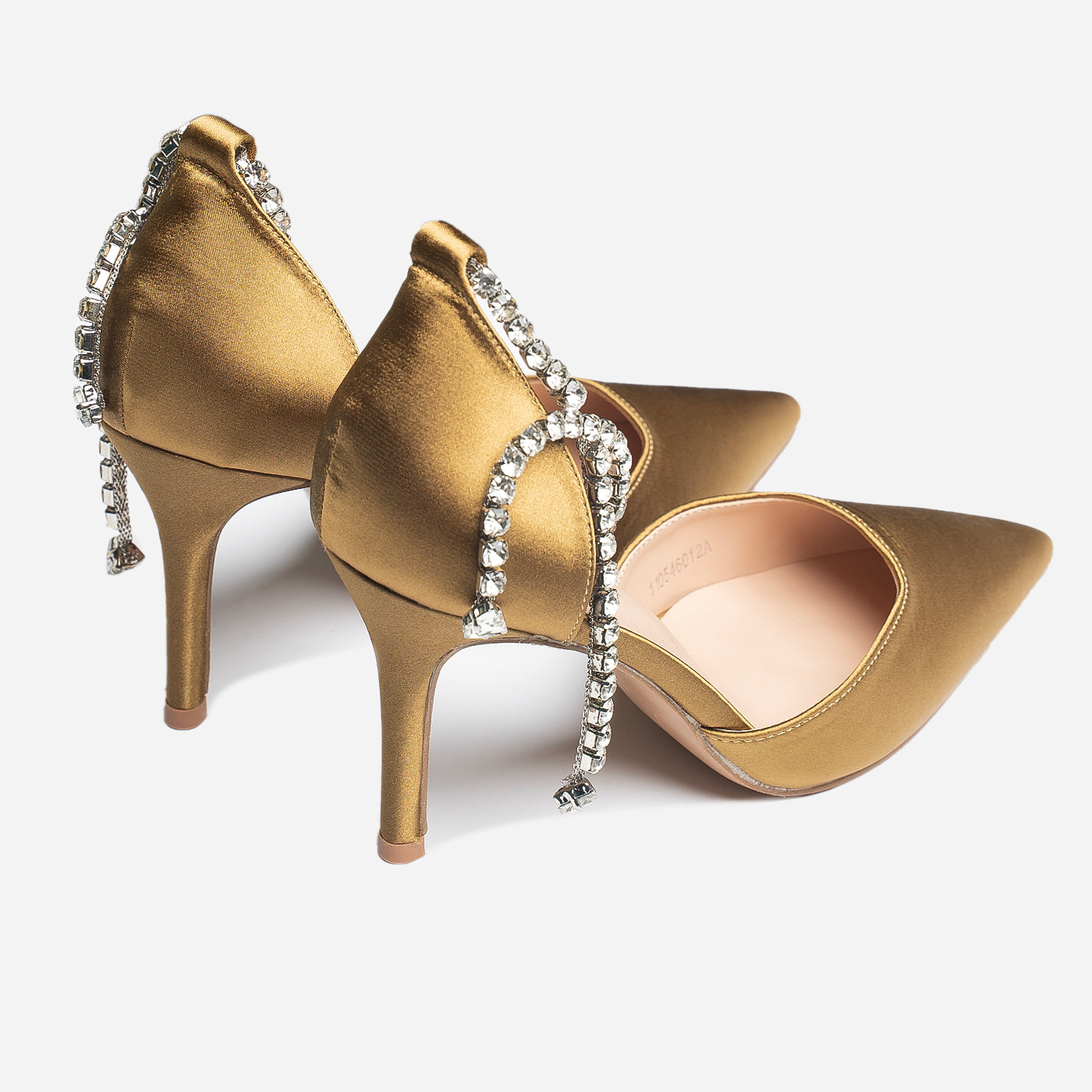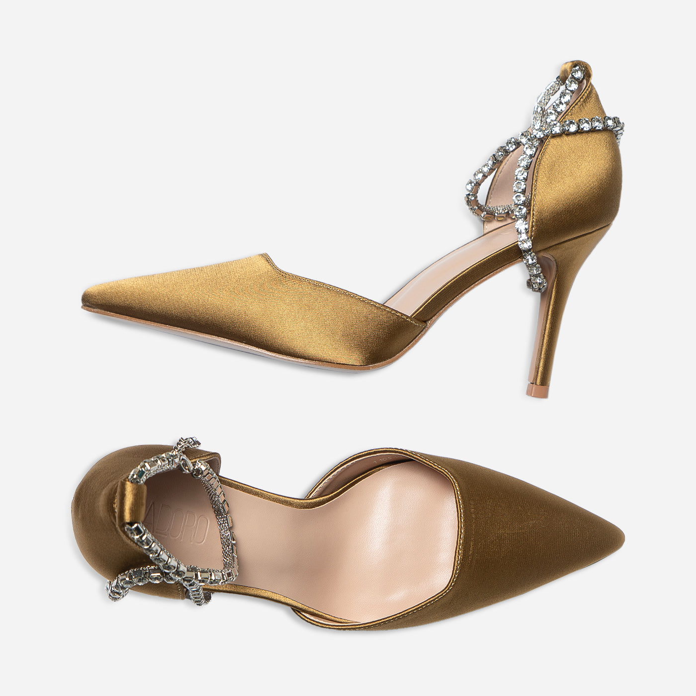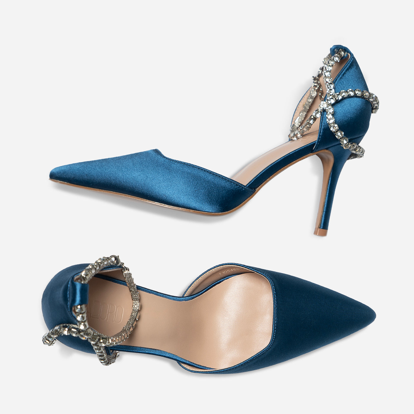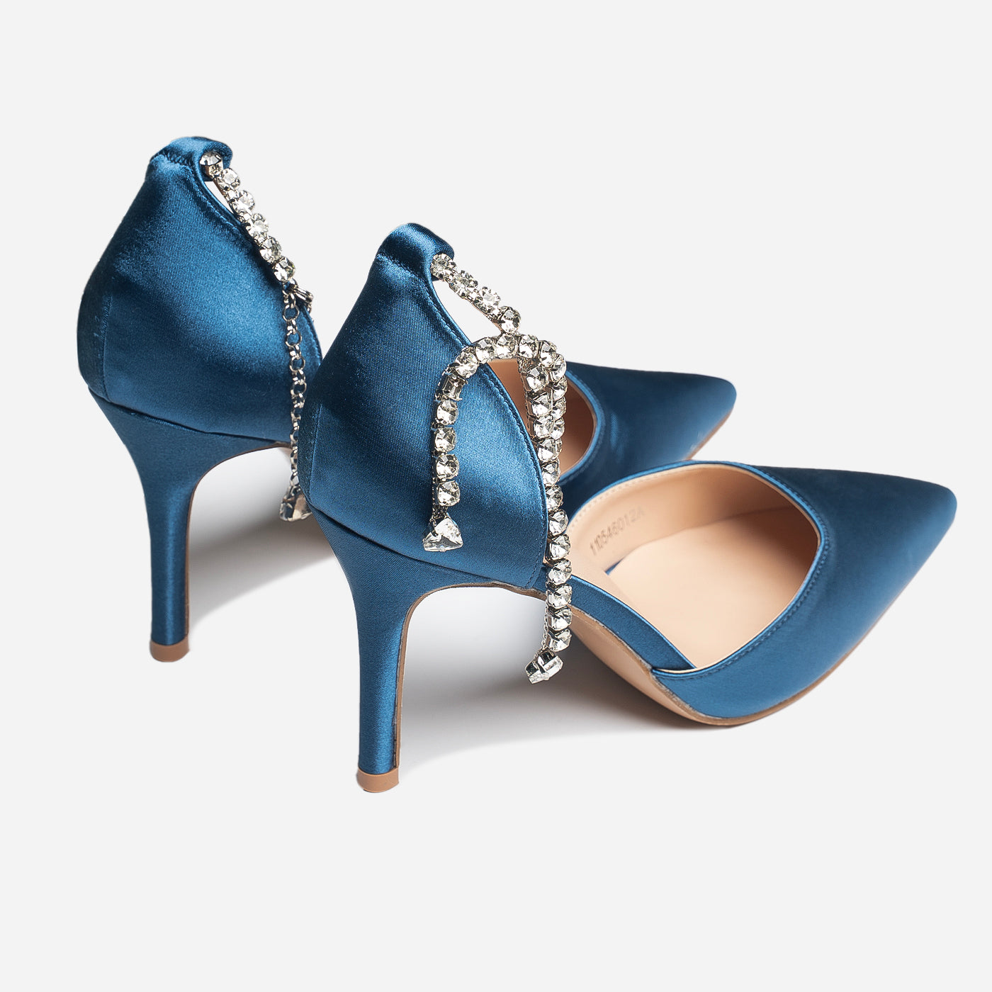 - Design: Pointed toe with draped crystal ankle detail