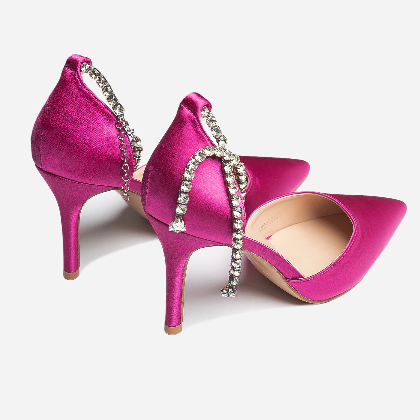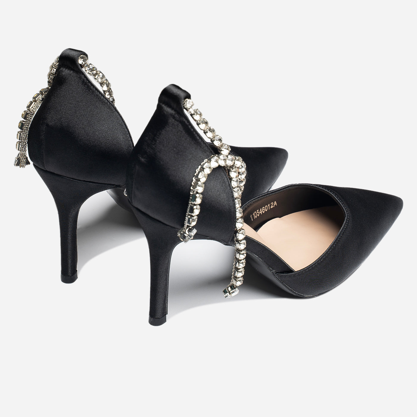 Make a striking entrance with these Crystal Chic heels, crafted to elevate evening glamour. Designed with sleek satin and adorned with sparkling crystal ankle drapes, they exude luxury and confidence. The pointed toe and slim stiletto silhouette add sharp elegance, making them the perfect pick for high-fashion nights and special occasions.