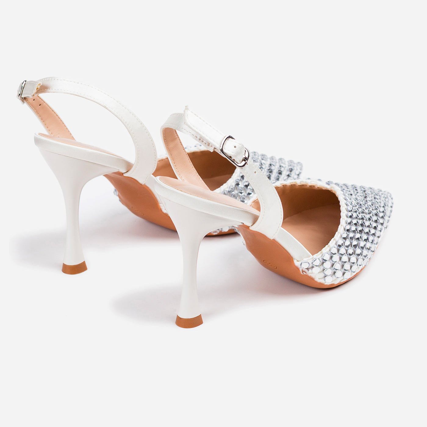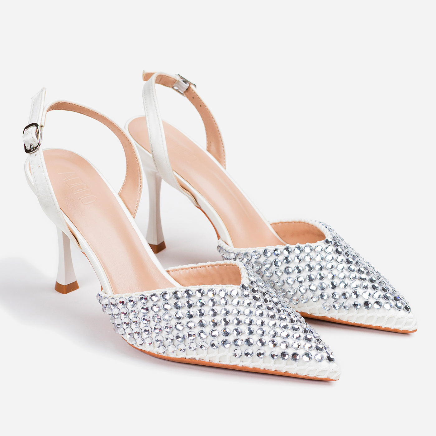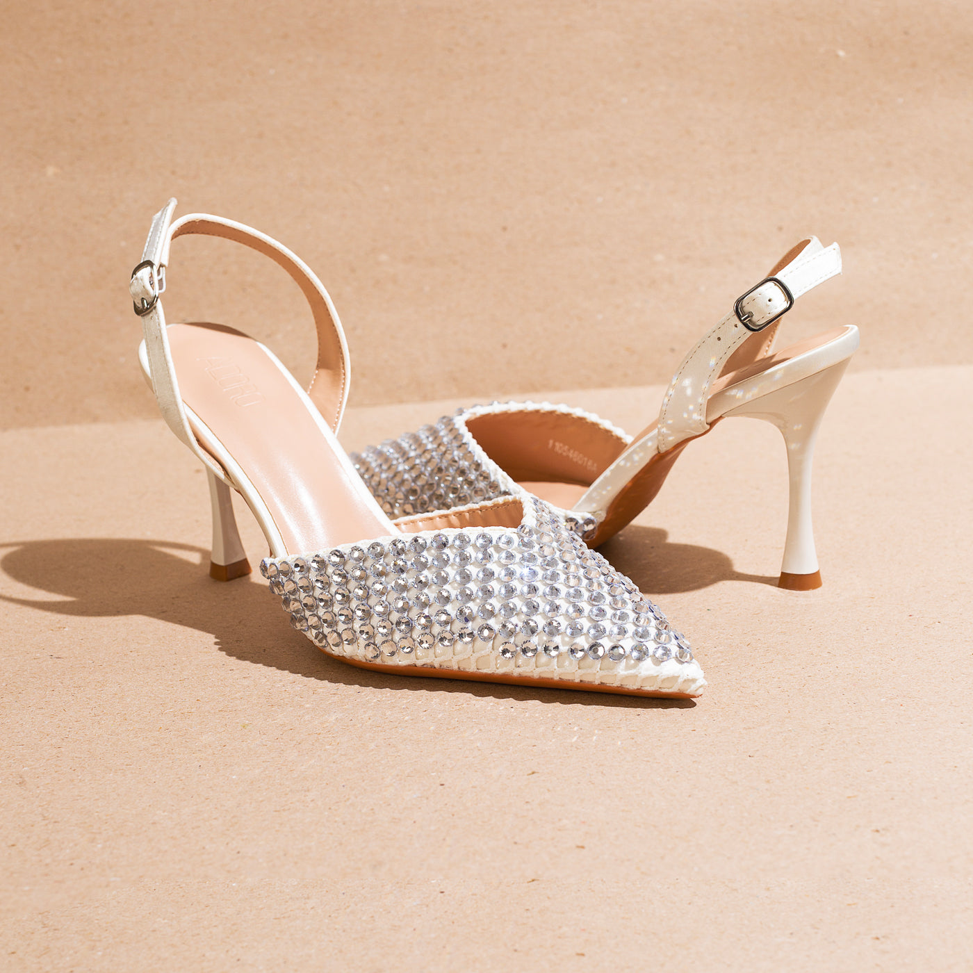 Radiant, polished, and designed to stand out these heels bring effortless refinement to every step. The shimmering pointed toe catches the light beautifully, while the sculpted silhouette adds a poised lift that enhances your stride. A standout embellishment at the front introduces a couture inspired touch, making the design visually striking without being overpowering.