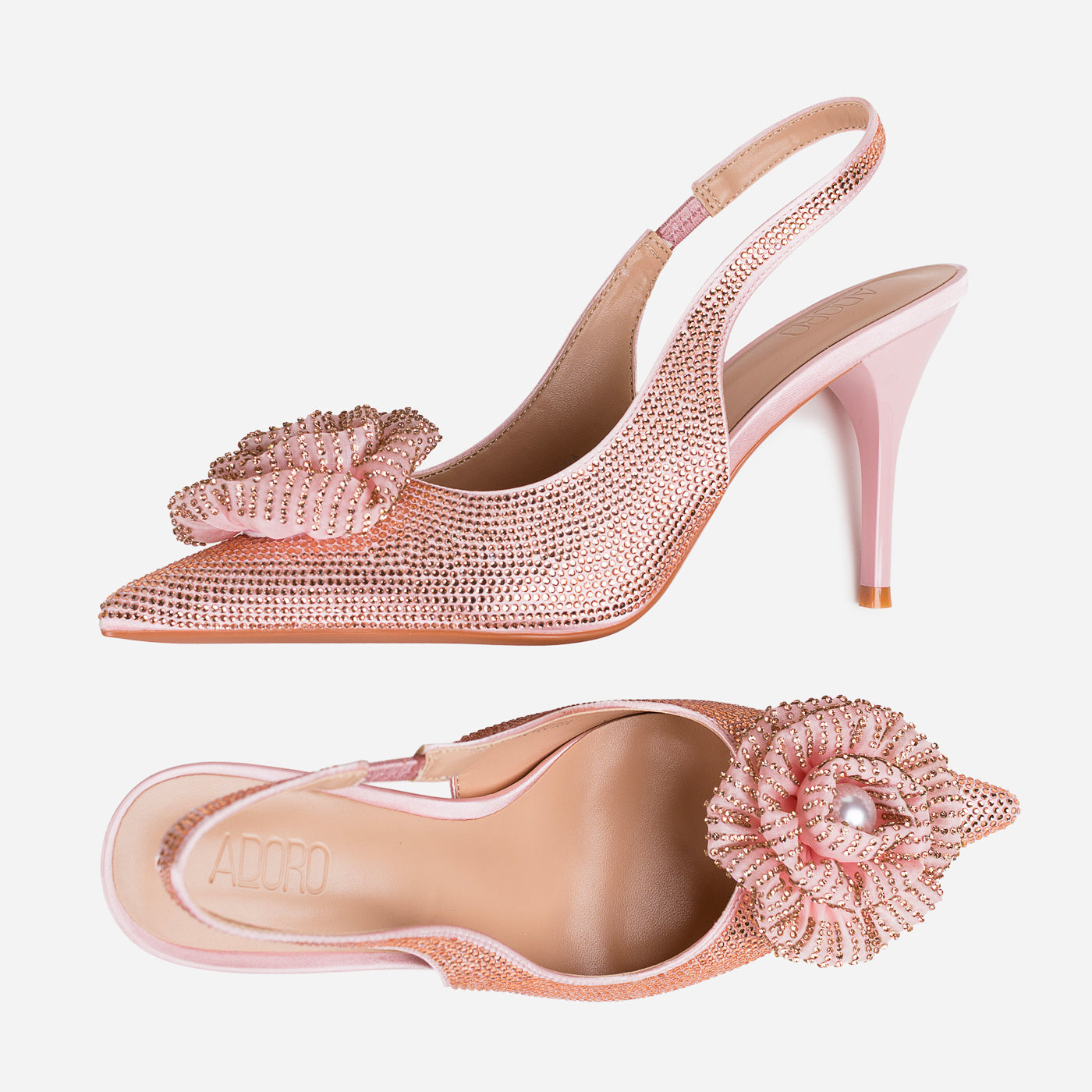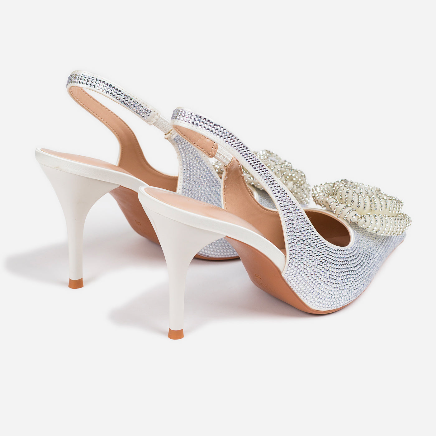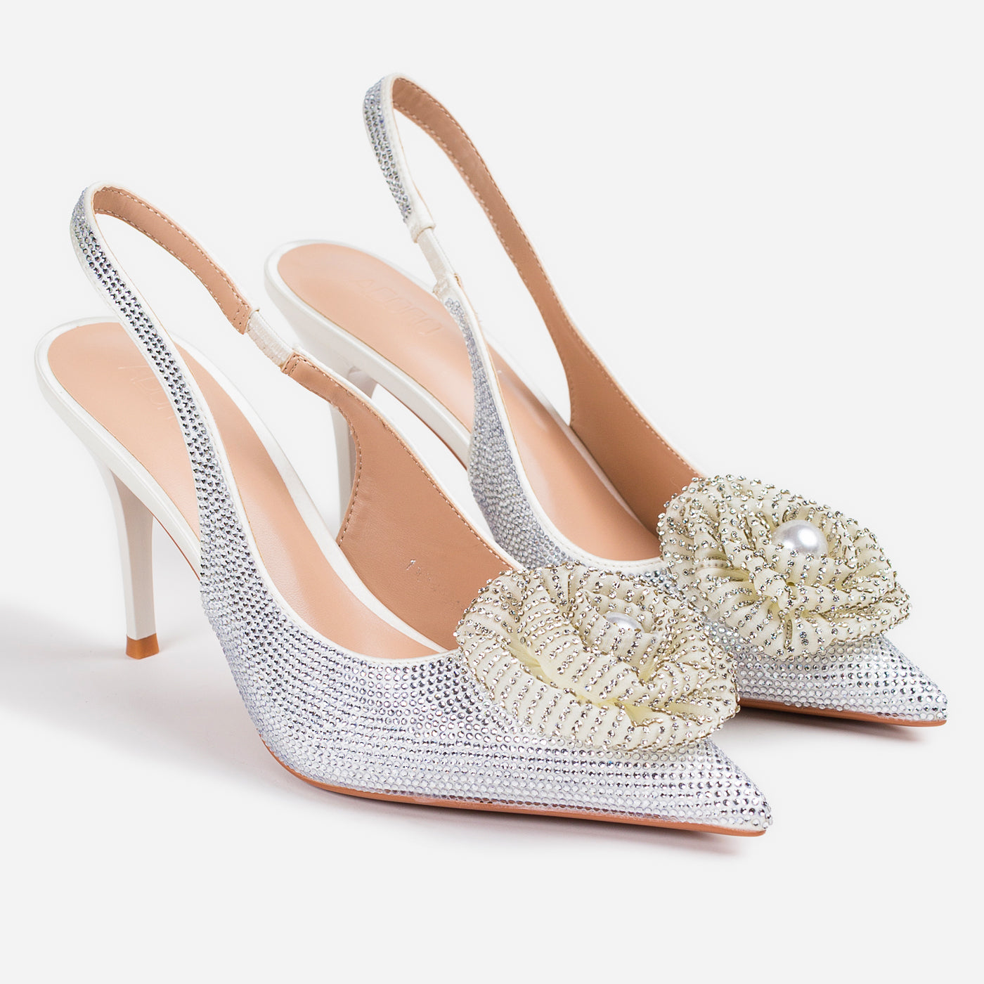 Elegance meets glamour in these dazzling sling-back heels, crafted to make every step shine. A statement floral embellishment with a pearl center adds a luxurious touch, while the shimmering finish exudes refined celebration-ready charm.