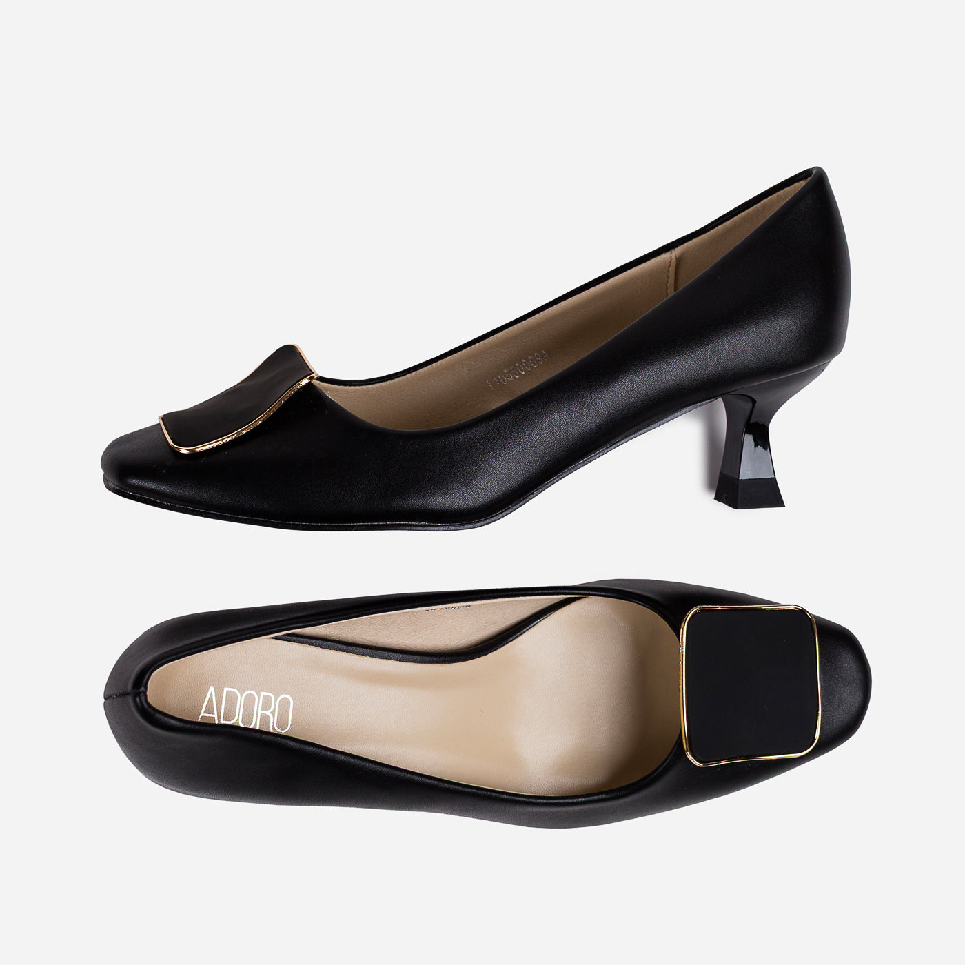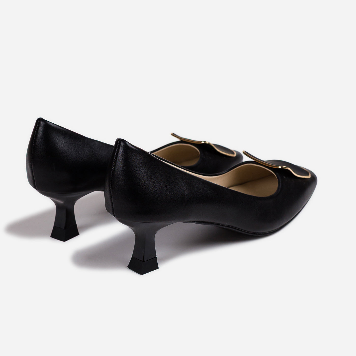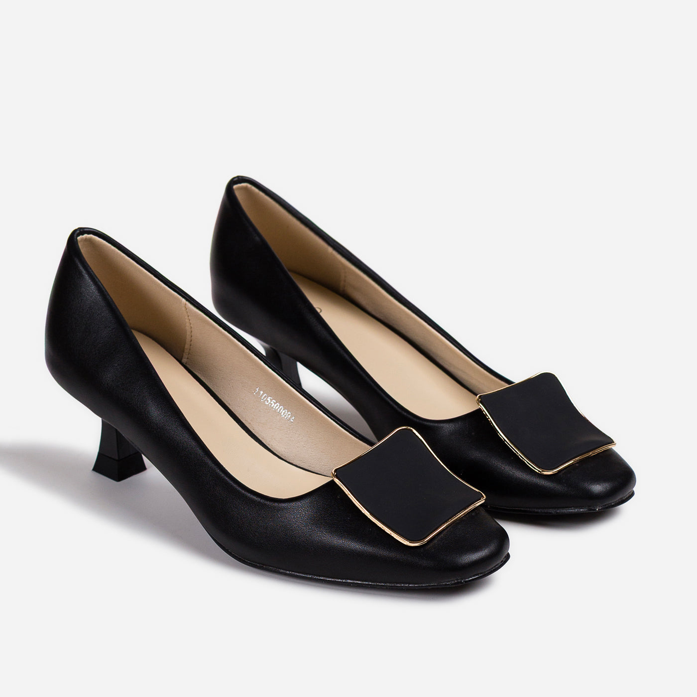- Design: Round-toe pumps with statement square buckle