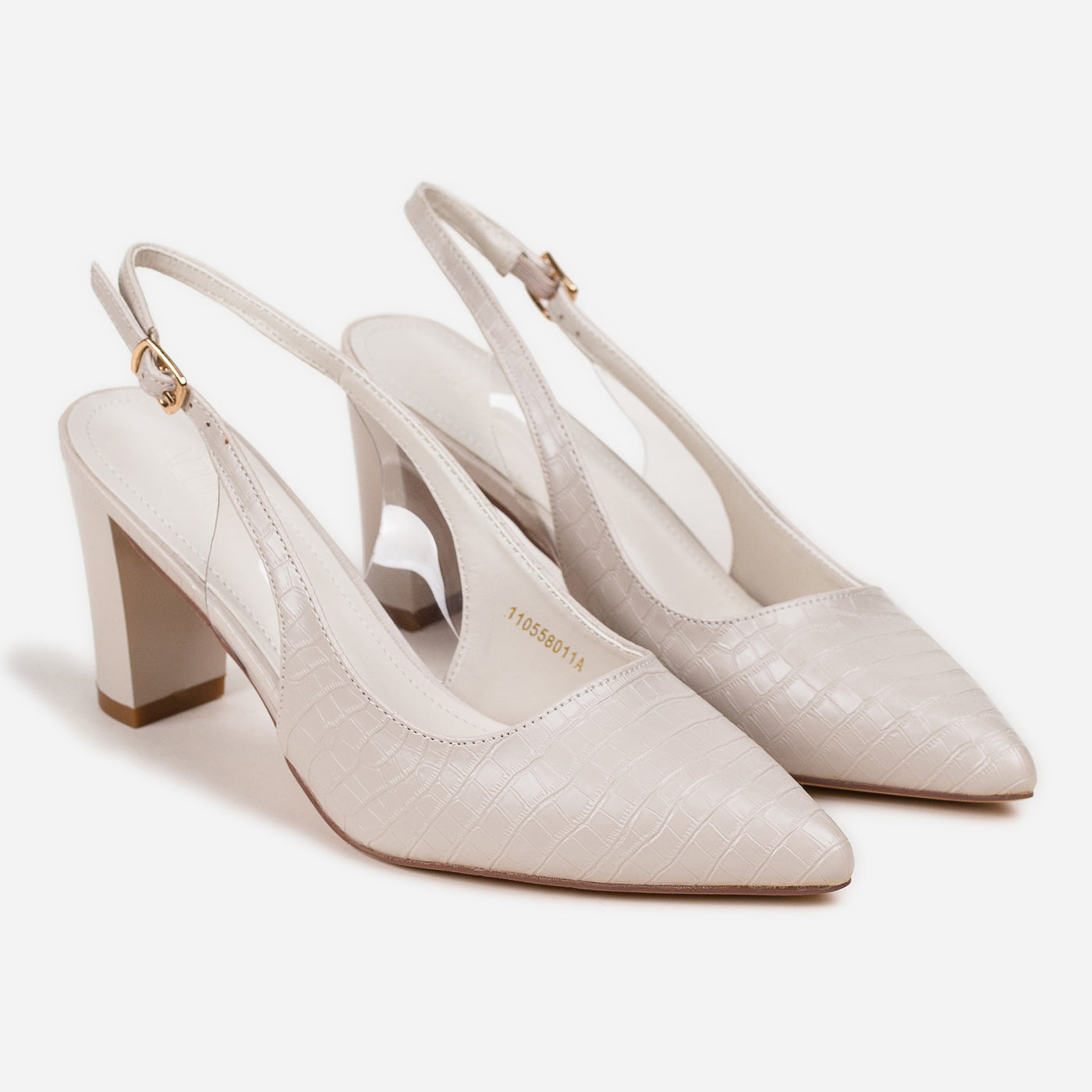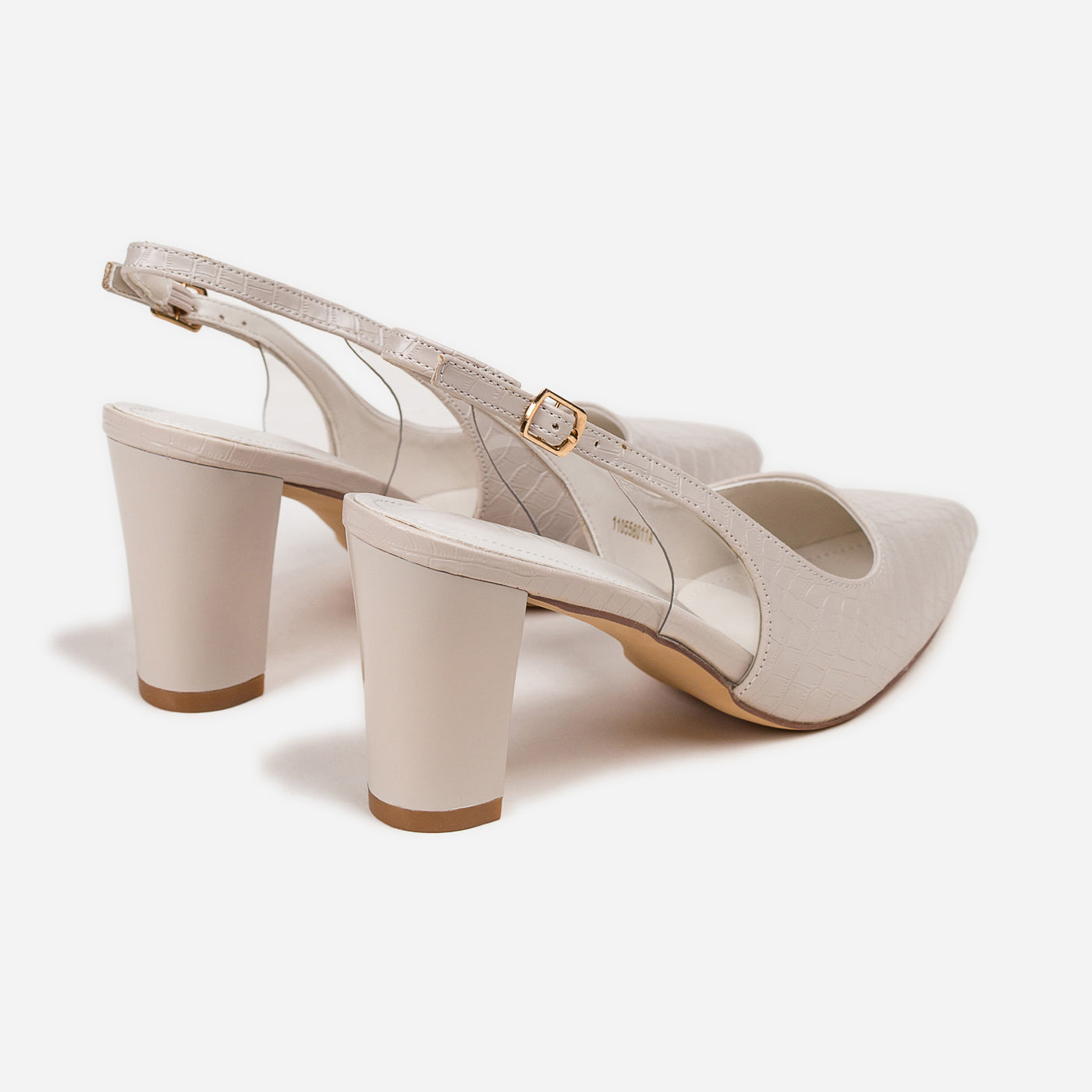 Grace refined to its purest form. The Eterna Sling heel in porcelain croc-embossed texture embodies architectural precision and timeless femininity. Its sharply pointed toe and sculpted block heel create a harmonious balance between confidence and composure. A delicate gold buckle accentuates the minimal silhouette, while the supple interior ensures effortless wear. Poised, polished, and eternally elegant — Eterna Sling is where contemporary design meets enduring grace.