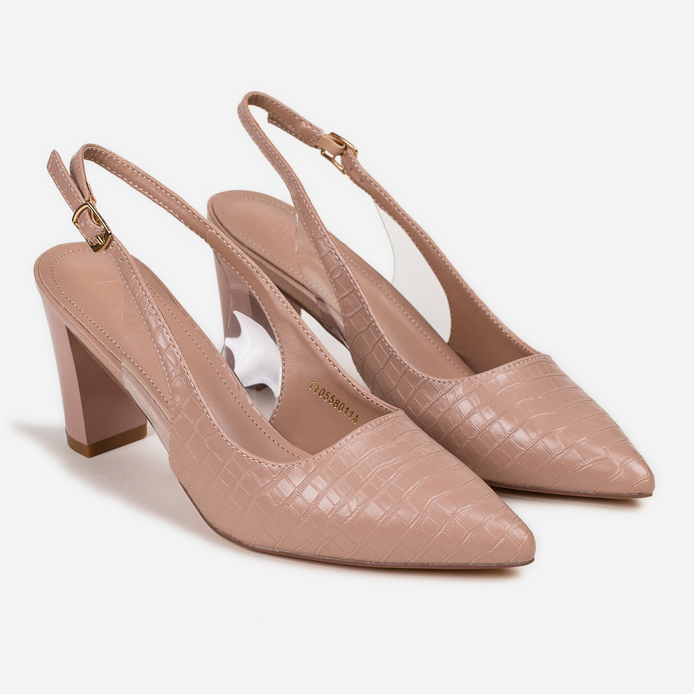 Sleek, sculptural, and endlessly refined — the Eterna Sling heel embodies the essence of modern femininity. Wrapped in a soft nude croc-embossed texture, it strikes the perfect balance between structure and grace. The pointed toe elongates the silhouette, while the block heel and slender slingback strap offer timeless comfort with contemporary poise. Subtle yet commanding, this piece transitions seamlessly from polished daylight elegance to evening allure — Eterna, where confidence takes form.