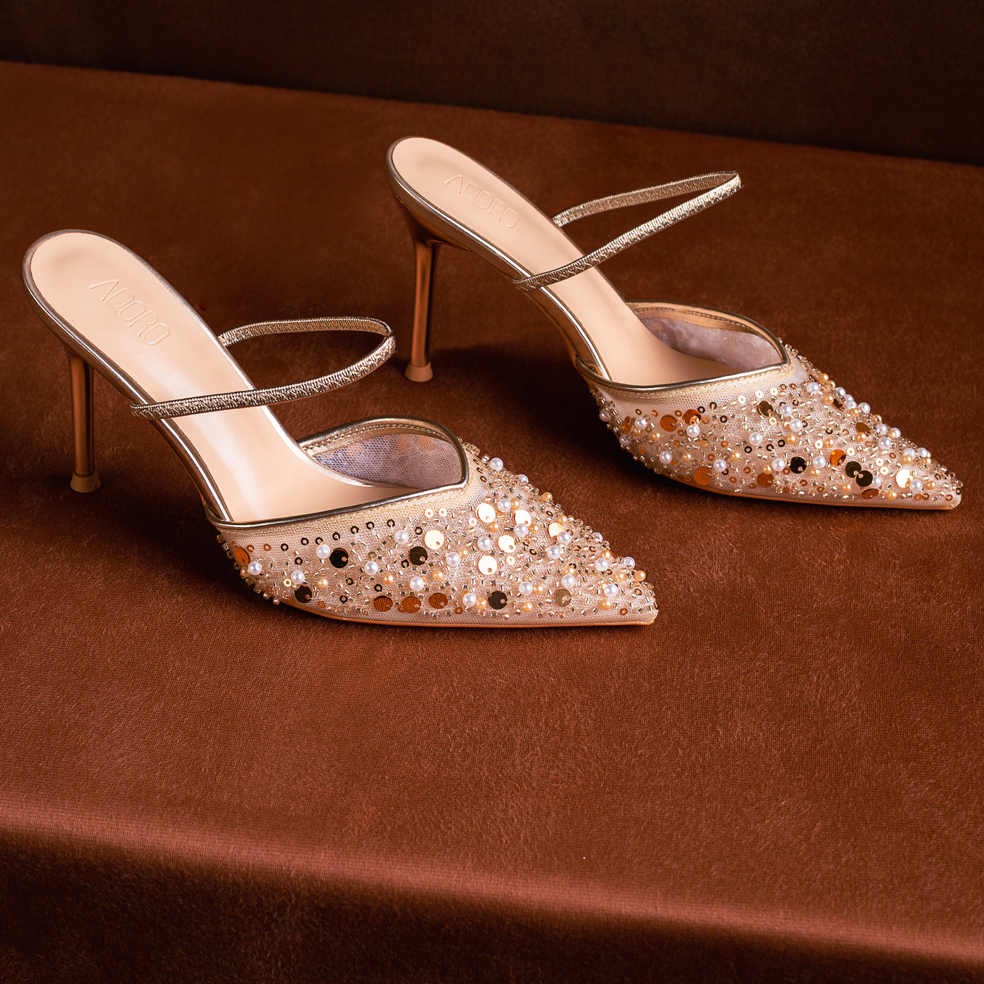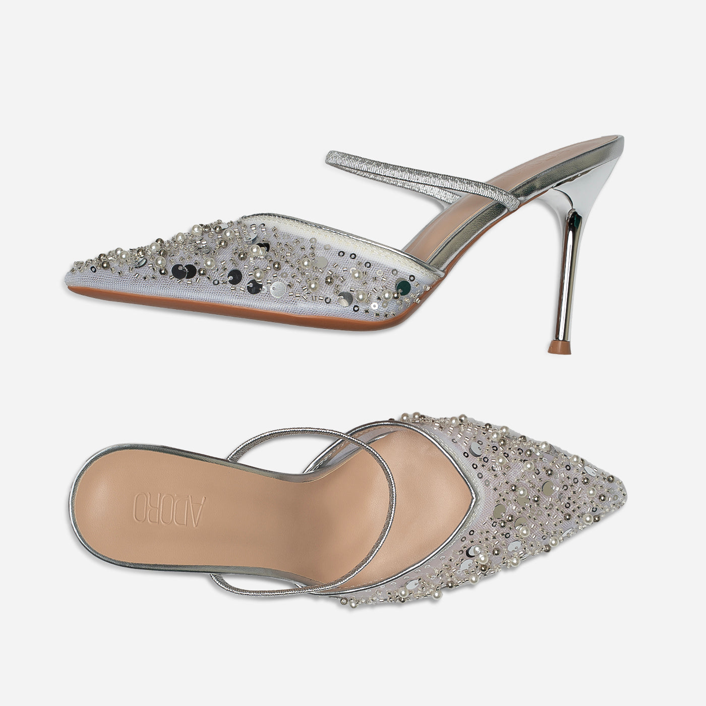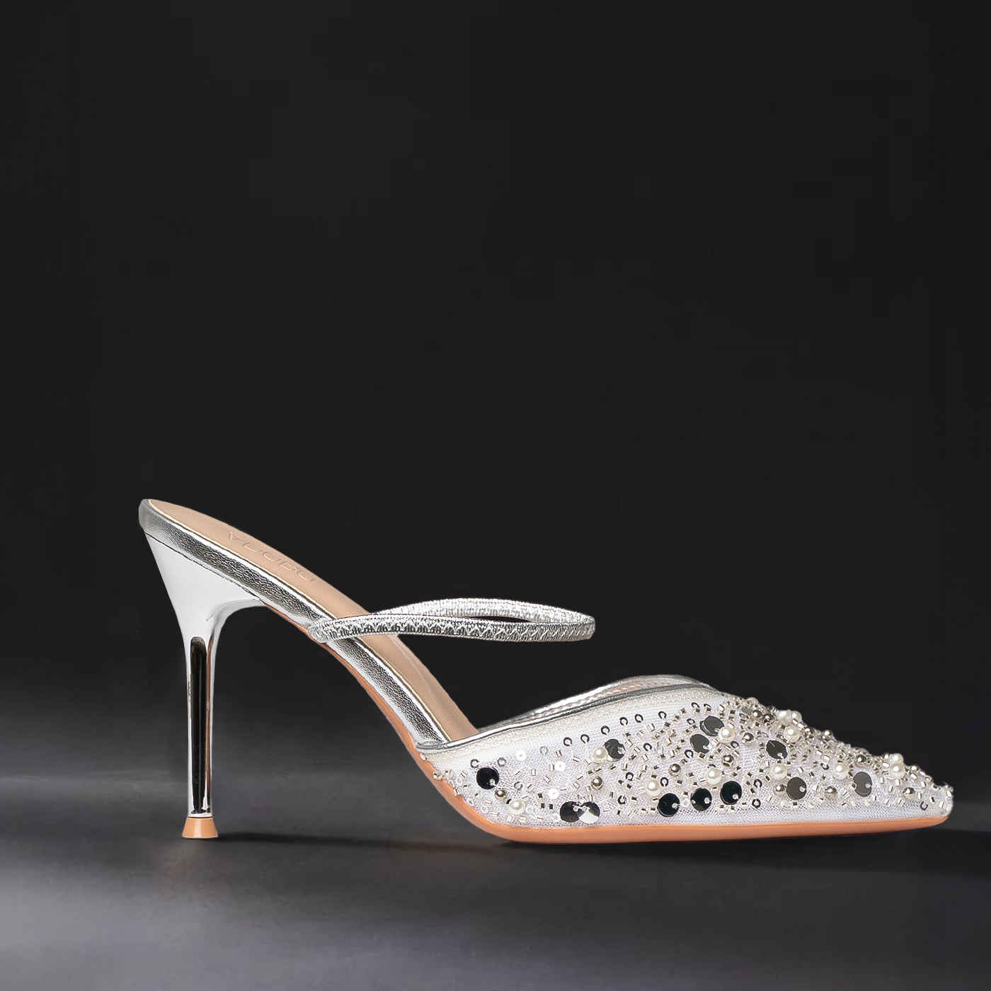 Elevate your evening look with these dazzling Crystal Luxe heels. Designed to steal the spotlight, they feature a pointed toe beautifully adorned with pearls, sequins, and shimmering embellishments that create an elegant, high-glam finish. The sleek twin-strap design and slim stiletto heel add a refined touch, making them the perfect companion for festive nights, weddings, and upscale events.