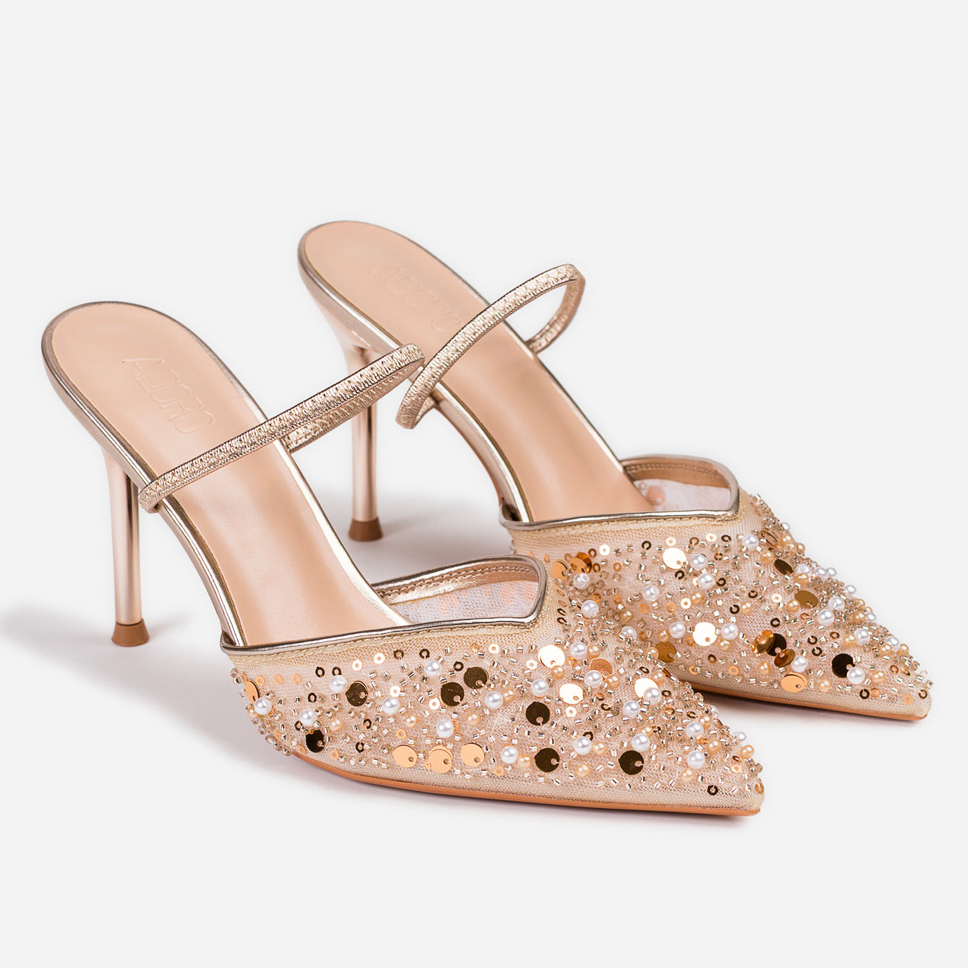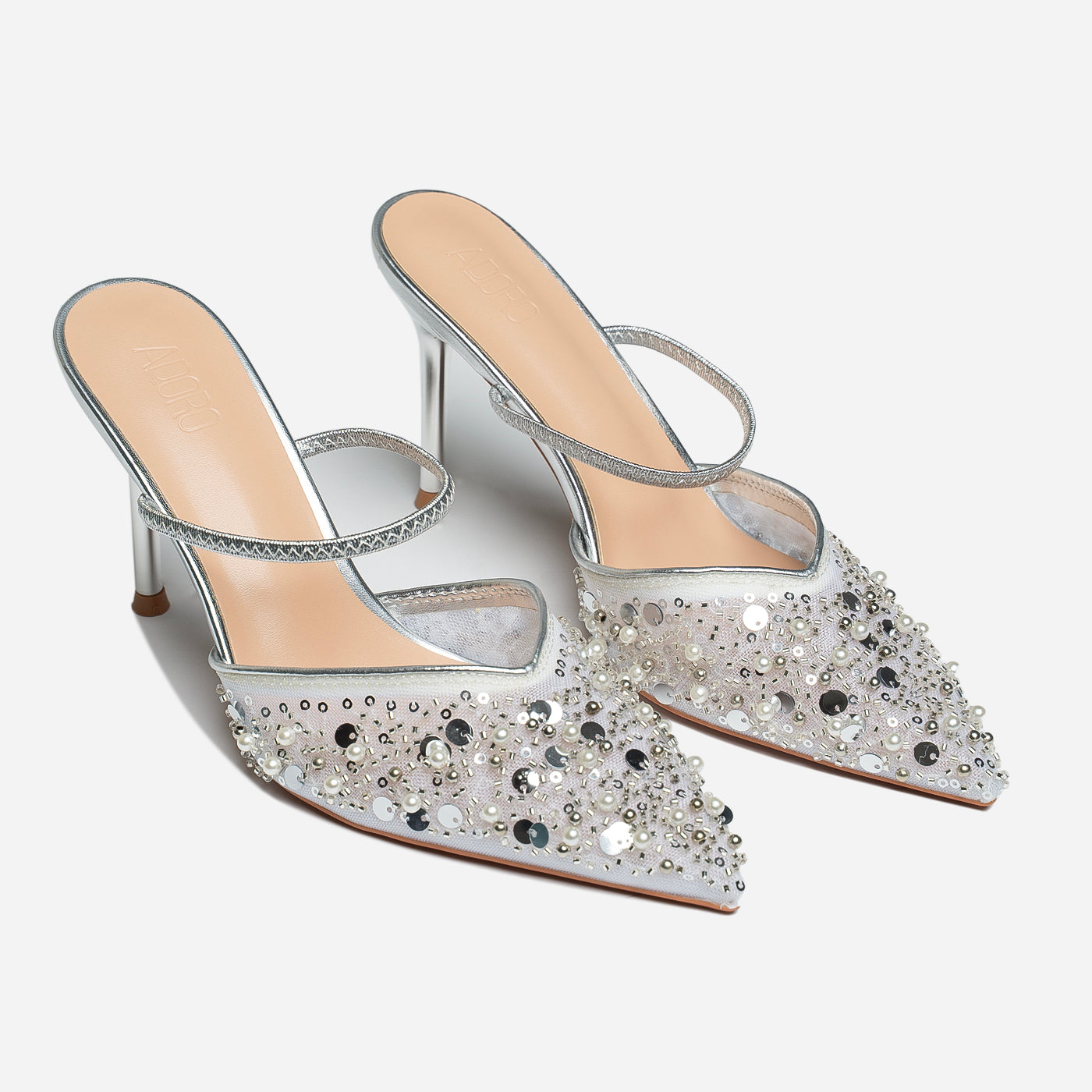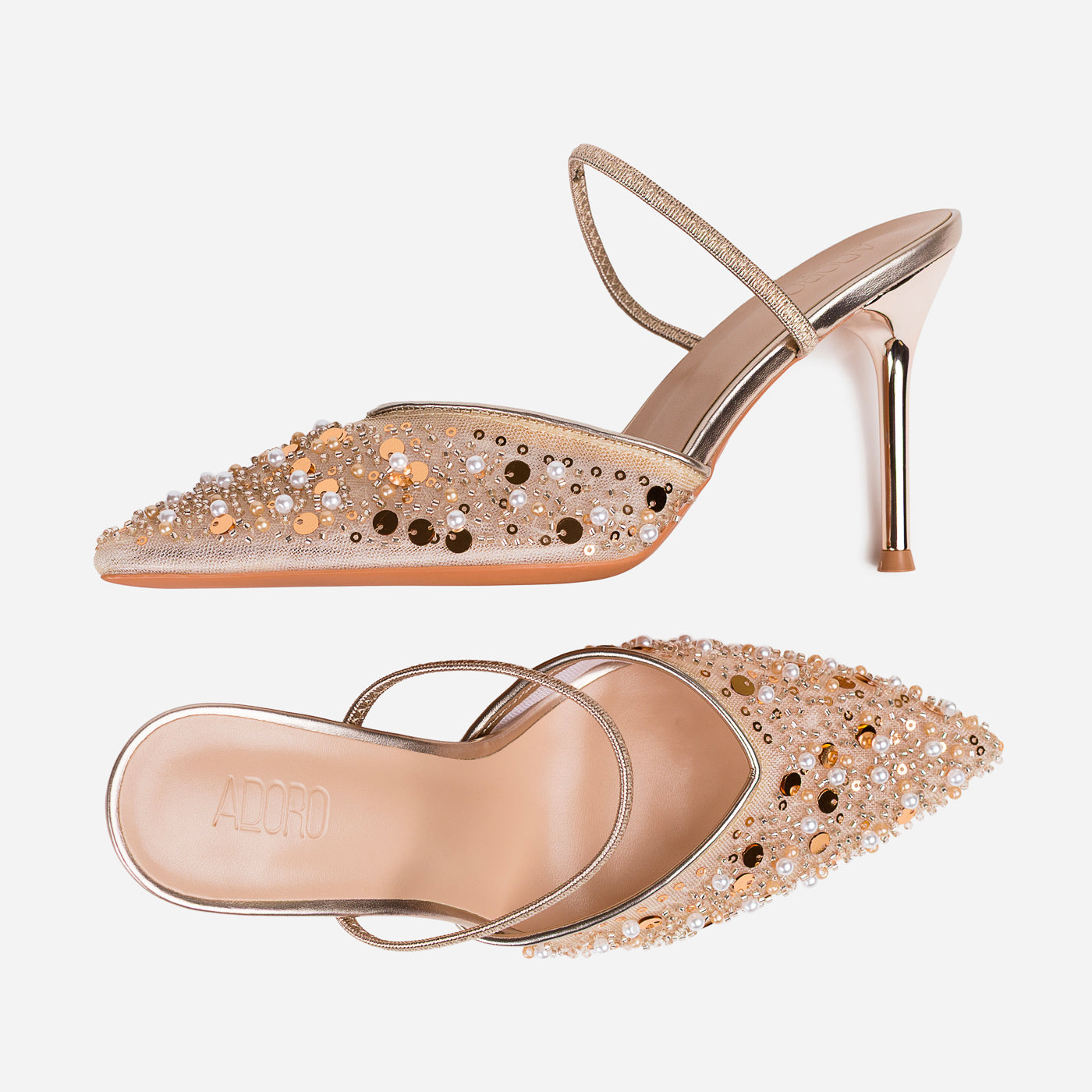 Elevate your evening look with these dazzling Crystal Luxe heels. Designed to steal the spotlight, they feature a pointed toe beautifully adorned with pearls, sequins, and shimmering embellishments that create an elegant, high-glam finish. The sleek twin-strap design and slim stiletto heel add a refined touch, making them the perfect companion for festive nights, weddings, and upscale events.