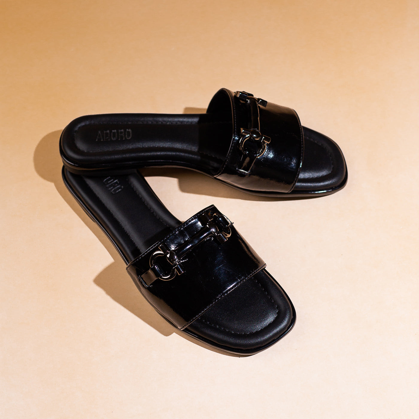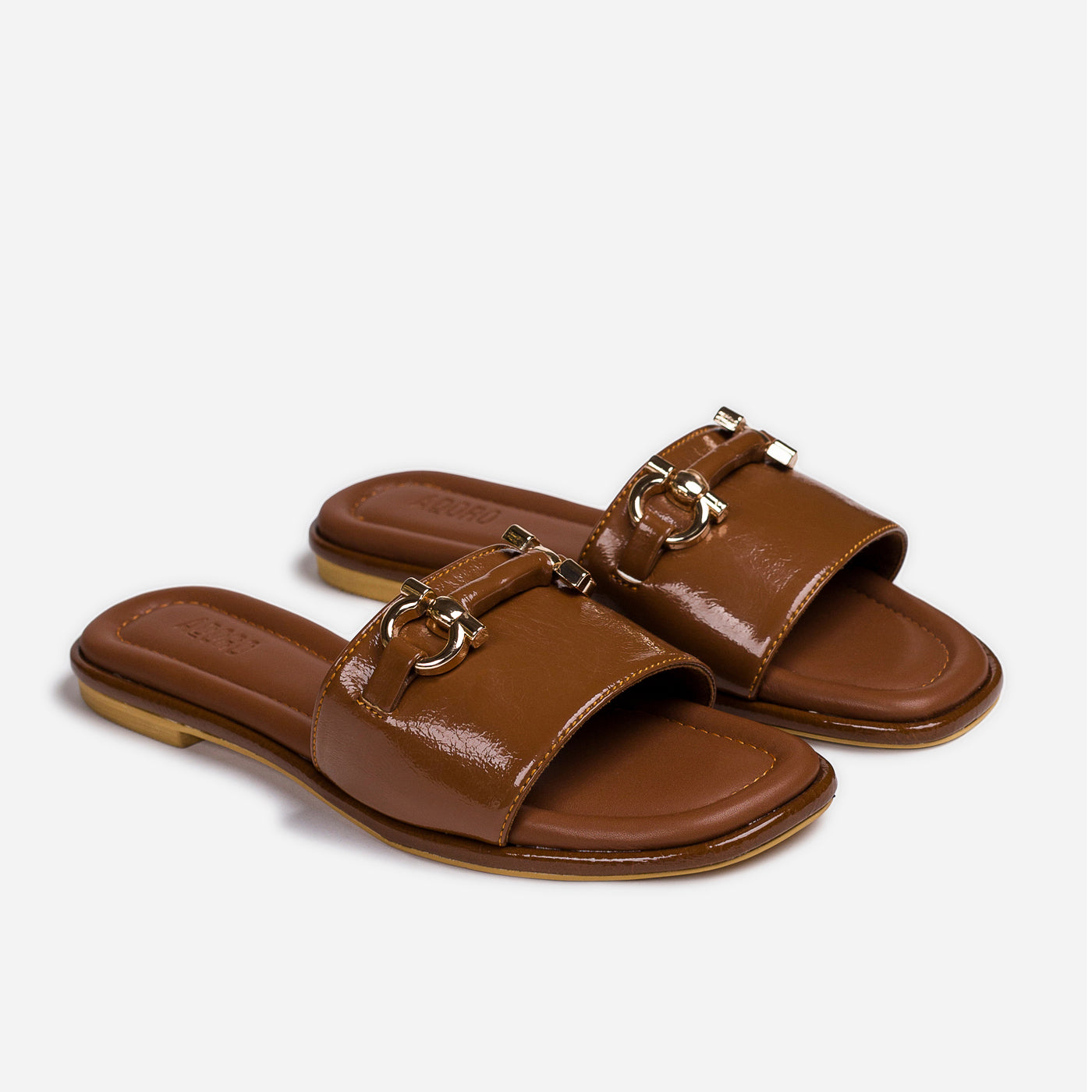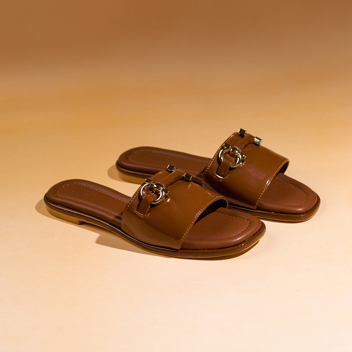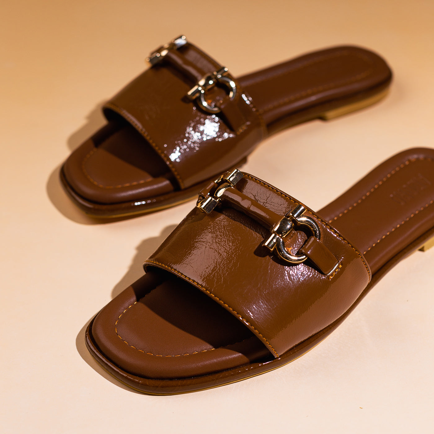 Modern ease meets timeless polish in the Urban Gloss slide. Sculpted from rich patent leather in a deep mocha hue, its sleek silhouette exudes quiet confidence. The gold-tone horse-bit detail gleams against the high-shine finish, lending a touch of equestrian chic to contemporary minimalism. With plush cushioning and clean architectural lines, this piece transitions seamlessly from sunlit strolls to elegant evenings. Urban Gloss — where luxury rests in simplicity, and sophistication walks with ease.