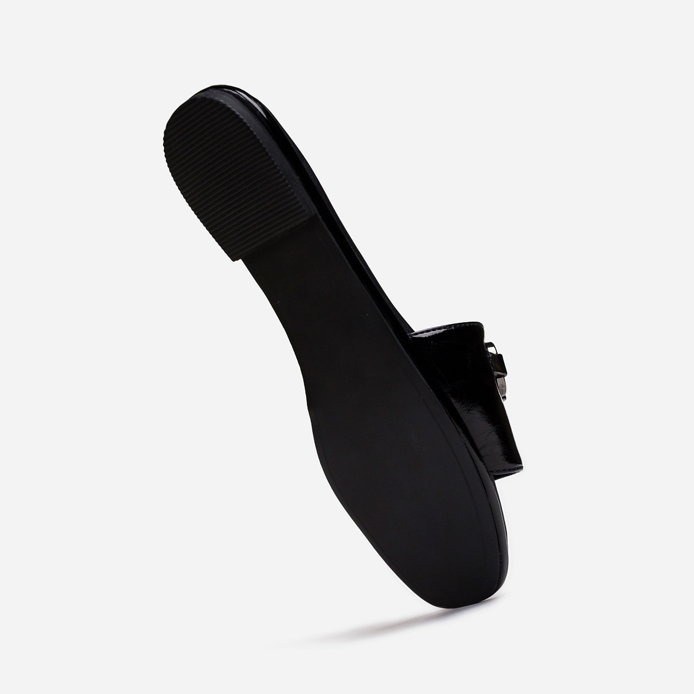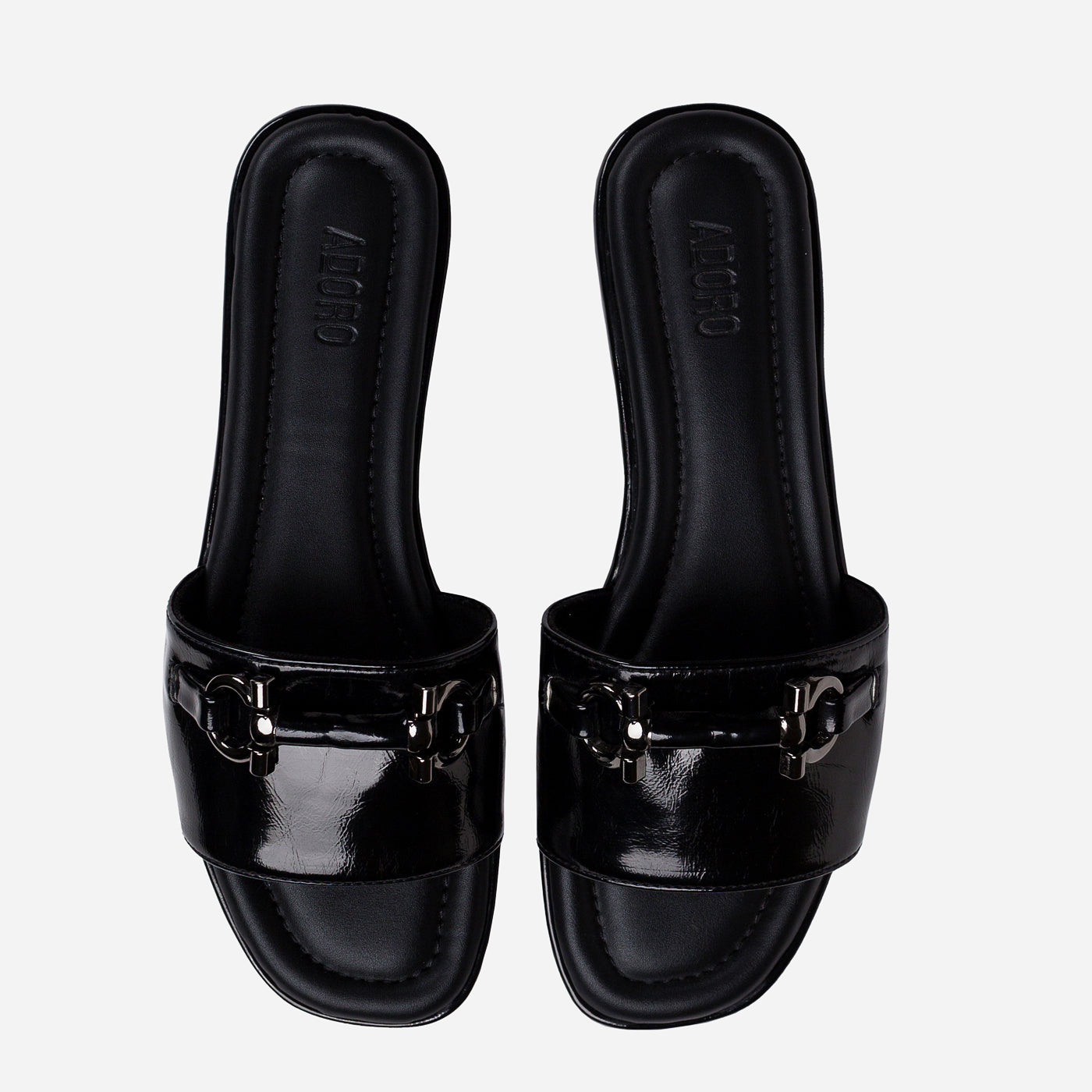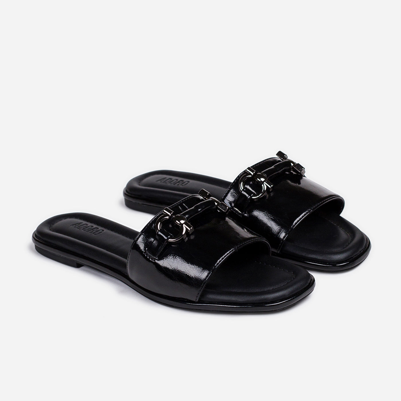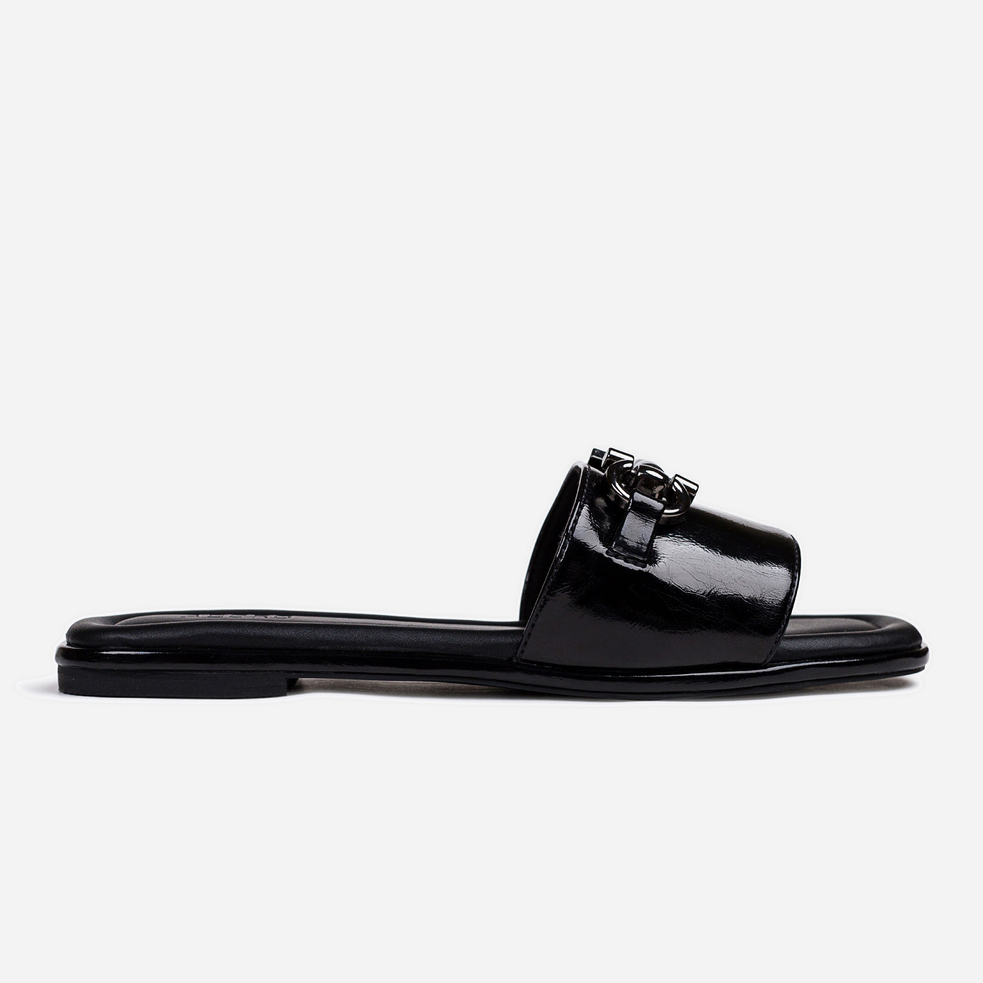 Refined minimalism meets metropolitan edge in the Urban Gloss slide. Crafted in high-shine black patent leather, it reflects sophistication in every step. The polished silver hardware adds a sculptural accent, balancing strength with elegance. A cushioned footbed ensures comfort without compromise, while the streamlined silhouette embodies effortless luxury. Understated yet magnetic, Urban Gloss captures the art of quiet confidence — a modern essential for the woman who moves with purpose and poise.