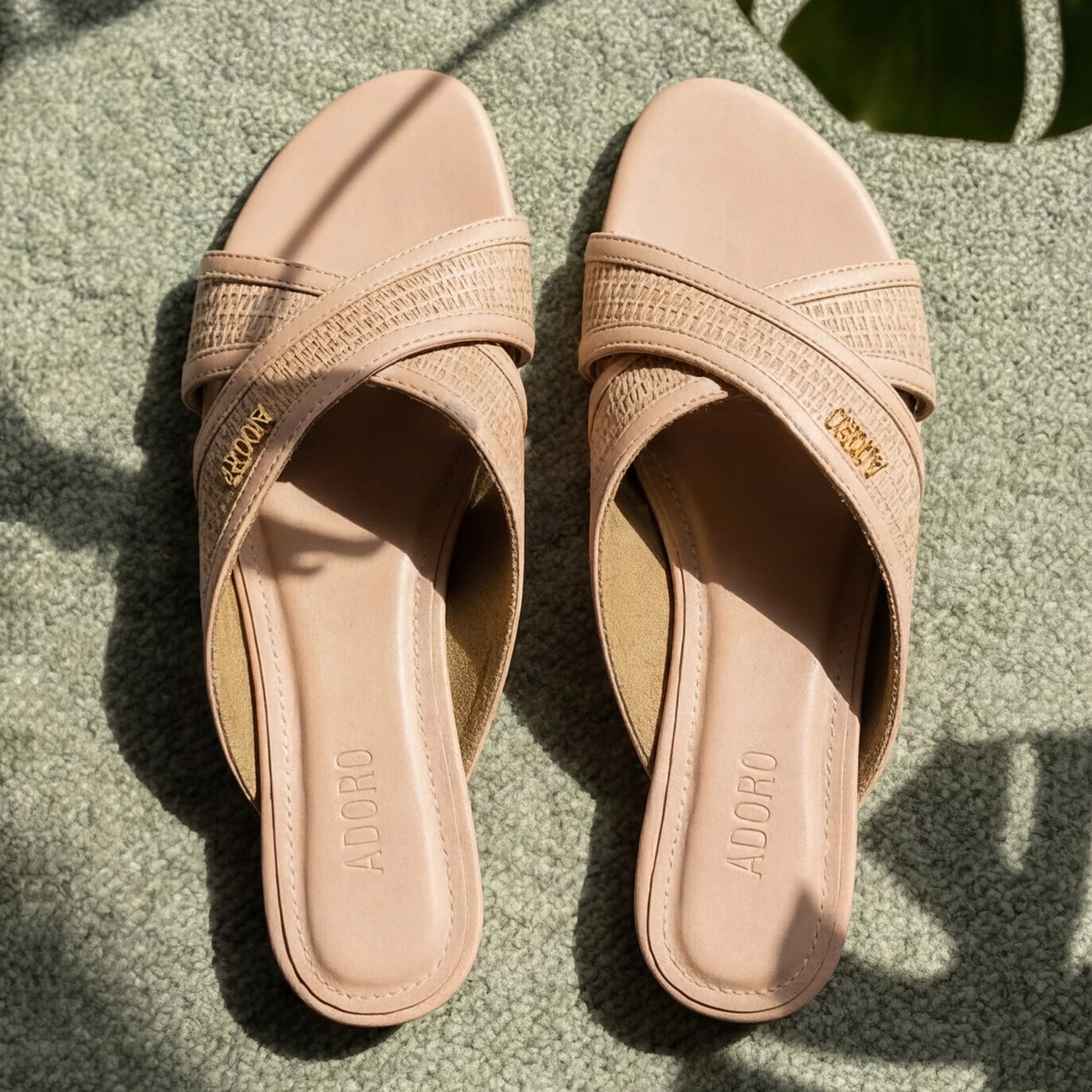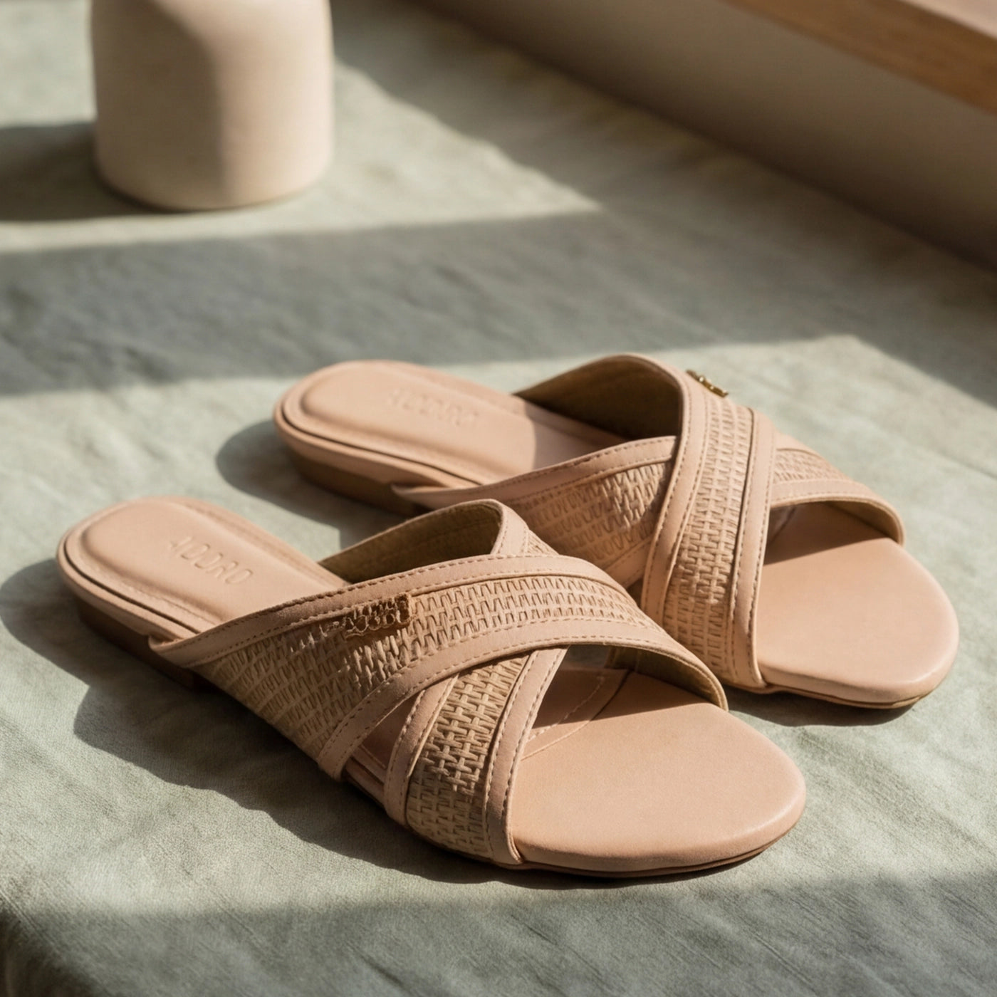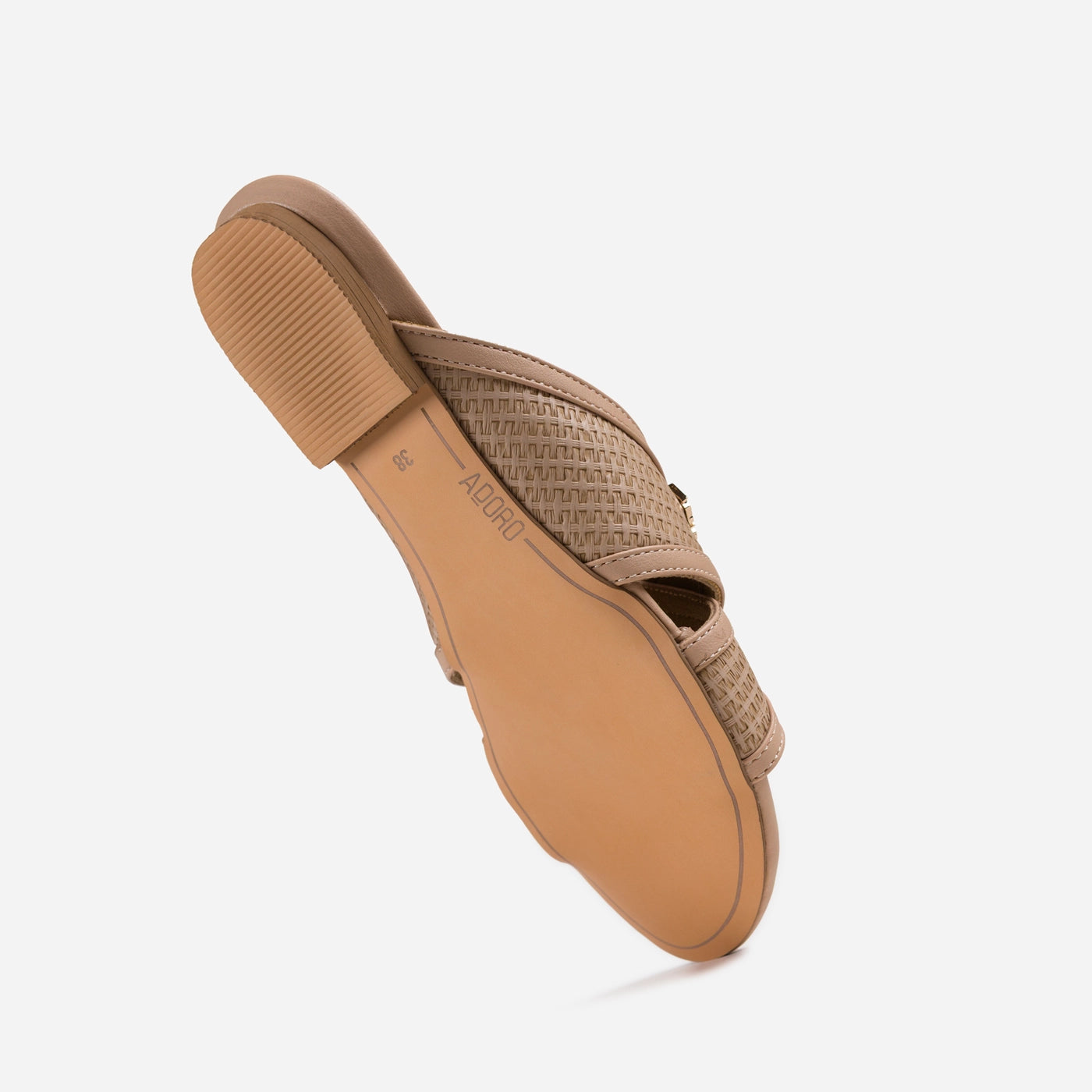 These chic slides reveal the meticulous woven texture from above, showcasing the crossover strap design in soft beige leather. The basketweave pattern creates visual and tactile interest, while gold tone hardware adds luxurious finishing. The cushioned footbed provides superior comfort. Perfect for pairing with relaxed summer outfits, casual occasions, and everyday wear that demands understated elegance with artisan appeal.