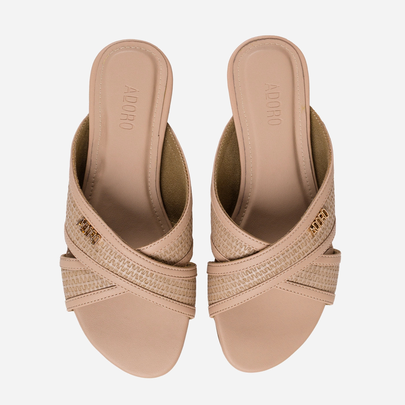 These sophisticated slides feature soft beige with intricate woven texture on the crossover straps. The basketweave pattern creates dimensional interest, while the smooth footbed ensures all day comfort. Gold tone logo detailing adds a refined accent. Perfect for casual outings, summer days, and moments that call for textured elegance with relaxed sophistication.