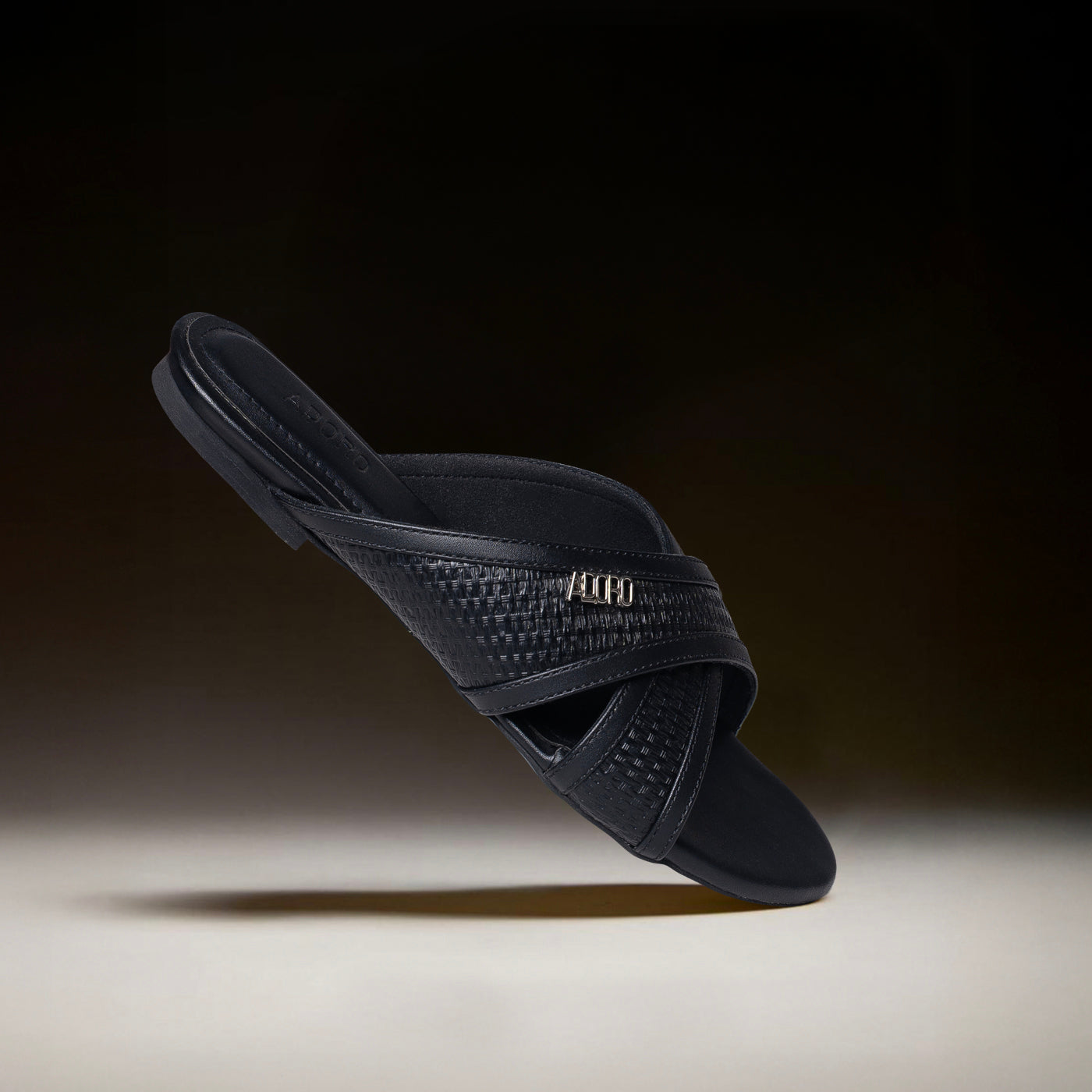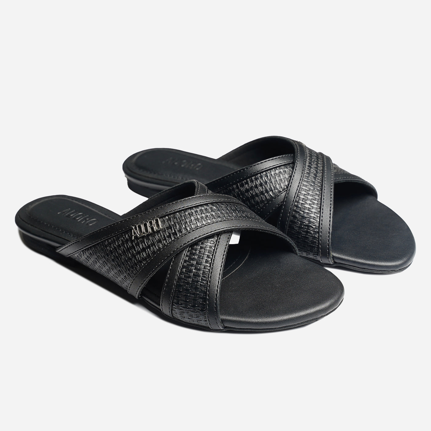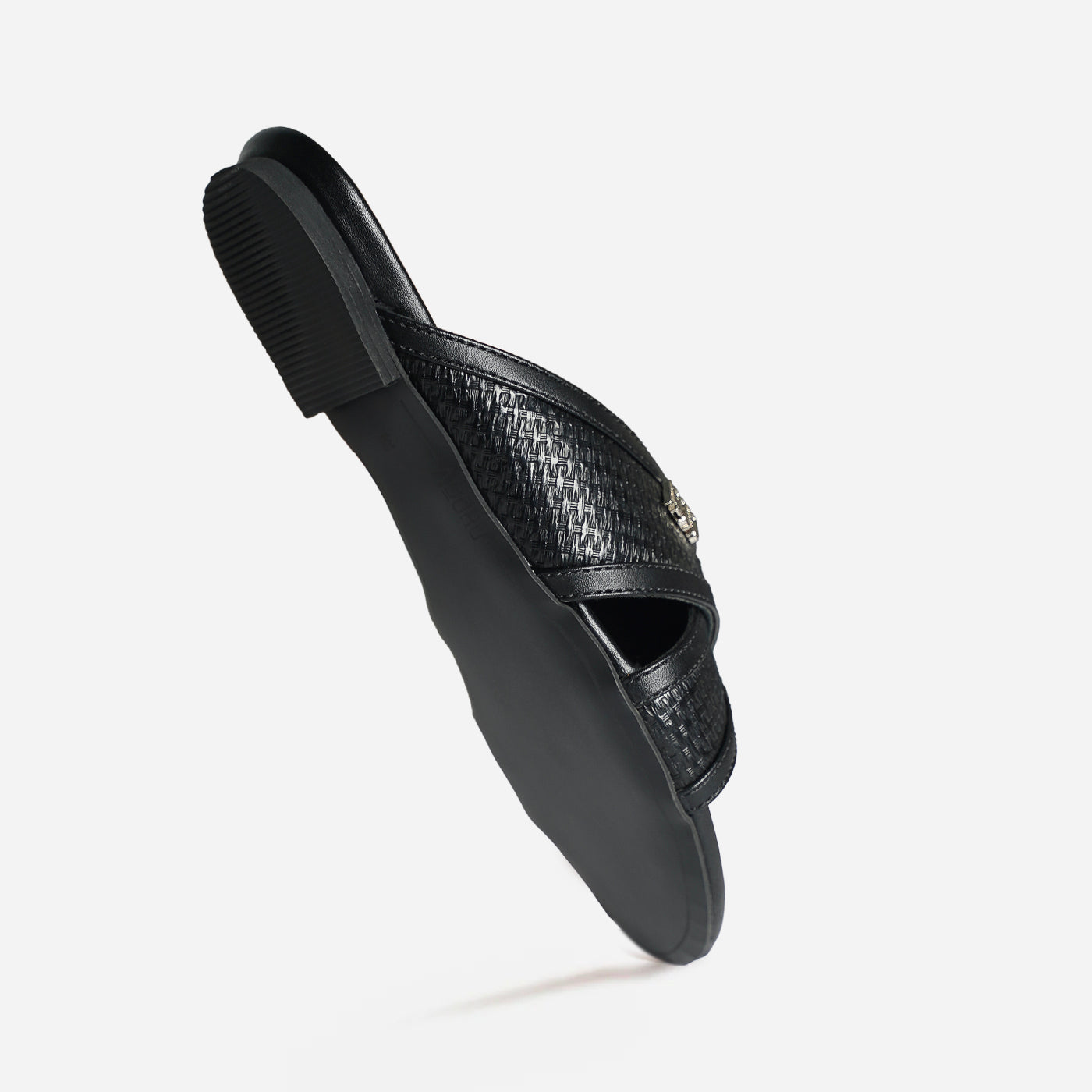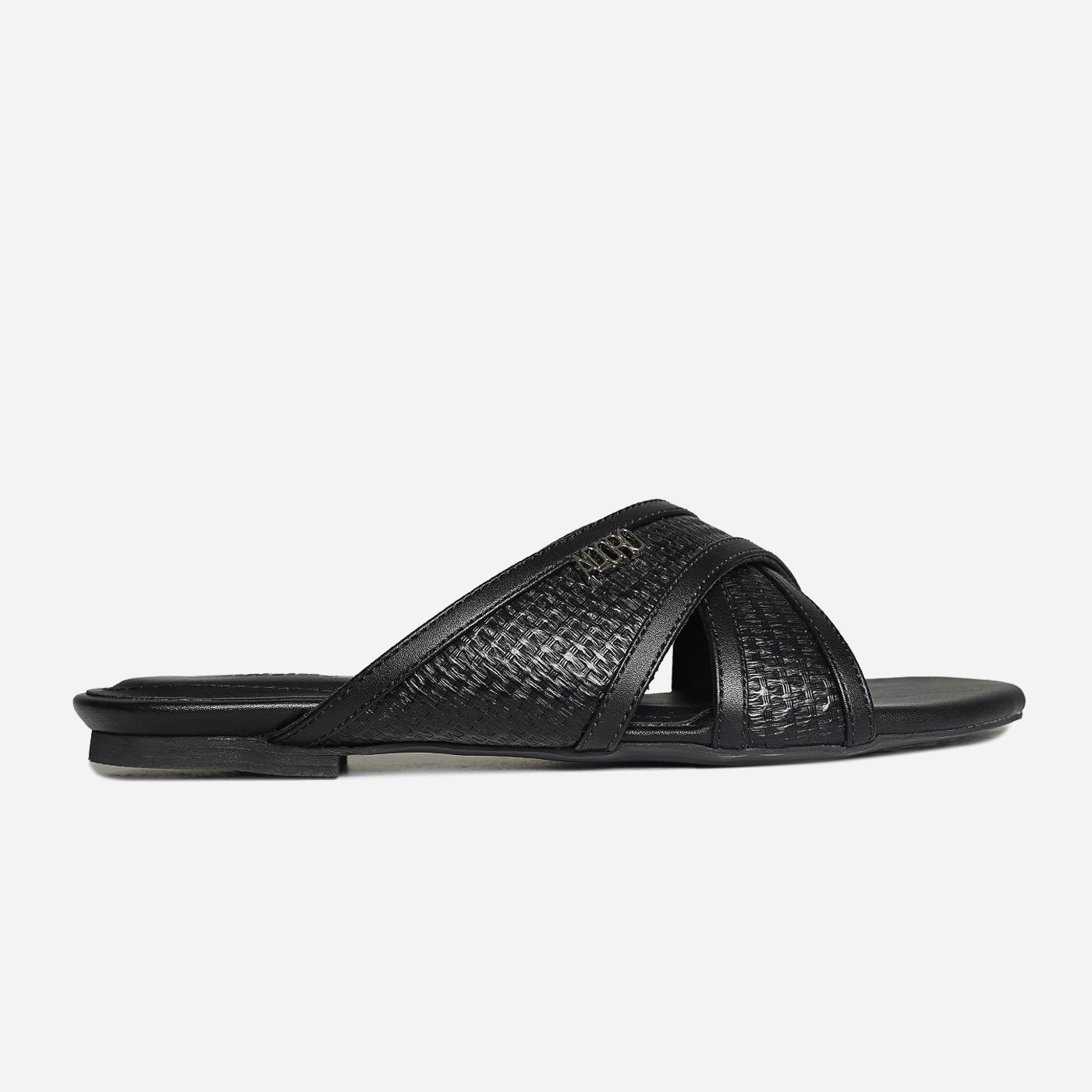 This elegant slide showcases rich black with detailed woven texture across the crossover straps. The intricate basketweave pattern adds tactile depth, while the smooth construction ensures comfortable wear. The flat sole with subtle branding maintains refined simplicity. Ideal for elevating casual ensembles with artisan-inspired details and contemporary style.